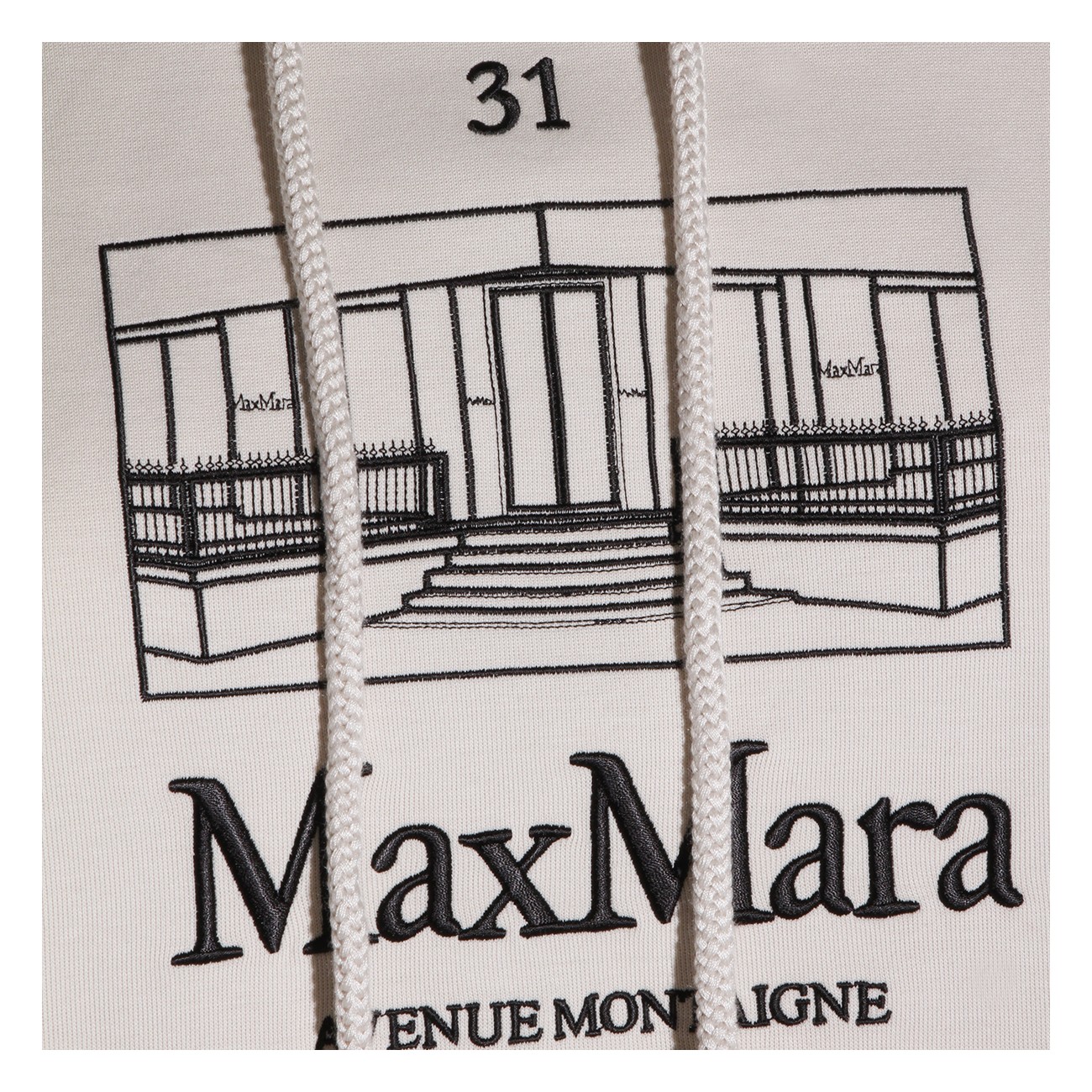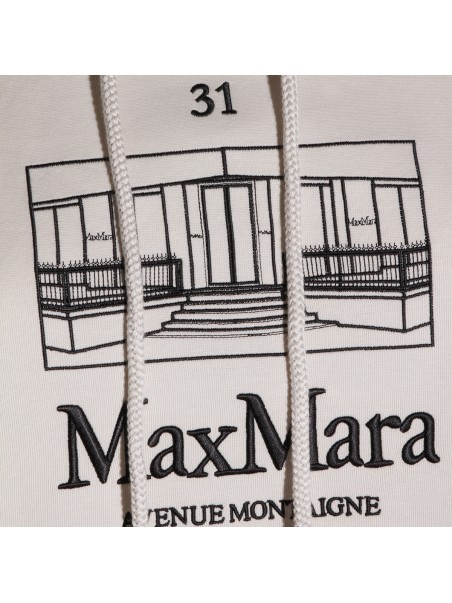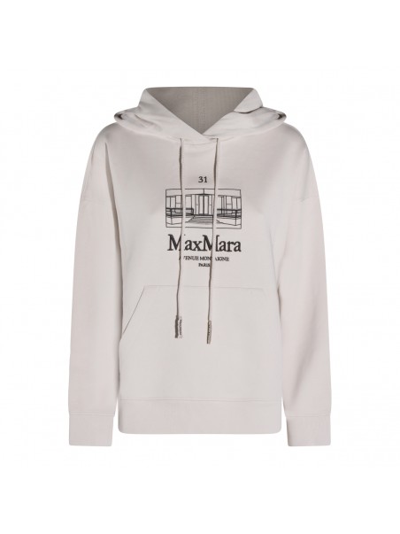 White cotton sweatshirt from S Max Mara featuring long sleeves, hood, frontal logo print and kangaroo pocket.