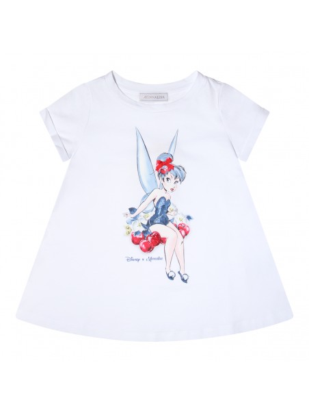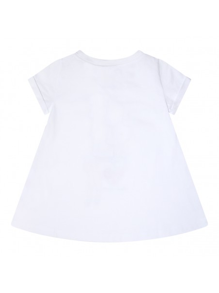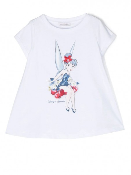 White cotton t-shirt from Monnalisa featuring round collar, short sleeves, flared hem and frontal fair print.