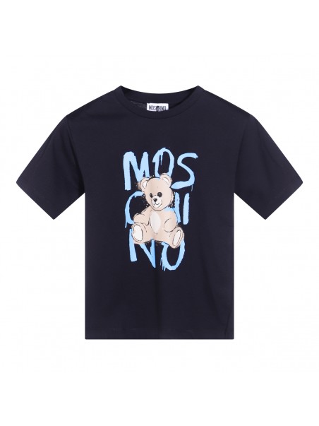 Black cotton t-shirt from Moschino featuring round collar, short sleeves, print and regular vestibility.