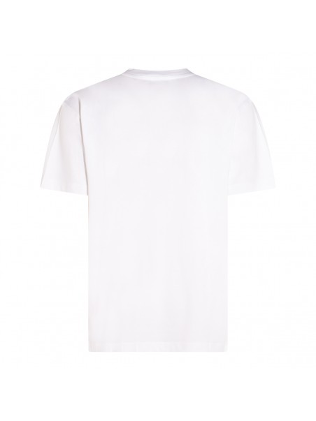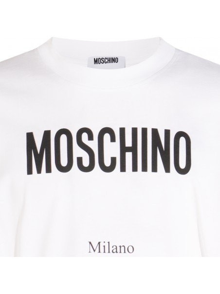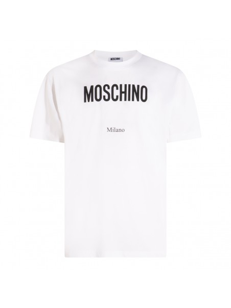 White cotton t-shirt from Moschino featuring round collar, short sleeves and frontal print.