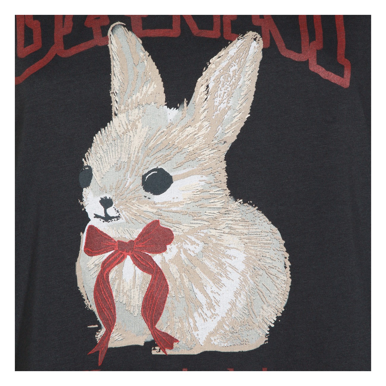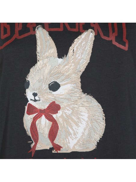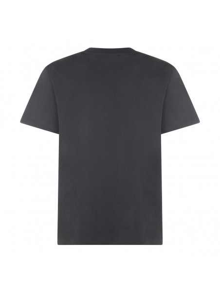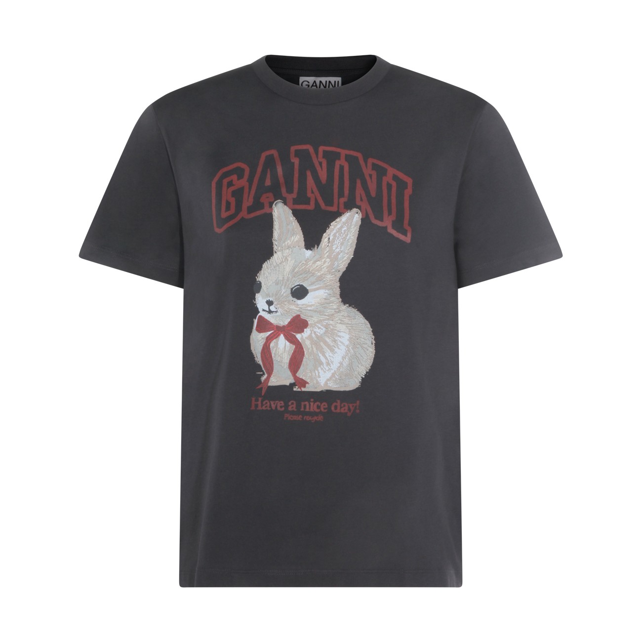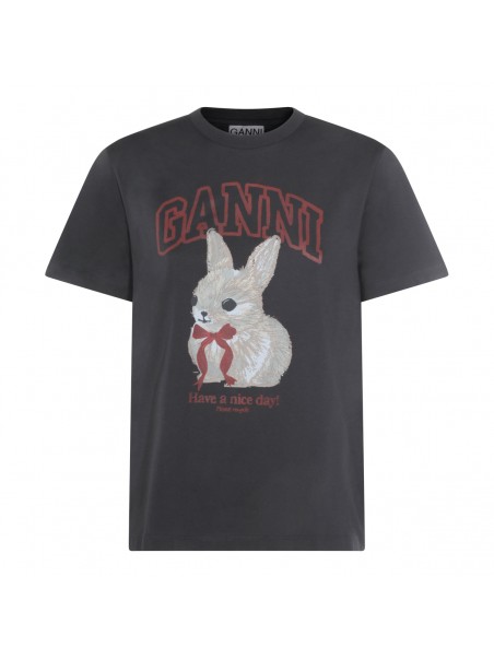 Black cotton t-shirt from Ganni featuring crew neckline, short sleeves, frontal stamp and regular vestibility.