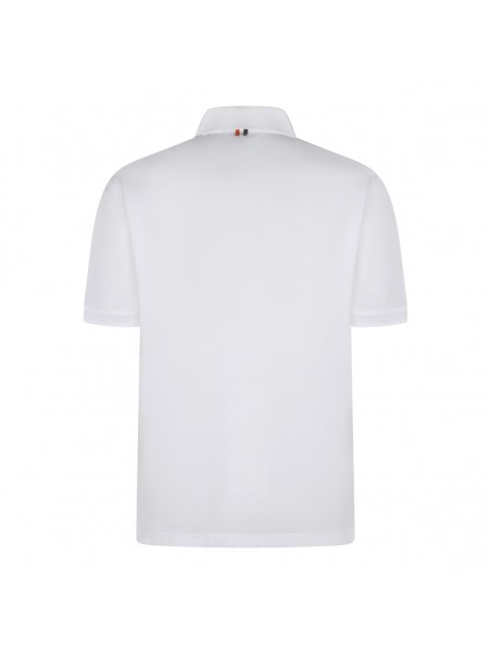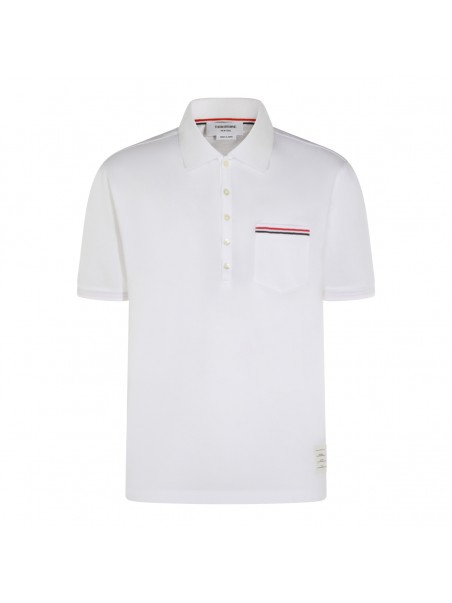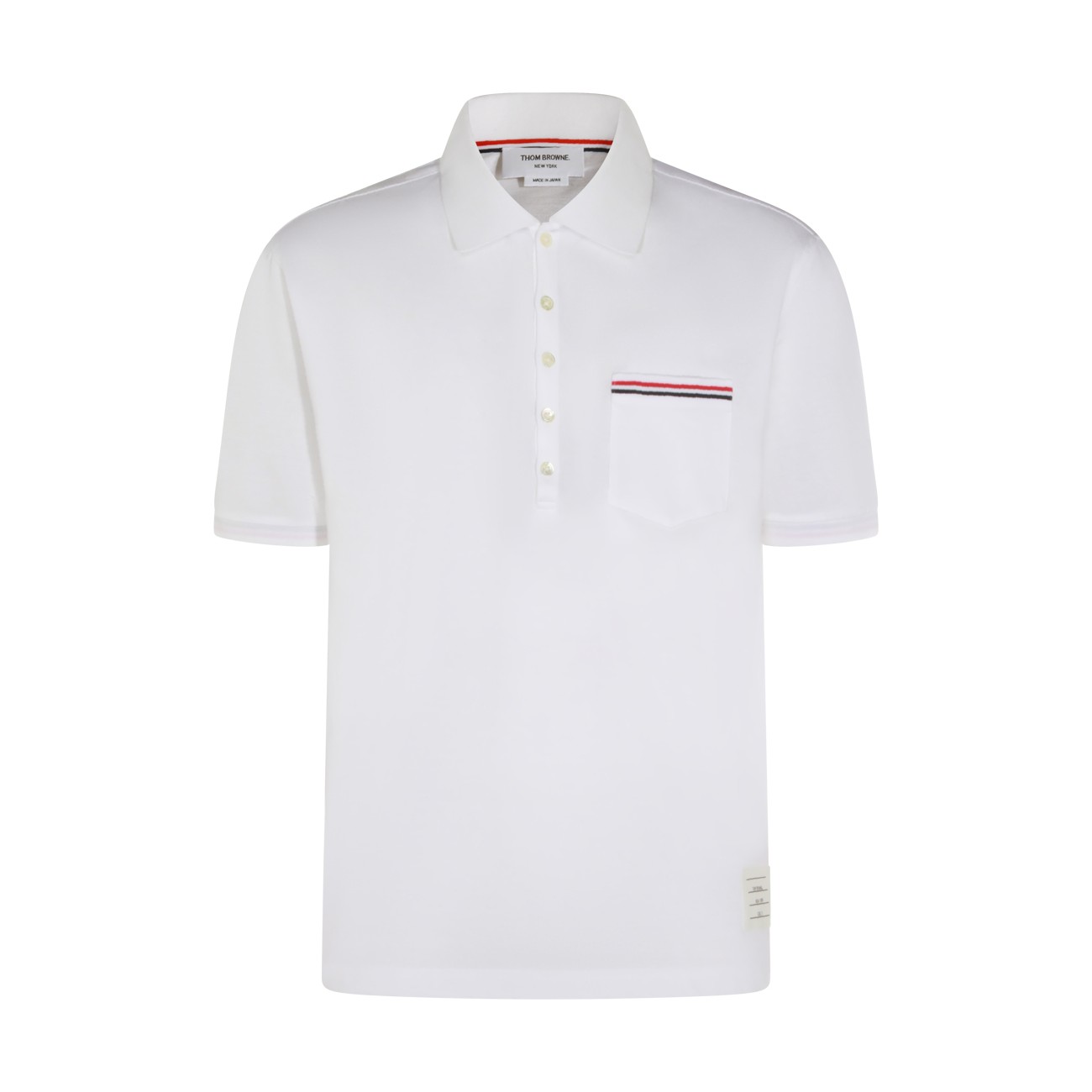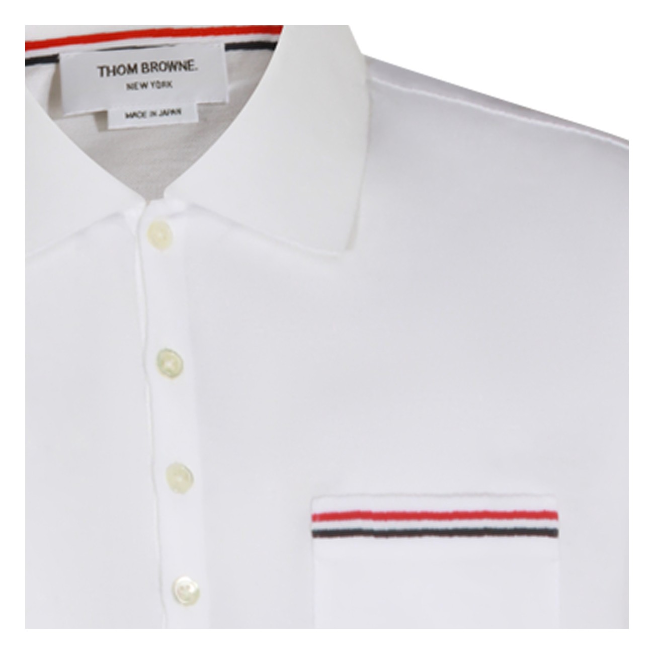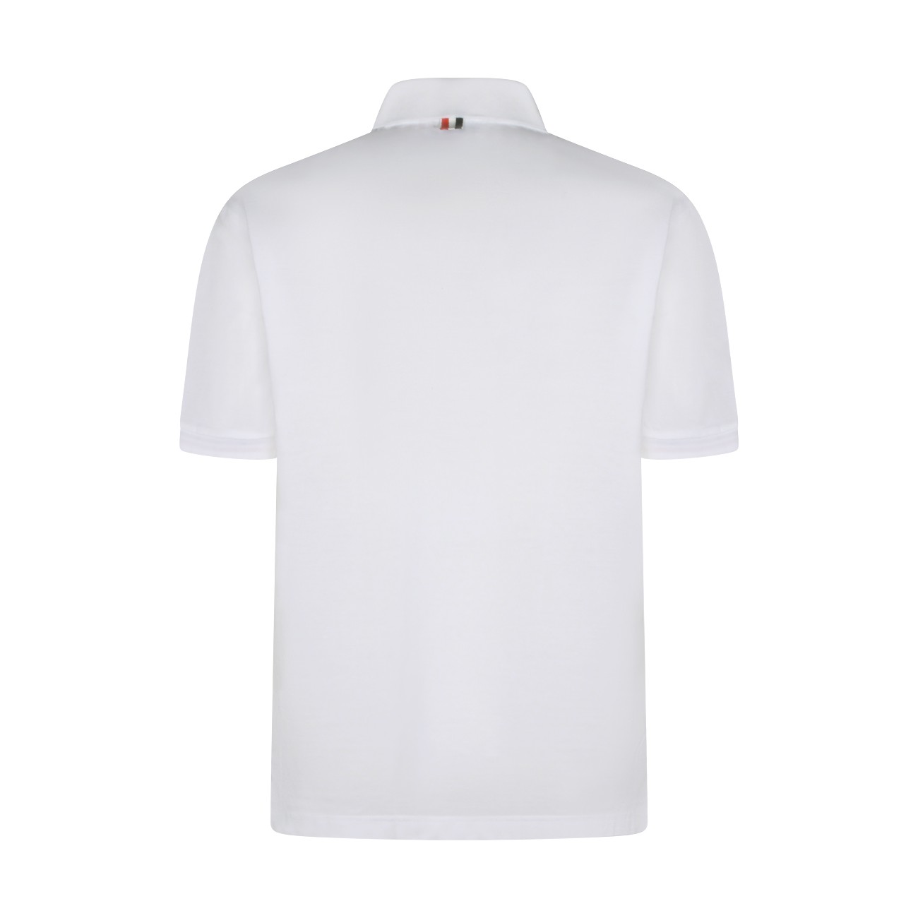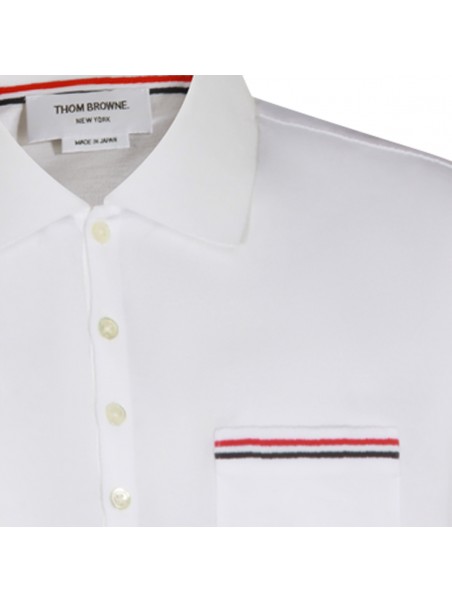 White cotton polo shirt from Thom Browne featuring classic collar, buttons fastening, short sleeves, pocket with stripes detail and regular vestibility.