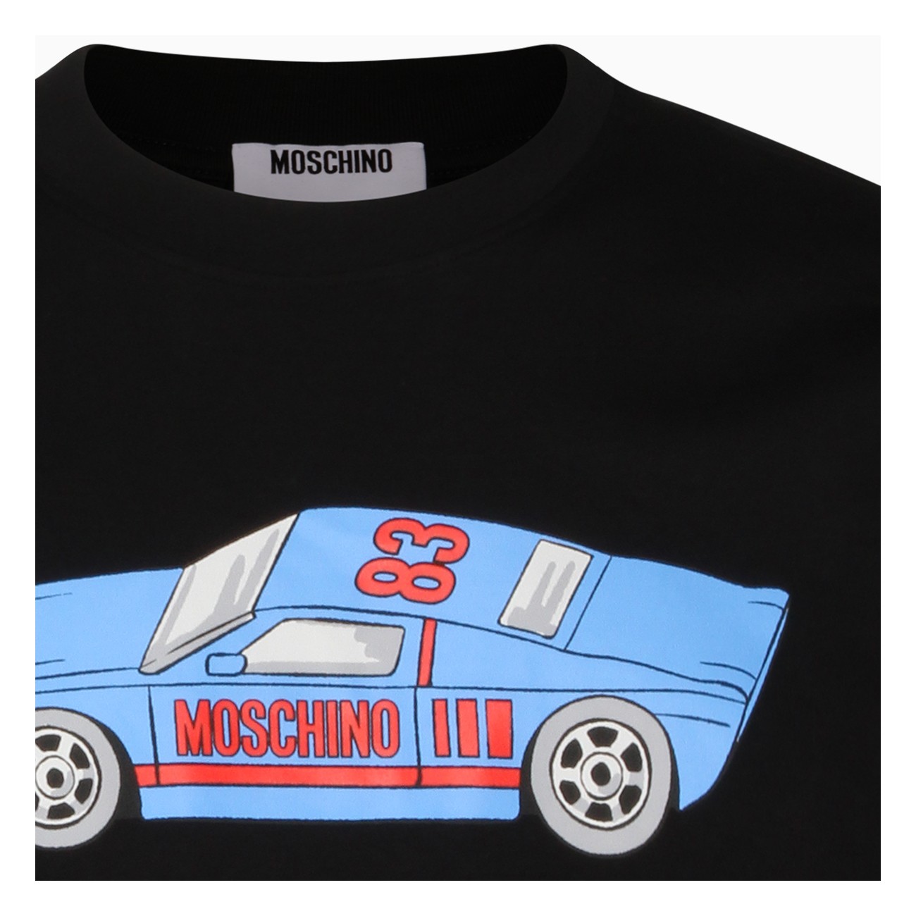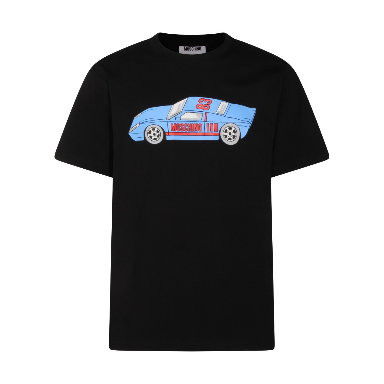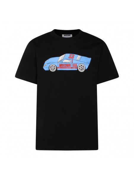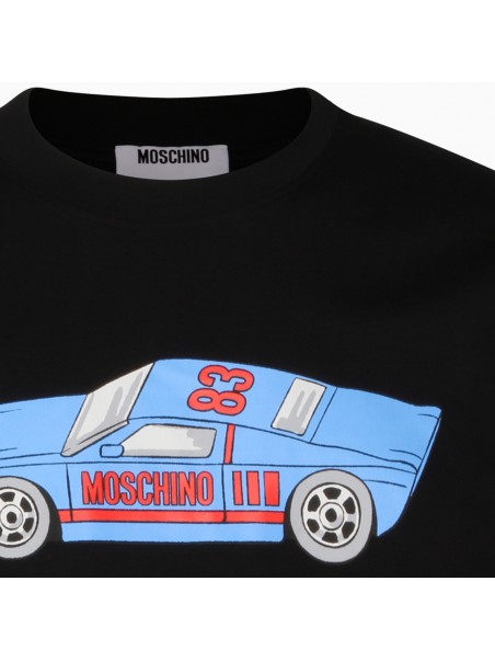 Black cotton t-shirt from Moschino featuring crew neck, short sleeves, frontal stamp and regular vestibility.