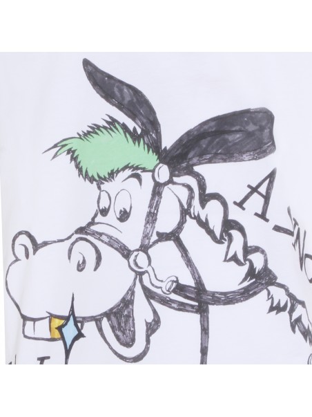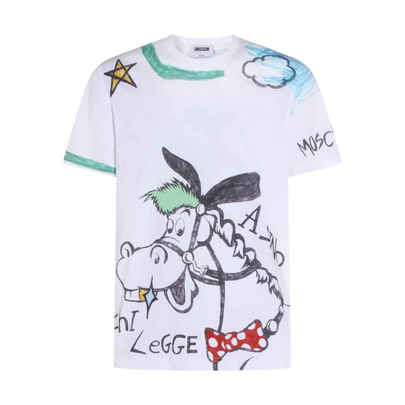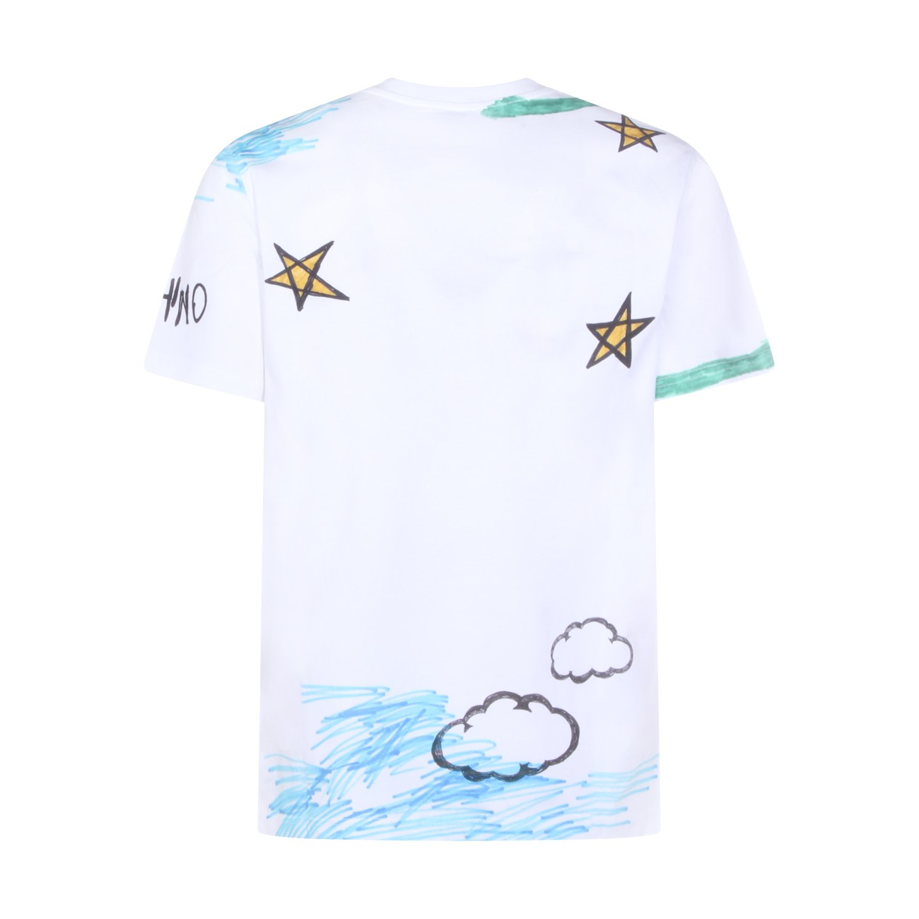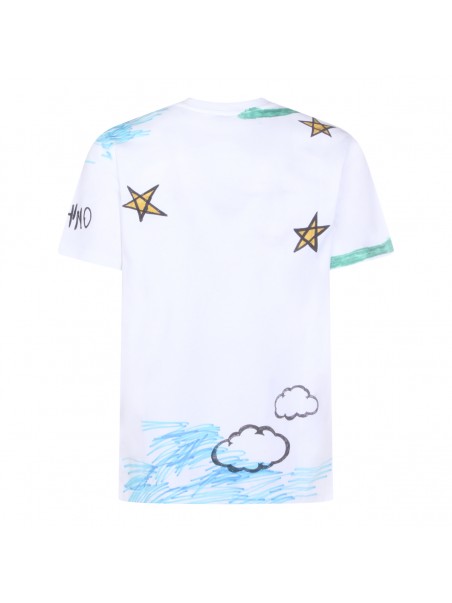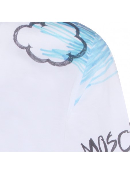 White cotton t-shirt from Moschino featuring crew neck, short sleeves, all over print and regular vestibility.