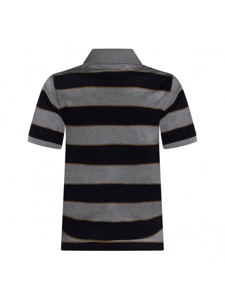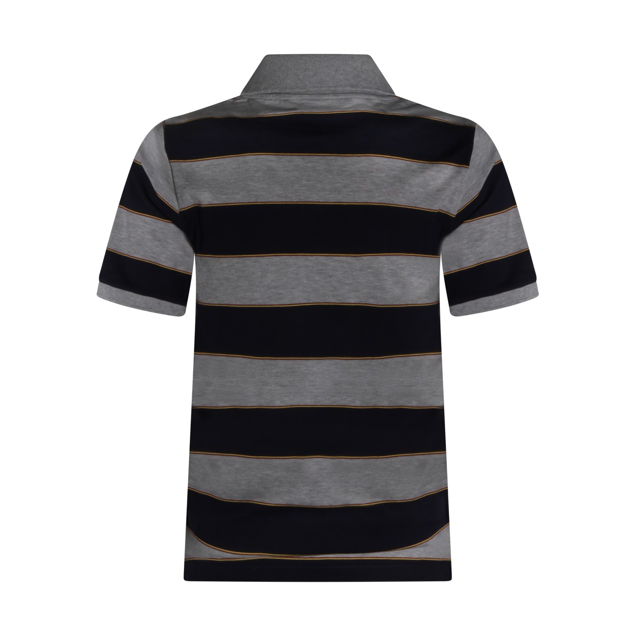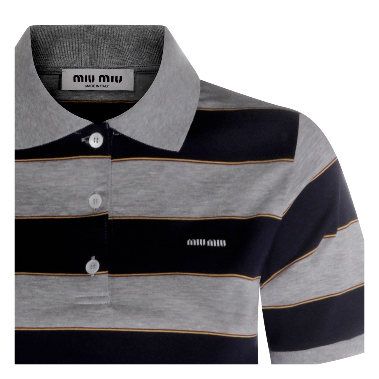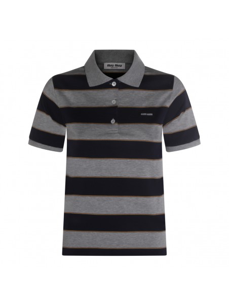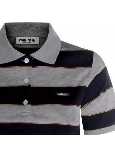 Blue and grey cotton polo shirt from Miu Miu featuring regular collar, buttons fastening, short sleeves, all over stripes pattern, frontal logo and regular vestibility.
