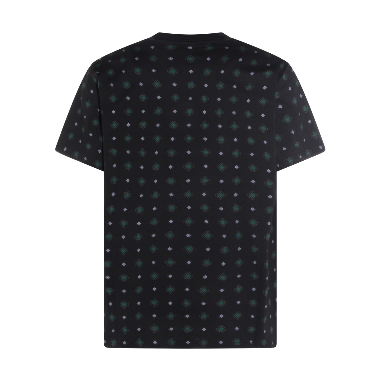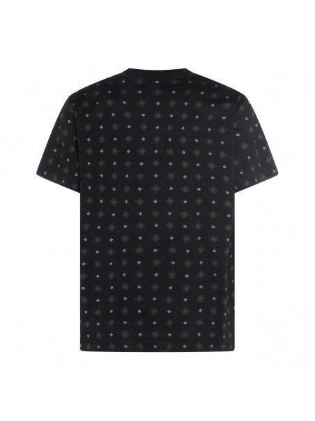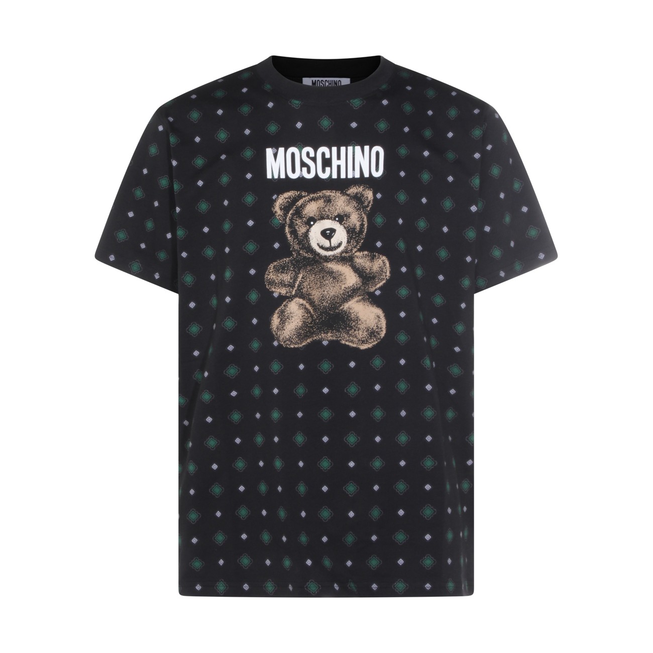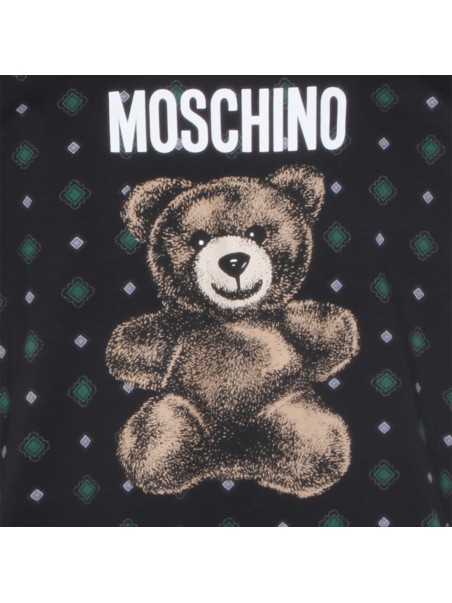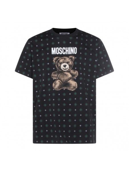 Black cotton t-shirt from Moschino featuring crew neck, short sleeves, all over stamp and regular vestibility.