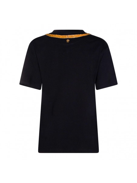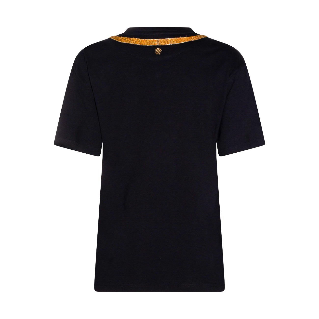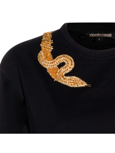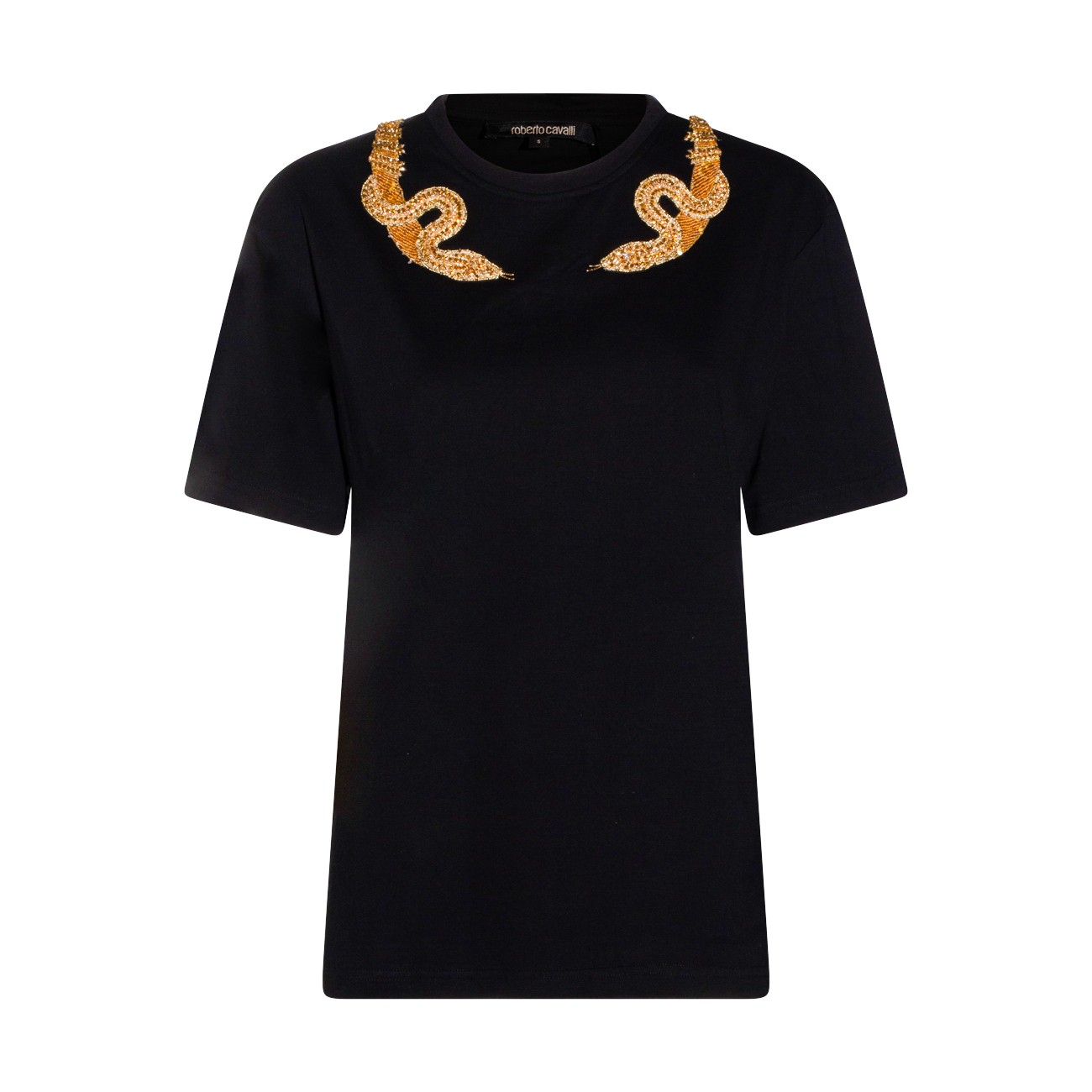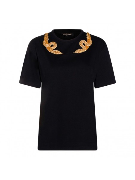 Black cotton t-shirt from Roberto Cavalli featuring crew neck, short sleeves, golden embroidery and regular vestibility.