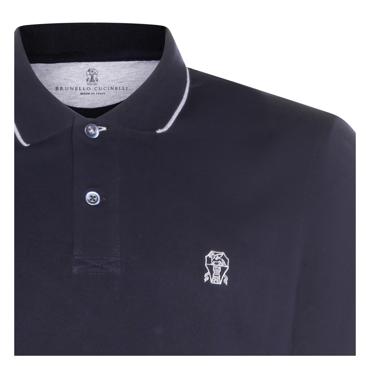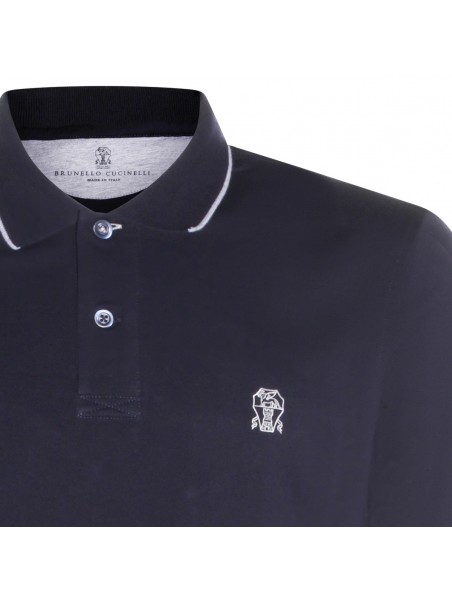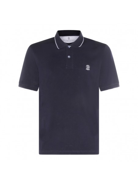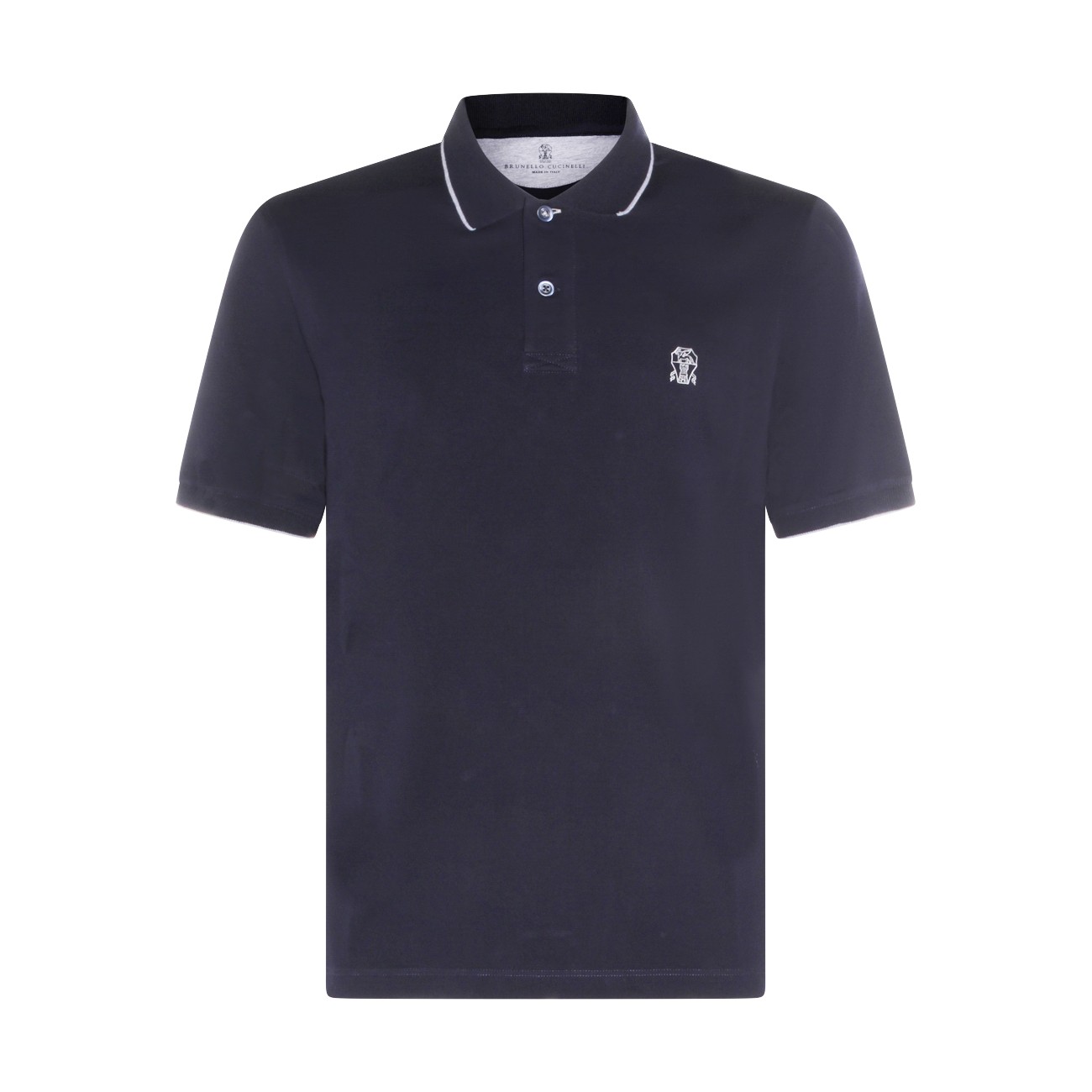 Navy cotton polo shirt from Brunello Cucinelli featuring regular collar, buttons fastening, short sleeves, frontal embroidered logo and regular vestibility.