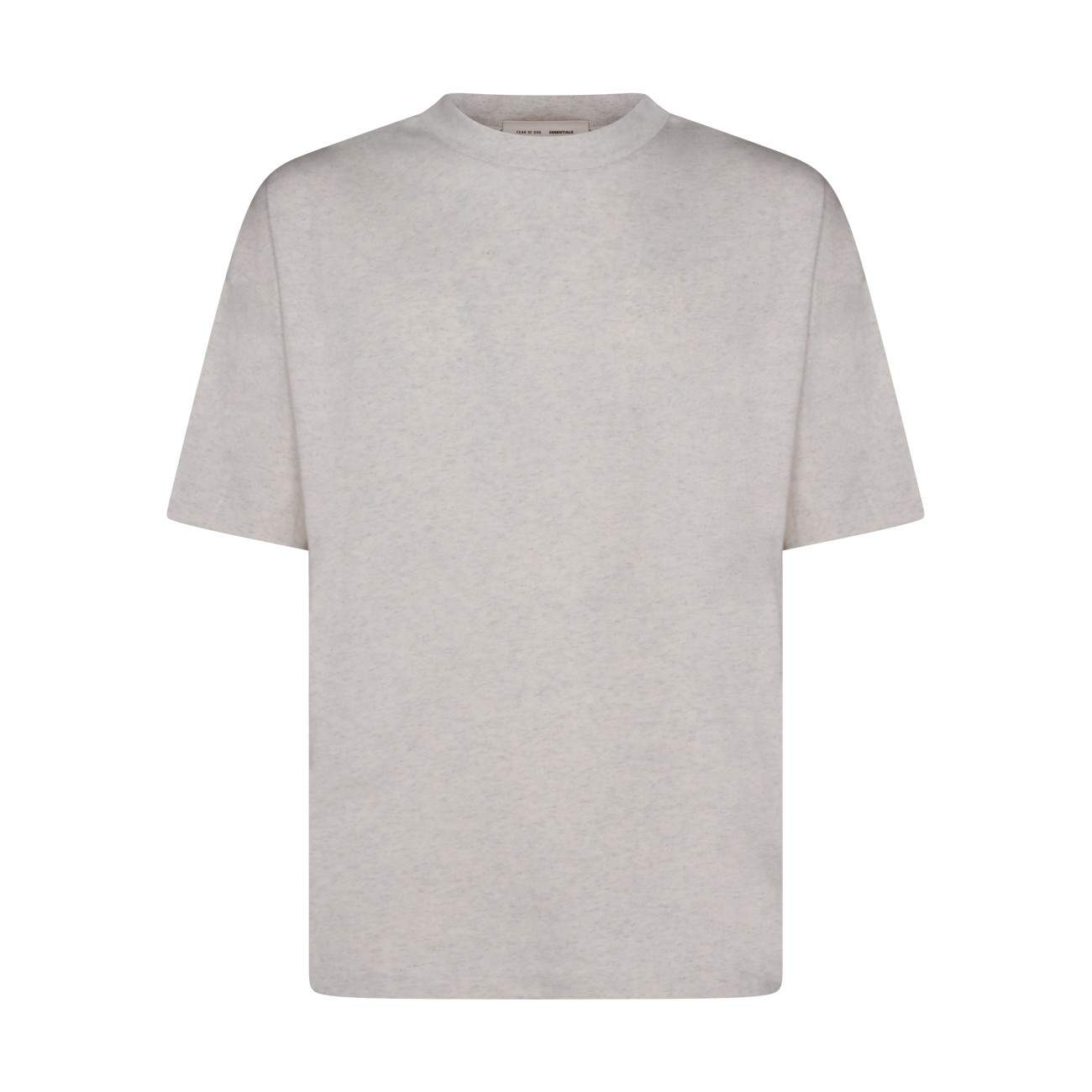 Beige cotton t-shirt from Fear Of God Essentials featuring rib-knit crewneck, short sleeves, embroidered script logo and regular fit.