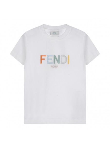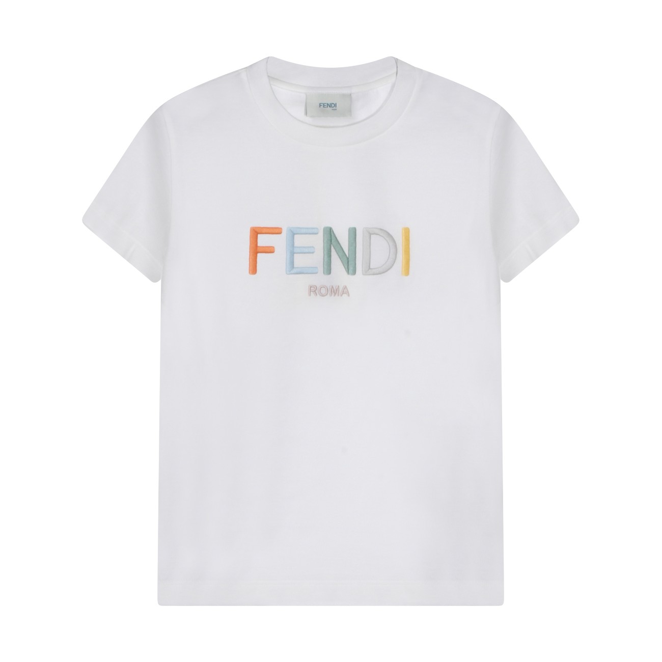 White cotton Logo T-Shirt from Fendi Kids featuring round neck, short sleeves, straight hem and logo detail at front.