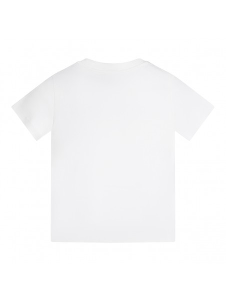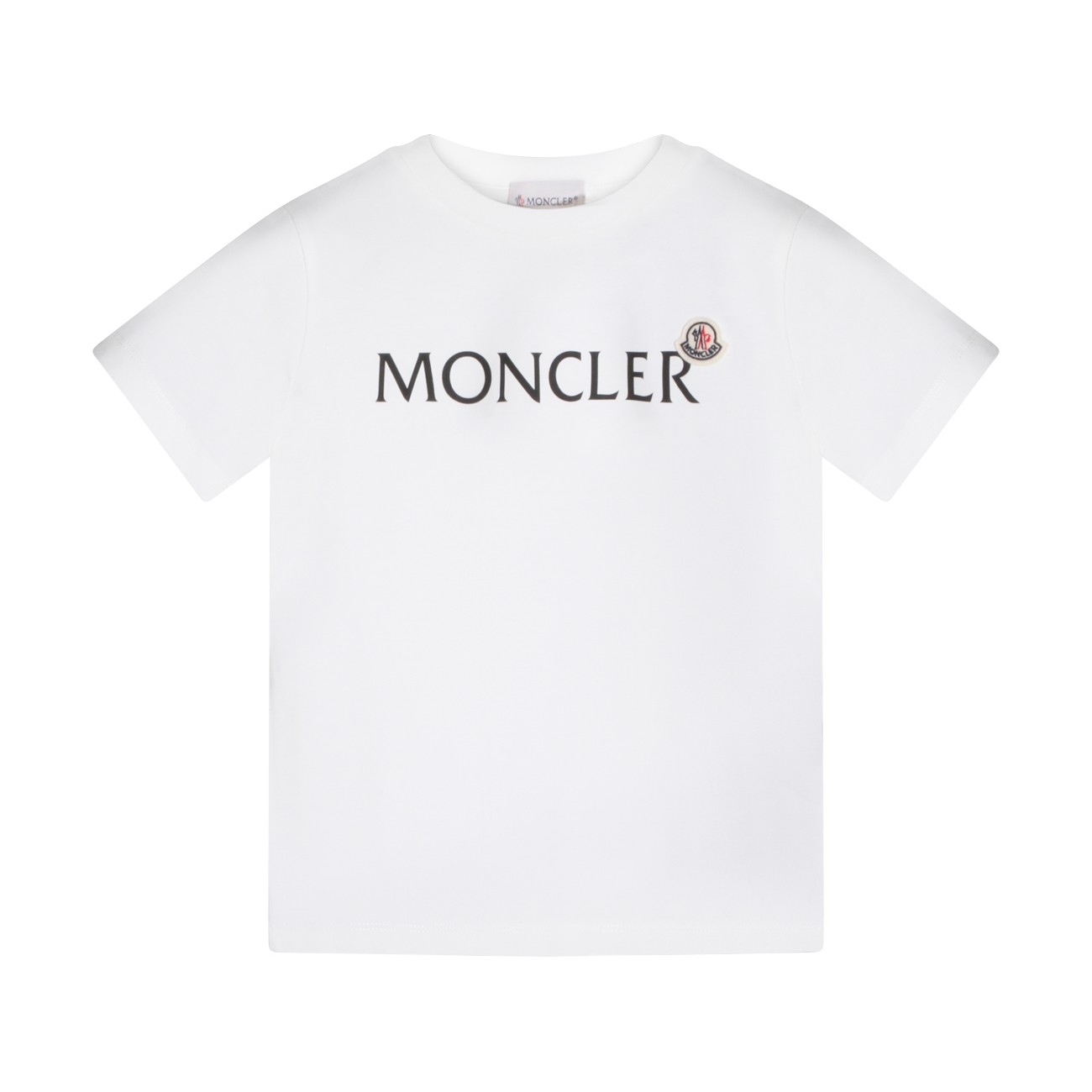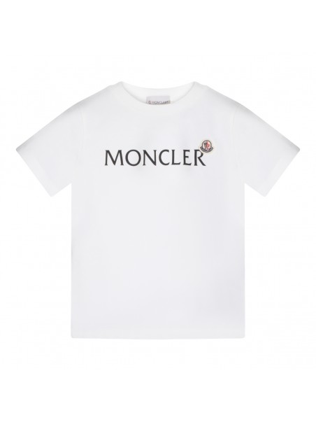 White cotton T-Shirt from Moncler Kids featuring short sleeves, round neck, straight hem and logo detail at front.