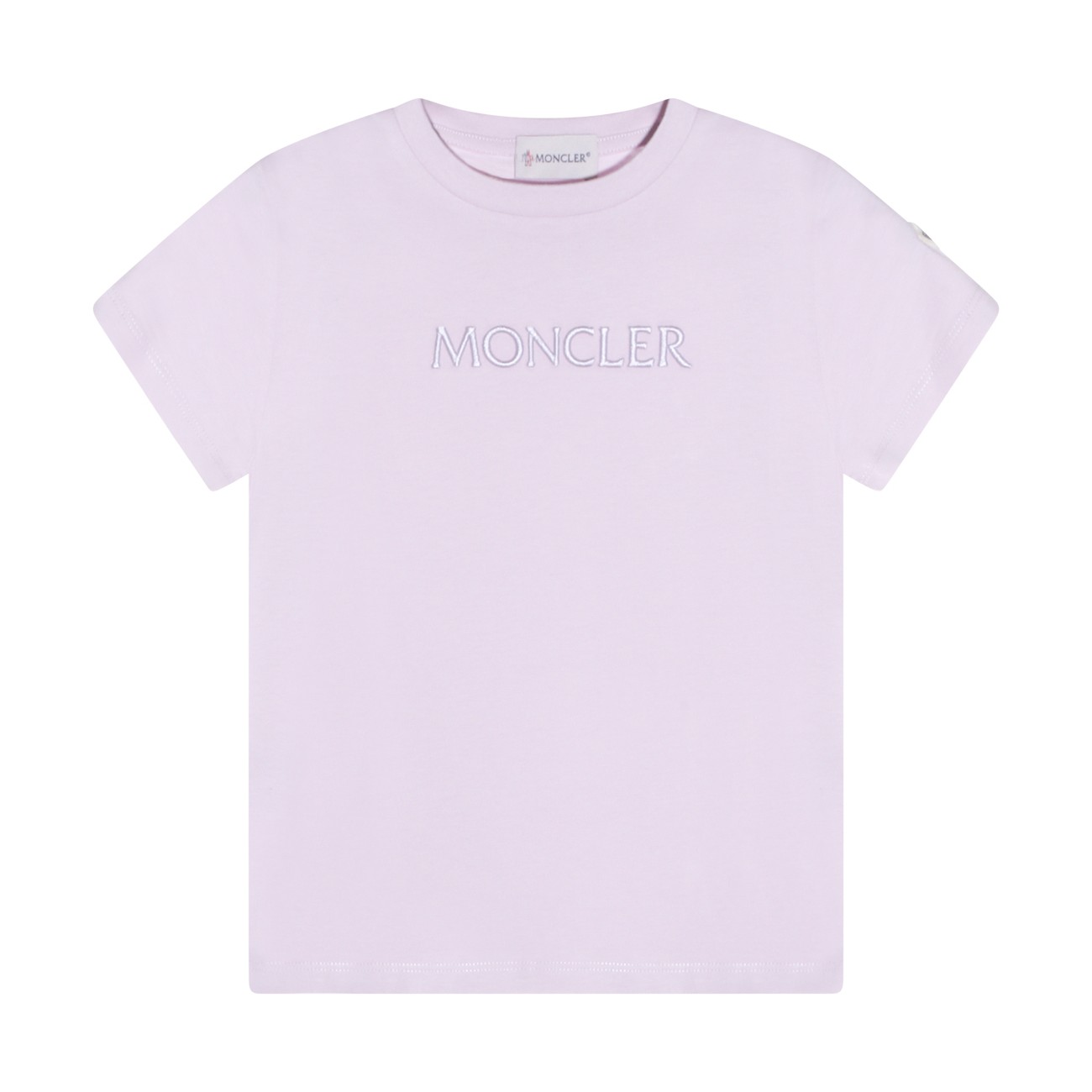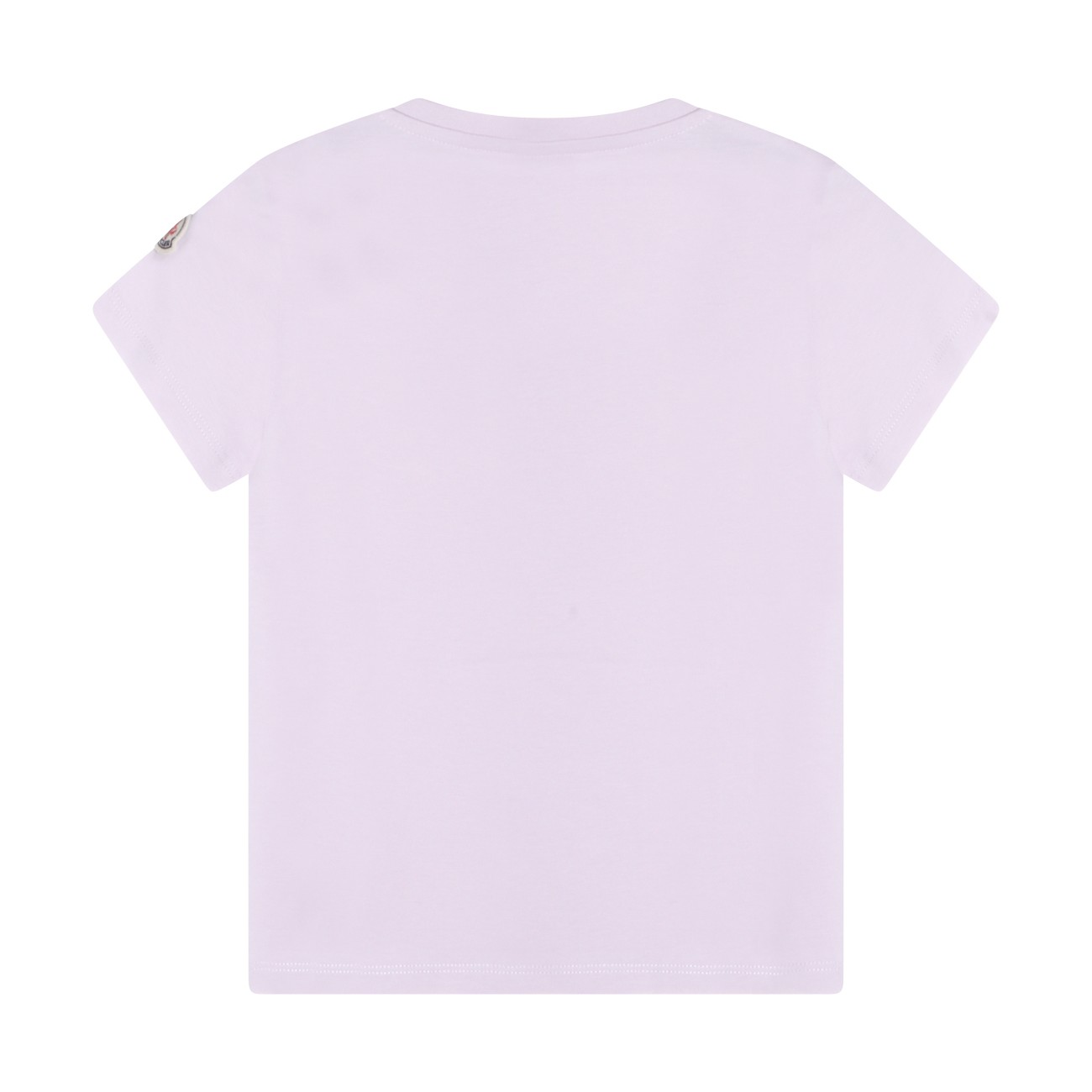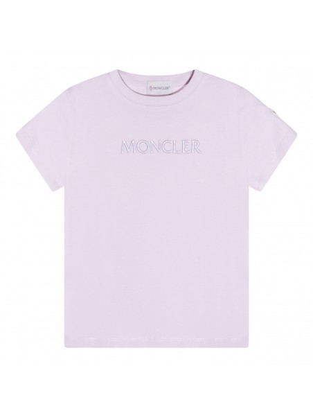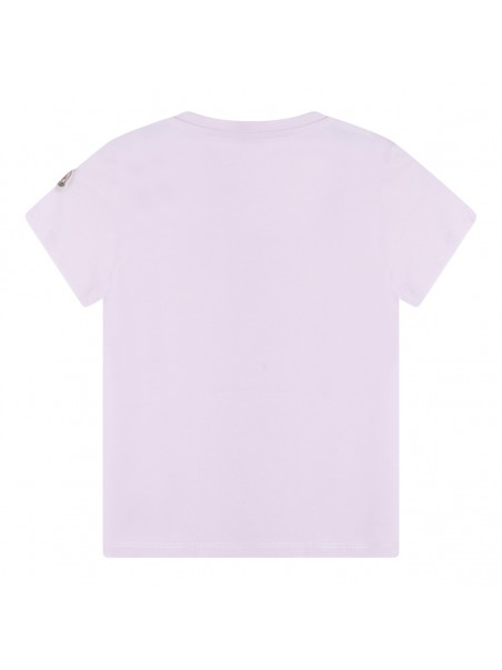 Lilac cotton T-Shirt from Moncler Kids featuring short sleeves, round neck, logo detail at front and straight hem.