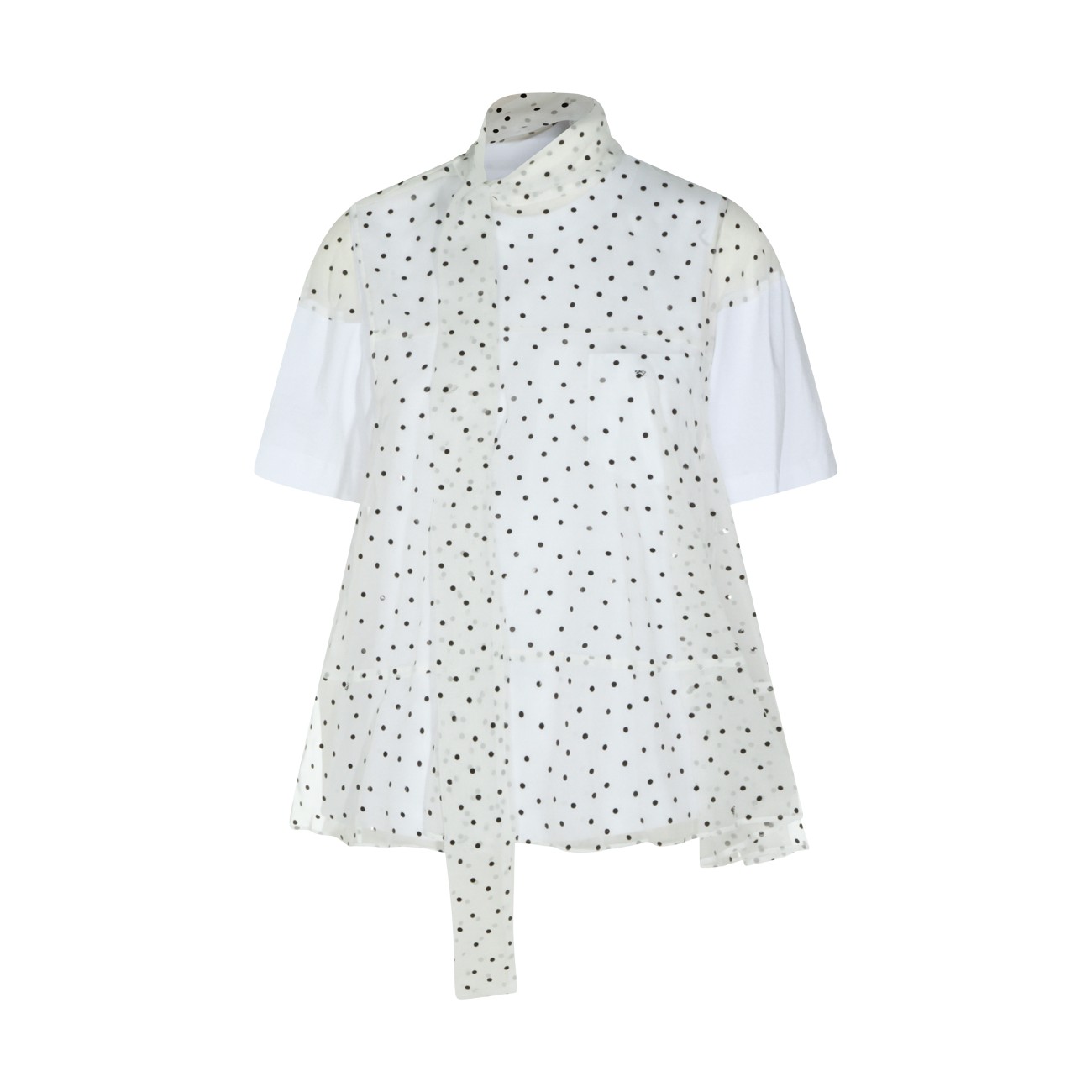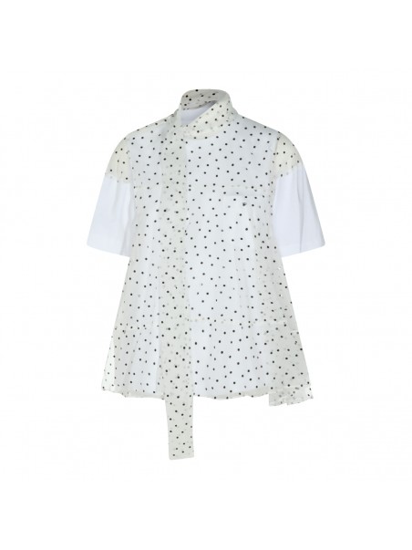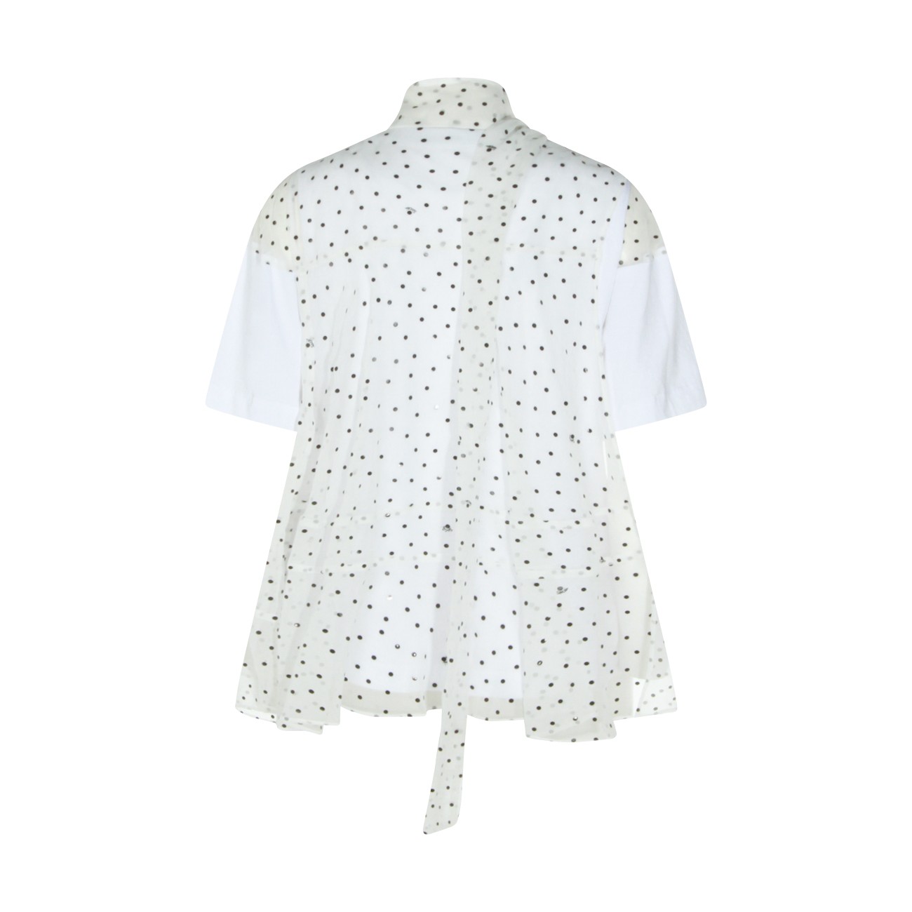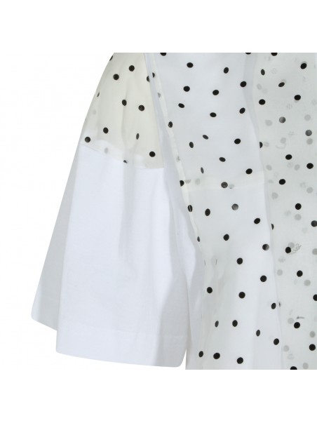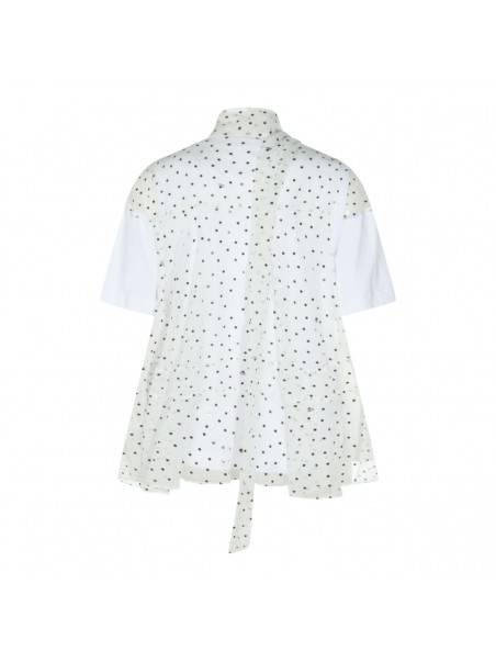 White cotton t-shirt from Sacai featuring high collar, short sleeves, polka dots and flared vestibility.
