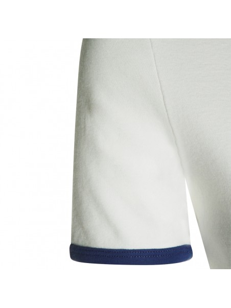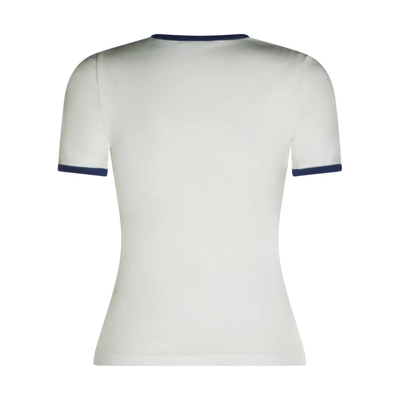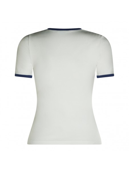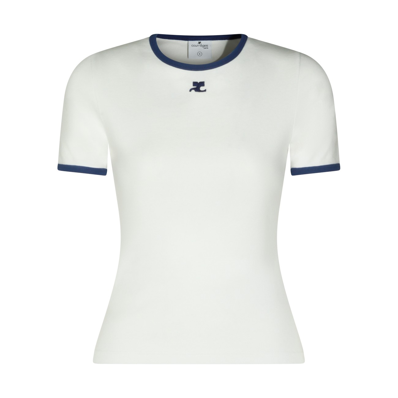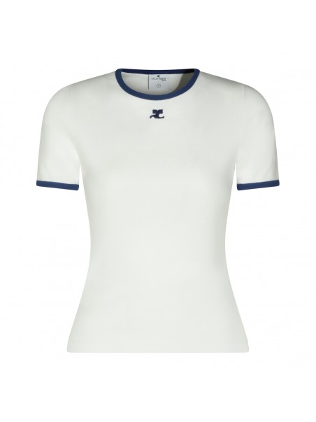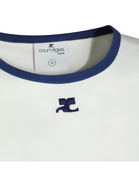 White and black cotton T-Shirt from Courreges featuring stretch fit, short sleeves, round neck and embroidered logo at front.