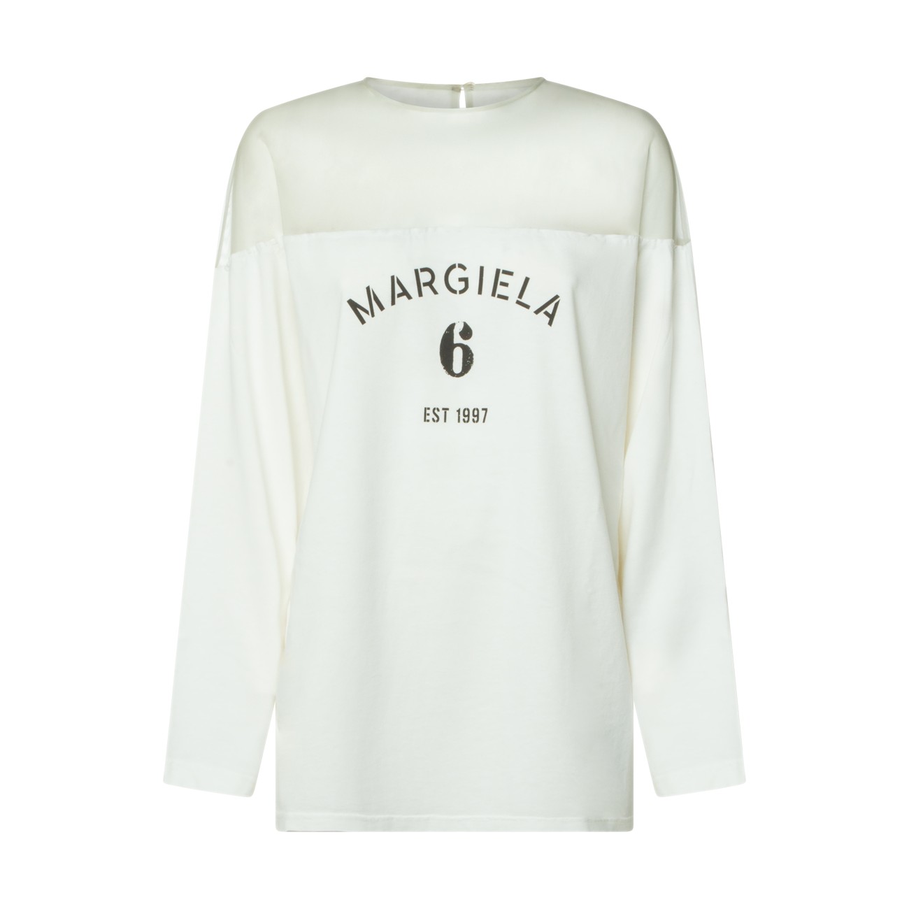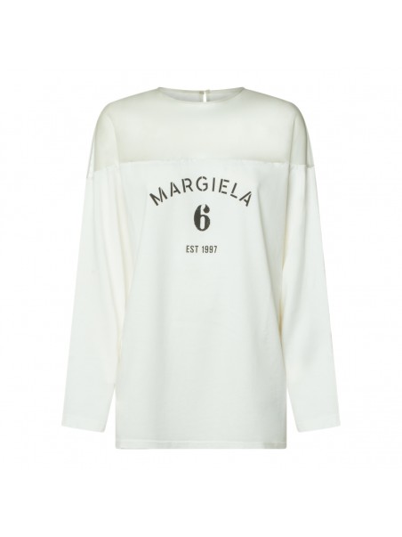 White cotton t-shirt from MM6 Maison Margiela featuring crew neckline, long sleeves, print and regular fit.