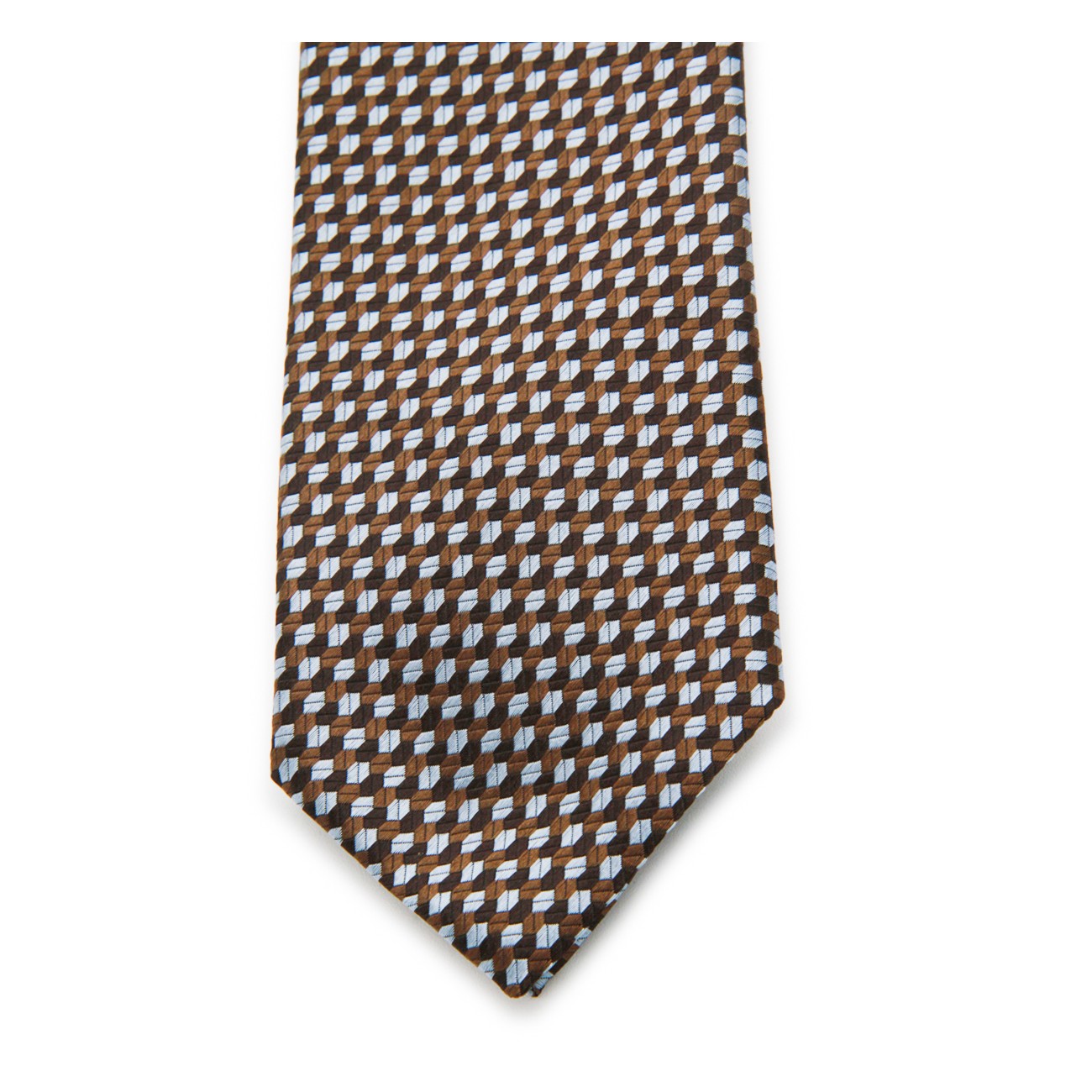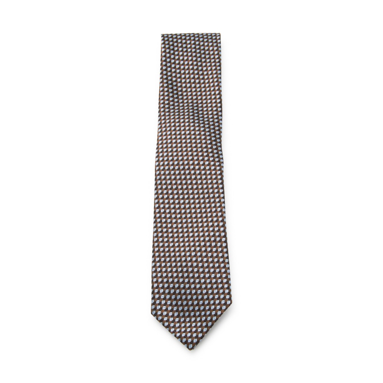 Brown and white silk tie from Zegna featuring all over pattern and logo patch.