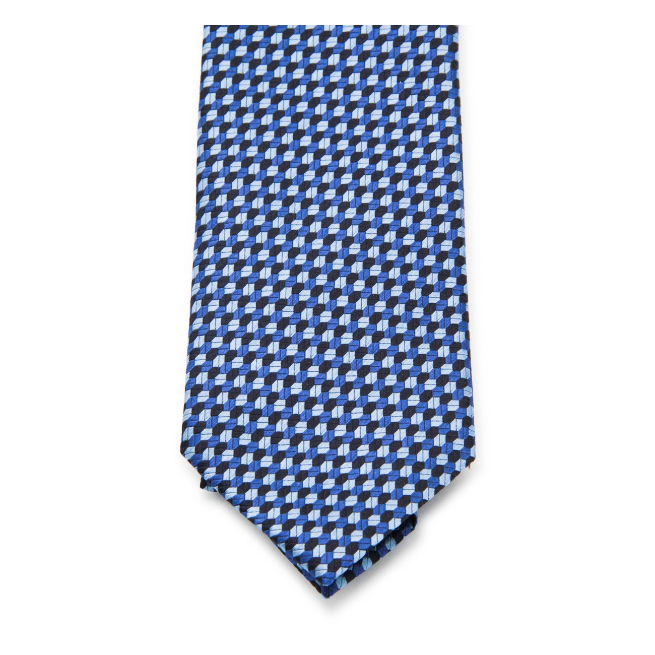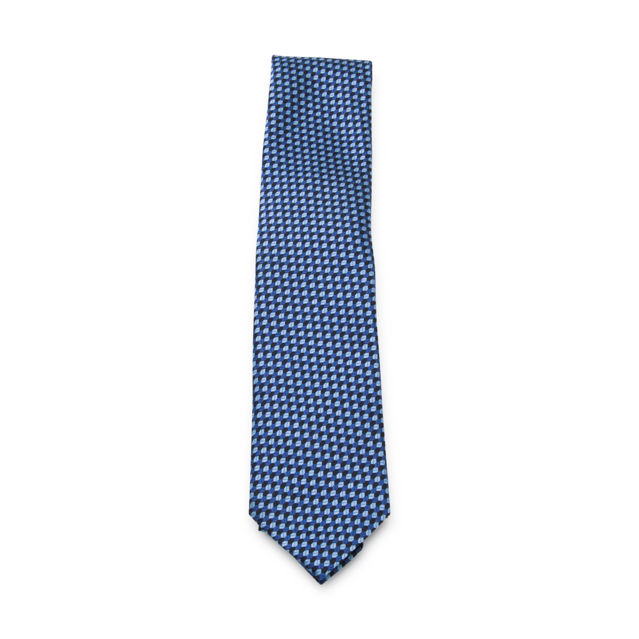 Blue and white silk tie from Zegna featuring all over pattern and logo patch.