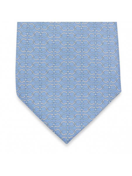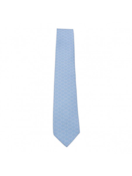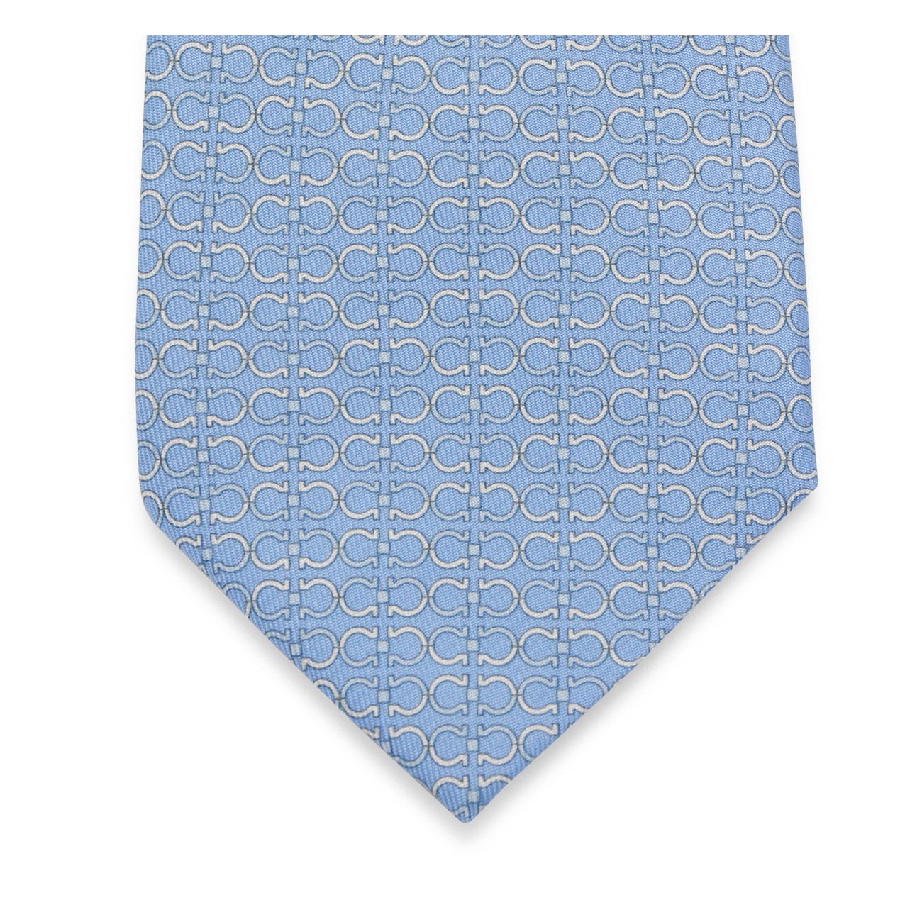 Light blue silk tie from Ferragamo featuring all over pattern and logo patch.