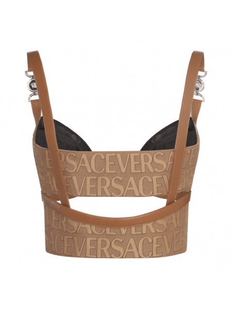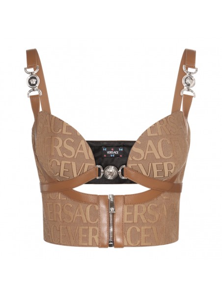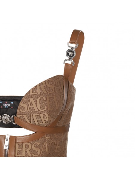 Brown cotton and leather top from Versace featuring all-over logo print, Medusa plaque detail, corset style, sleeveless, cut-out detailing, silver-tone hardware, cropped and front zip fastening.