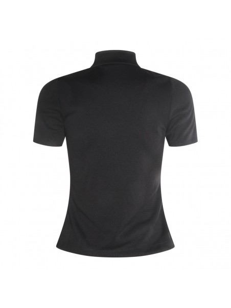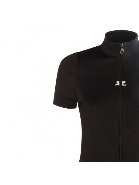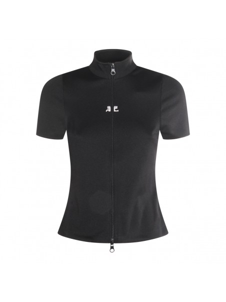 Black top from Courreges featuring short sleeves, high collar, logo print and zip fastening.