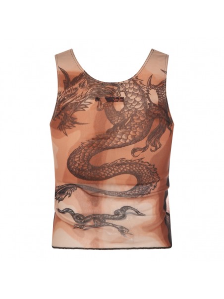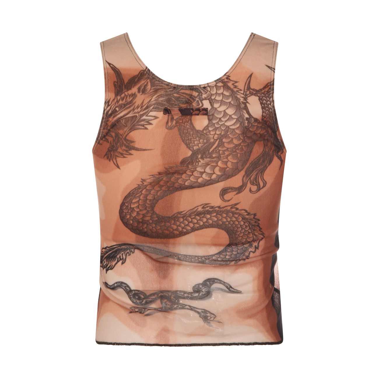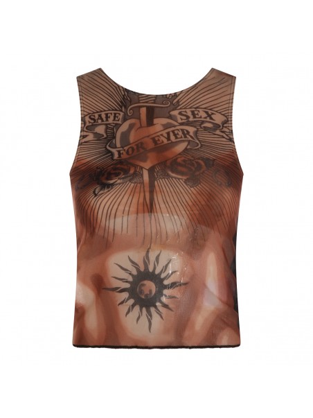 Brown top from Jean Paul Gaultier featuring round neck, sleeveless and all over stamp.