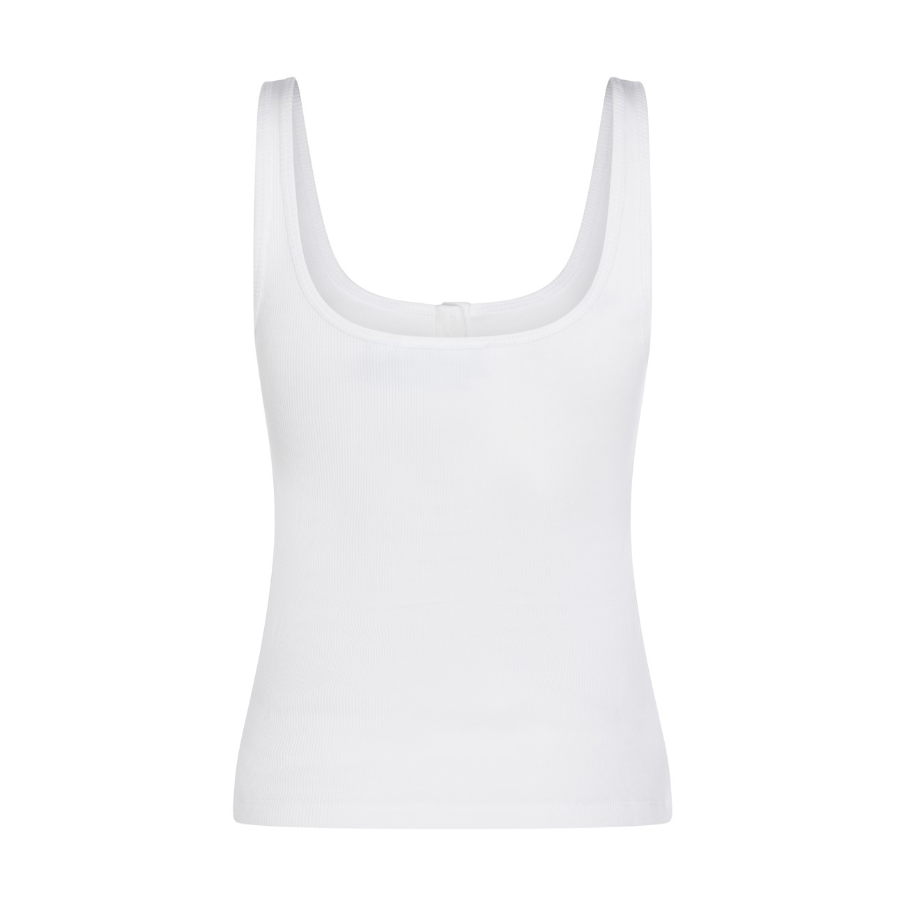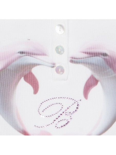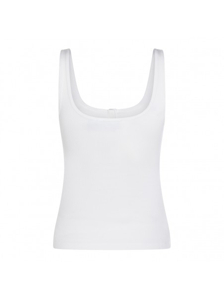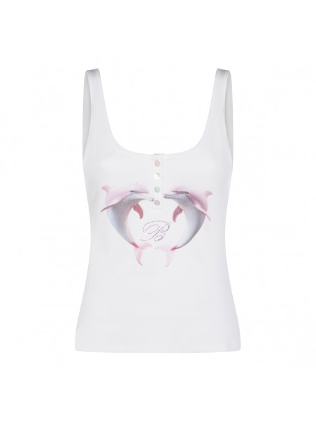 White cotton top from Blumarine featuring round neck, sleeveless, thin straps, buttons detail, frontal embroidered logo in rhinestones, frontal stamp and regular vestibility.