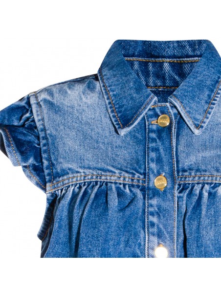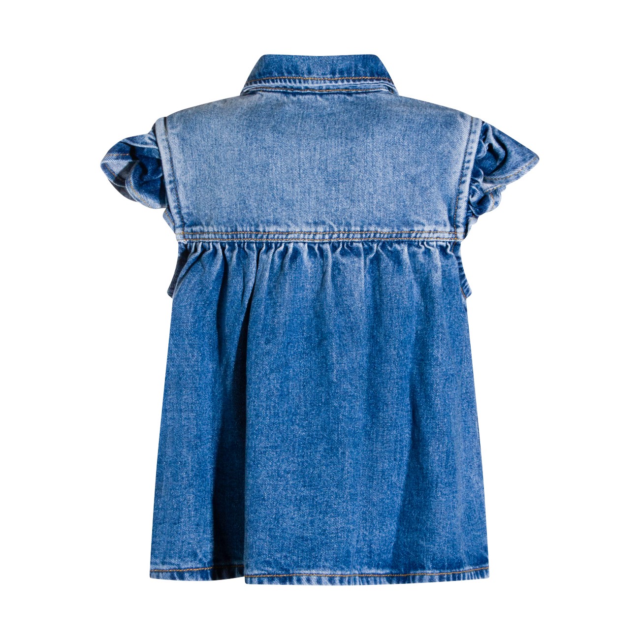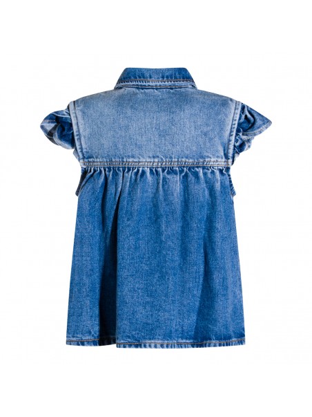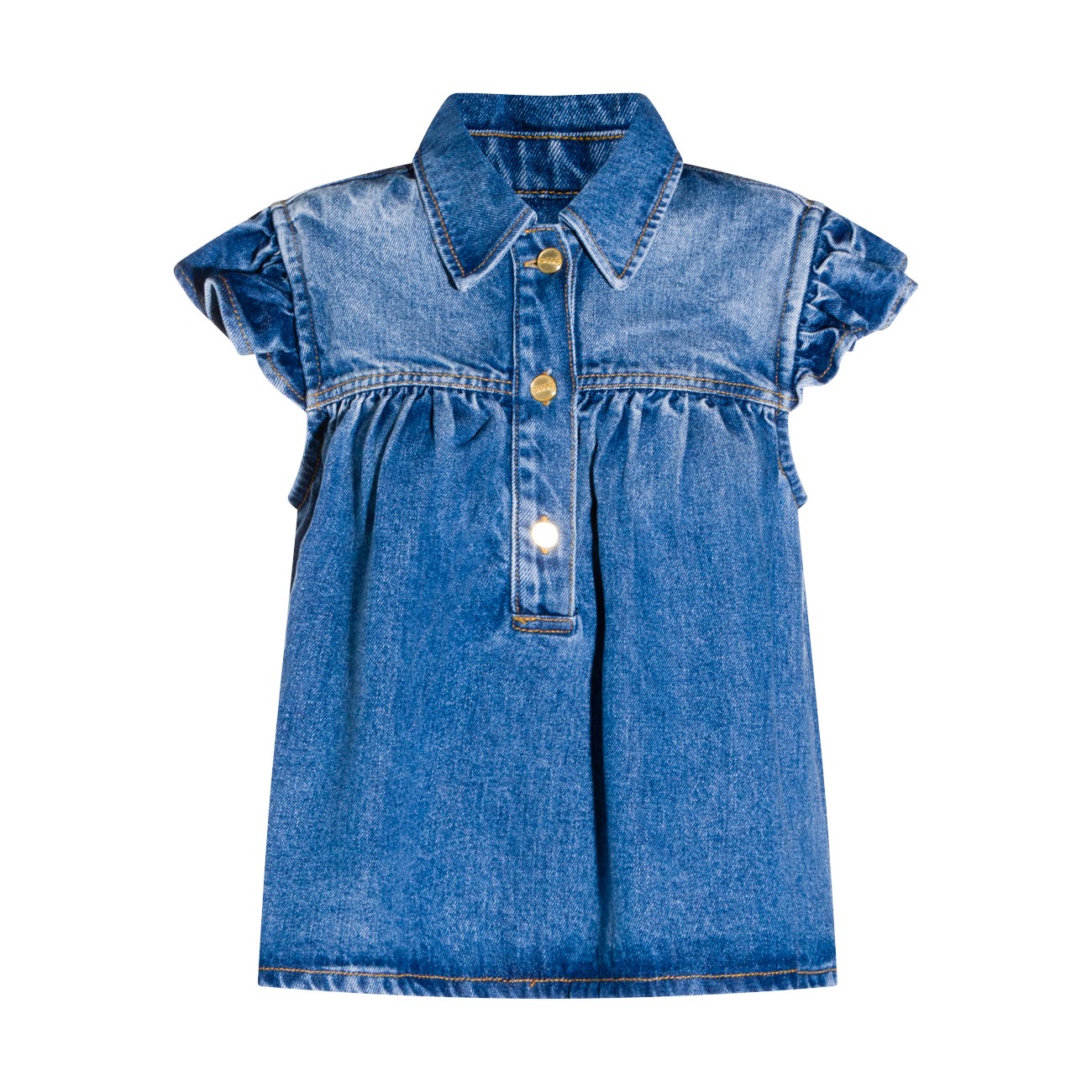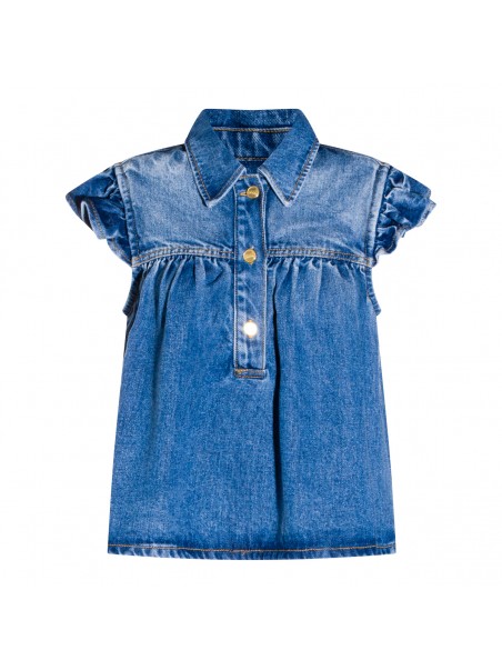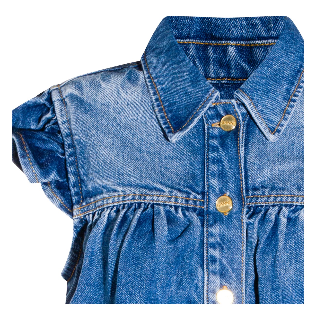 Blue cotton top from Ganni featuring shirt collar, frontal buttons fastening, ruffled sleeves, gold tone buttons and regular vestibility.