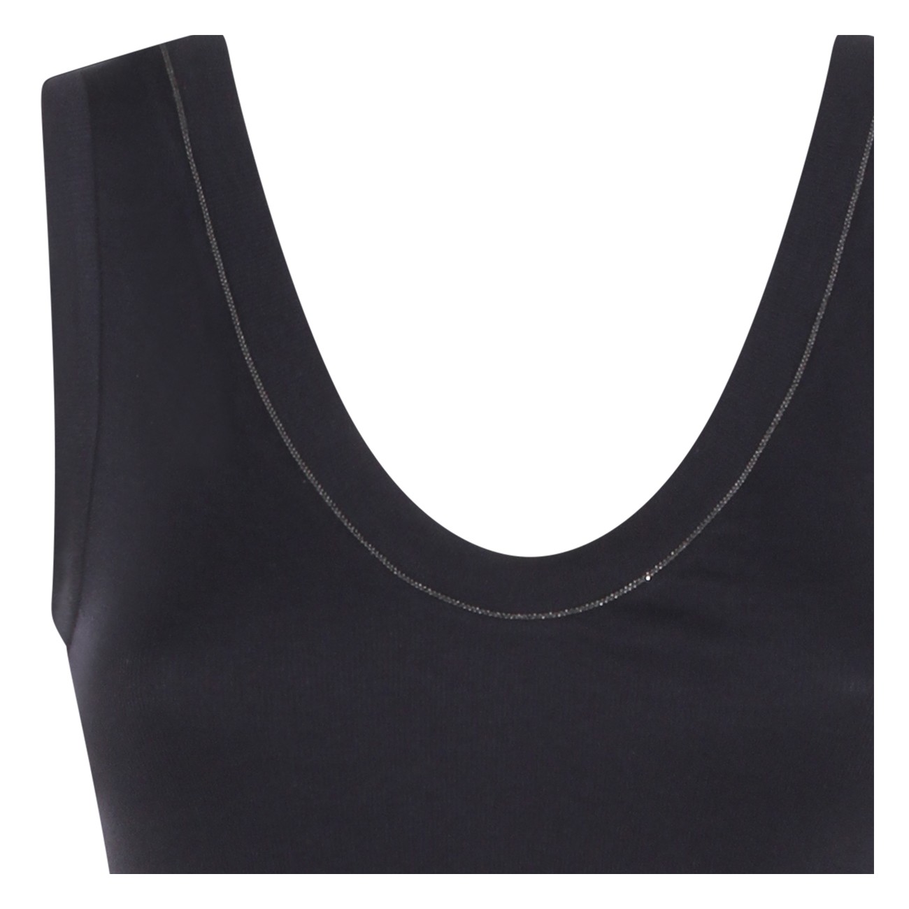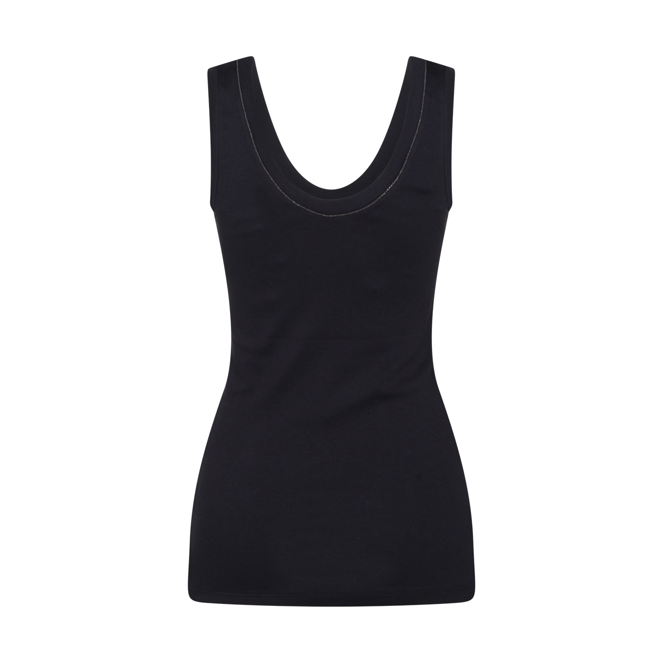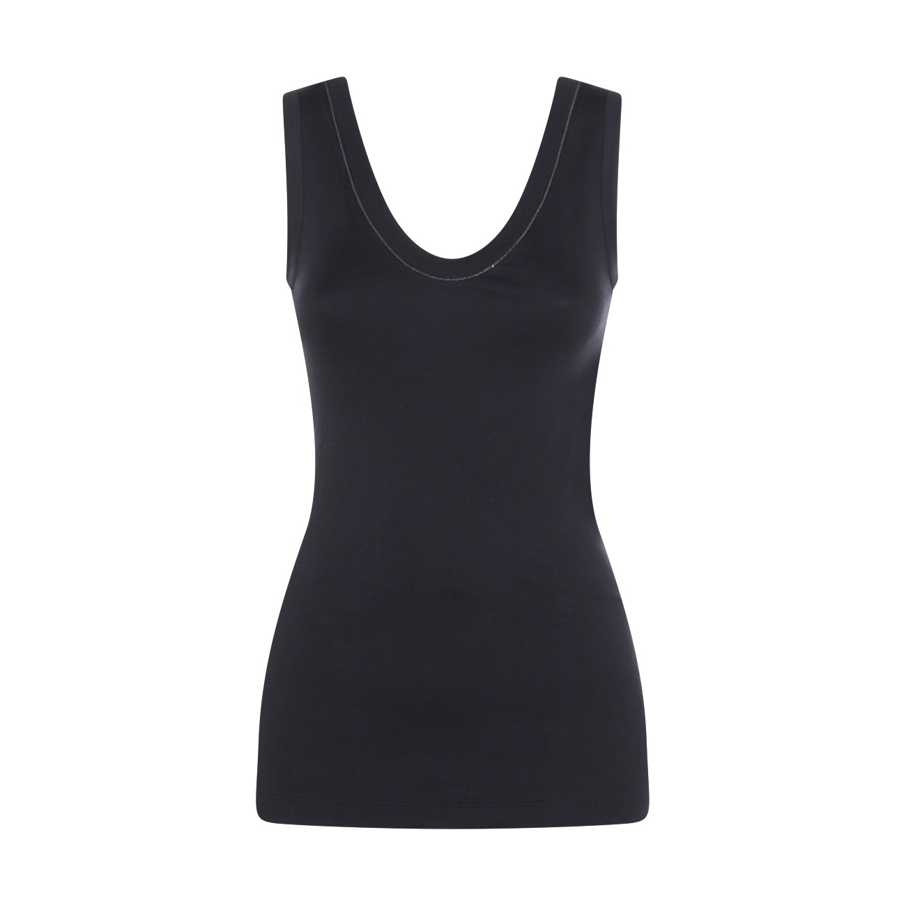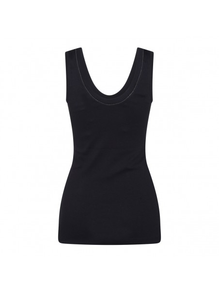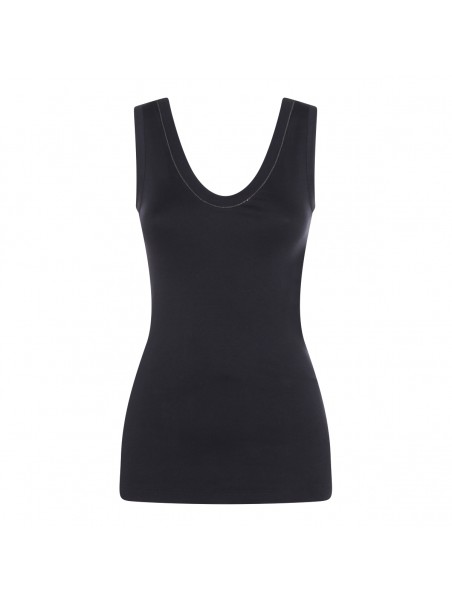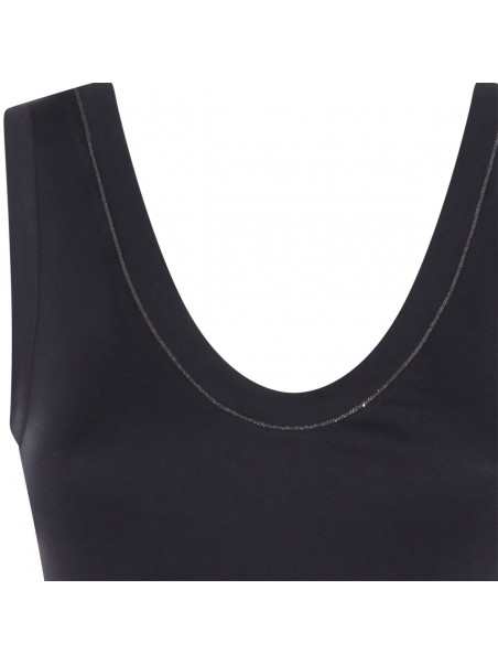 Dark blue cotton top from Brunello Cucinelli featuring sleeveless, round deep collar and regular vestibility.