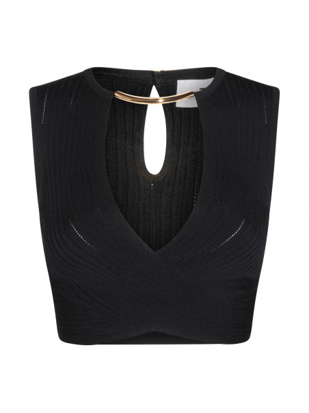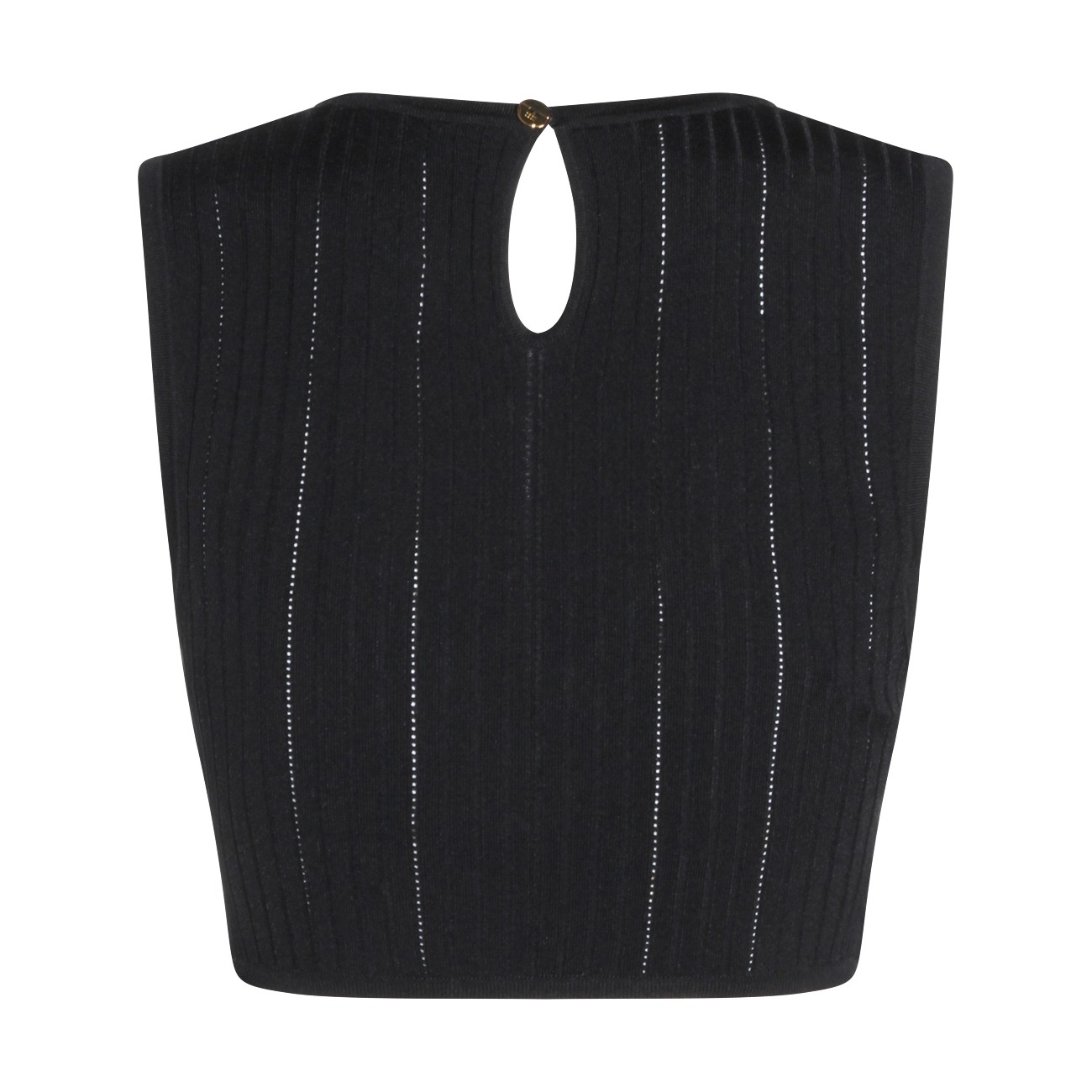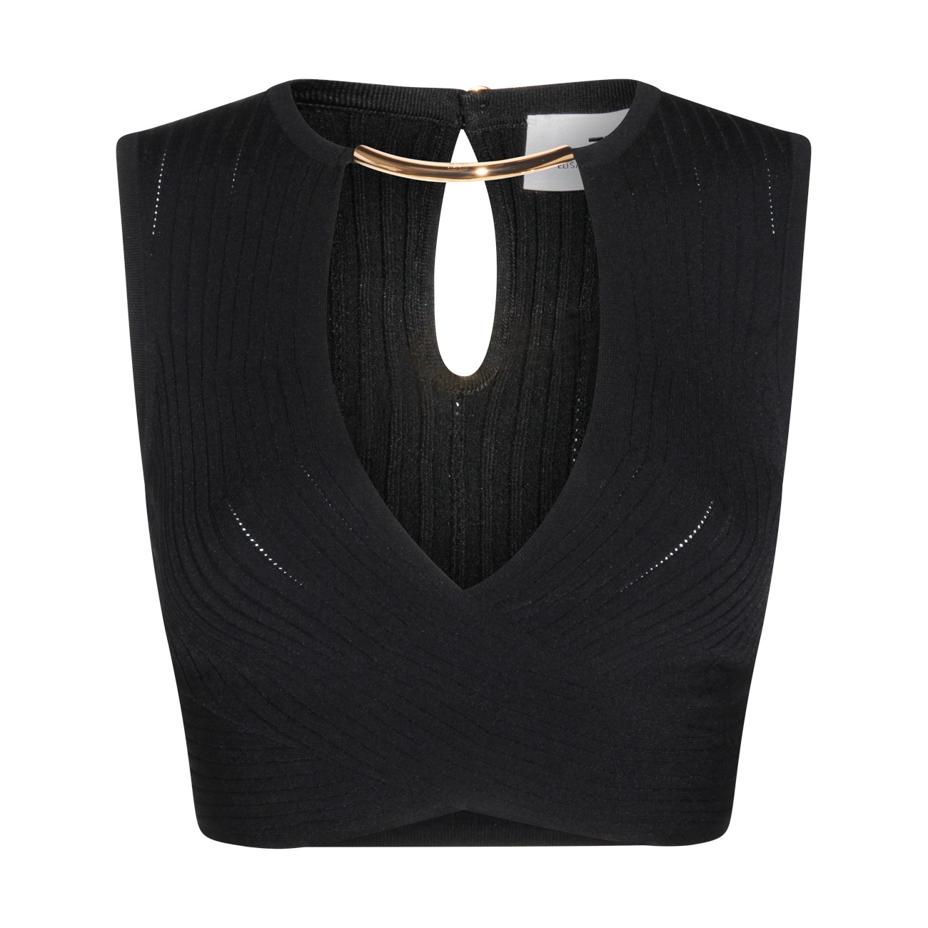 Black top from Elisabetta Franchi featuring sleeveless, back fastening and frontal deep neckline.