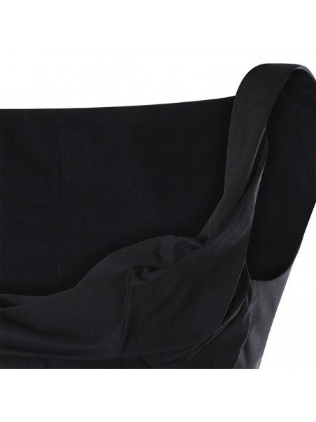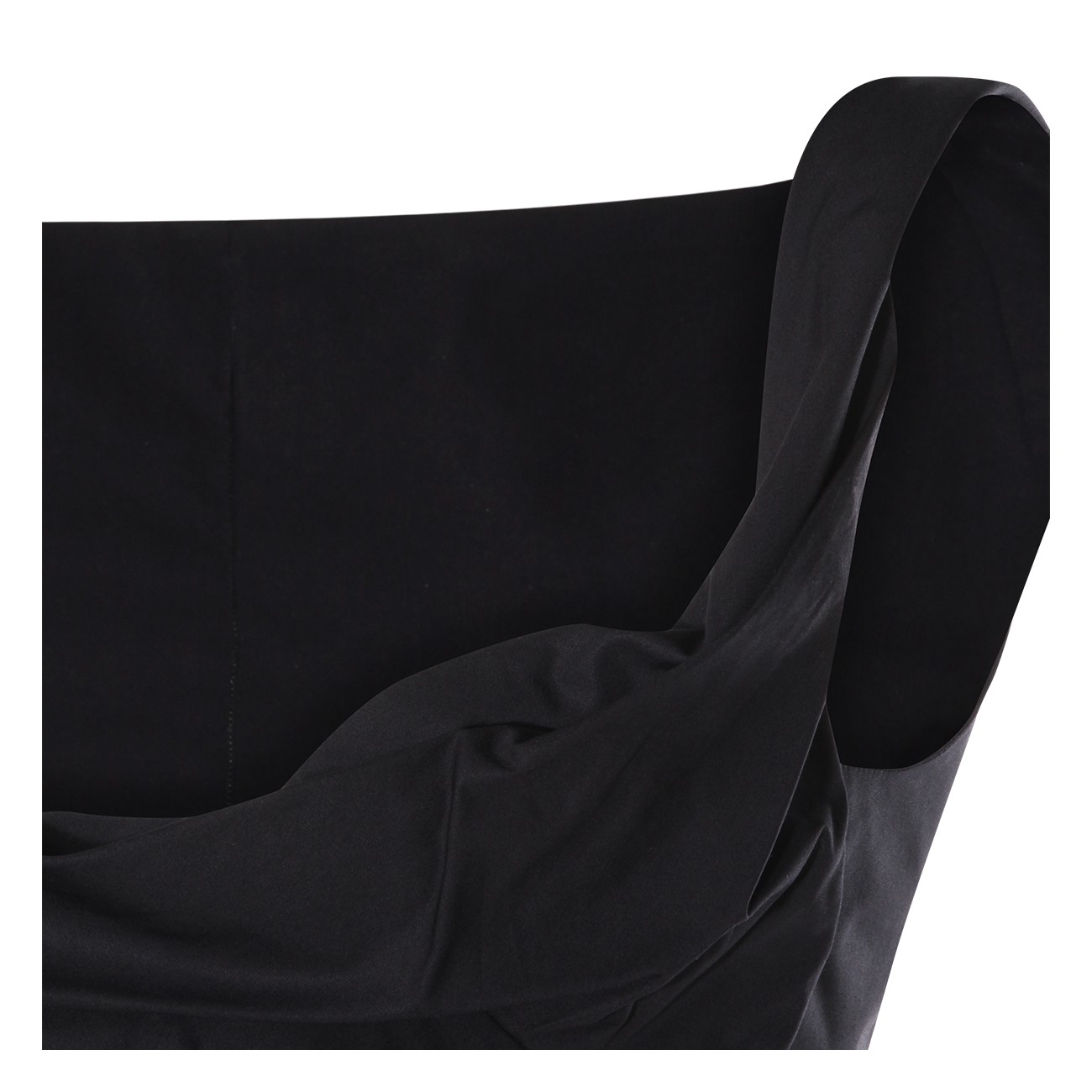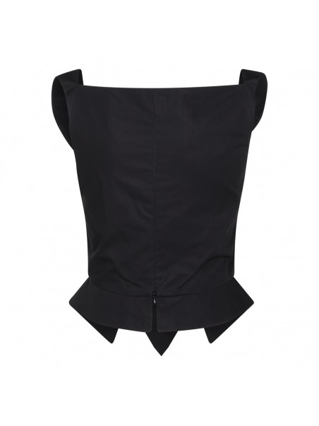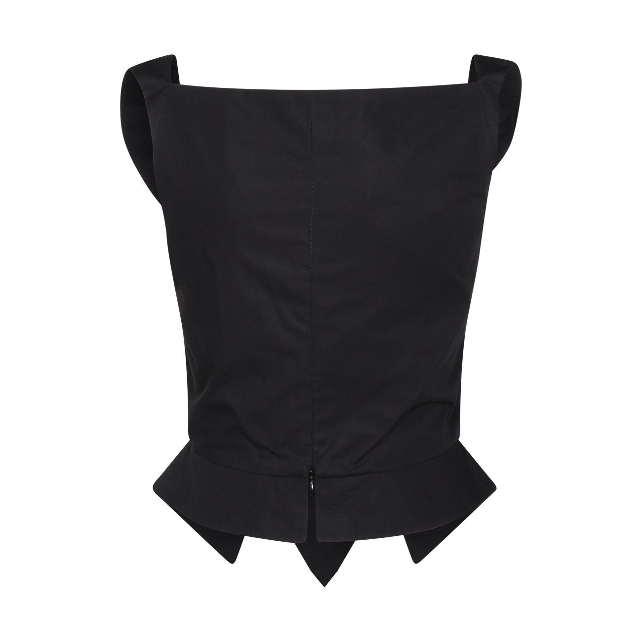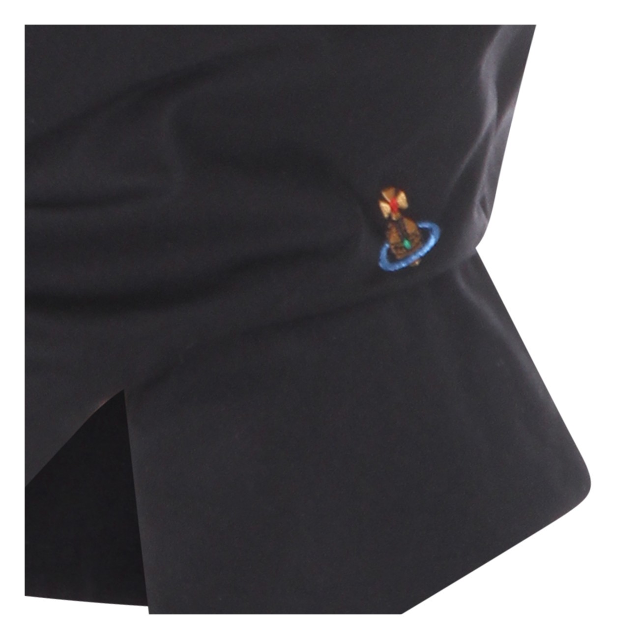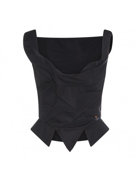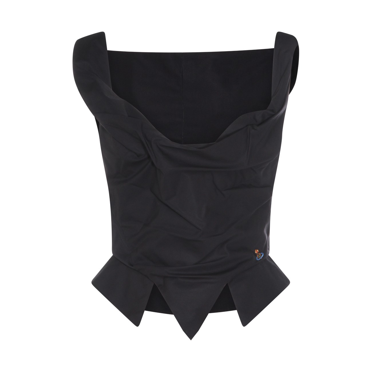 Black cotton Orb top from Vivienne Westwood featuring stretch fit, deep neck, peplum line and embroidered logo Orb at side.