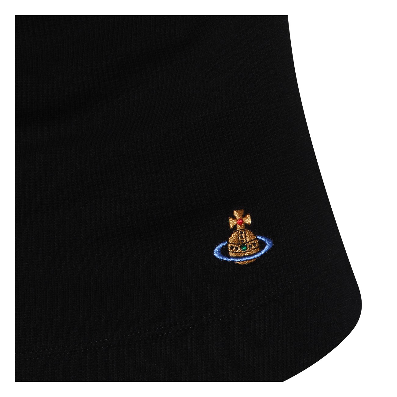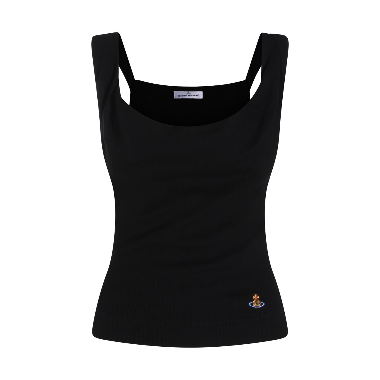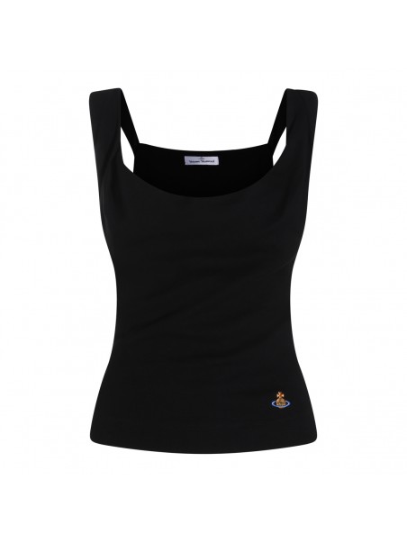 Black cotton top from Vivienne Westwood featuring round deep collar, sleeveless, logo patch and regular vestibility.