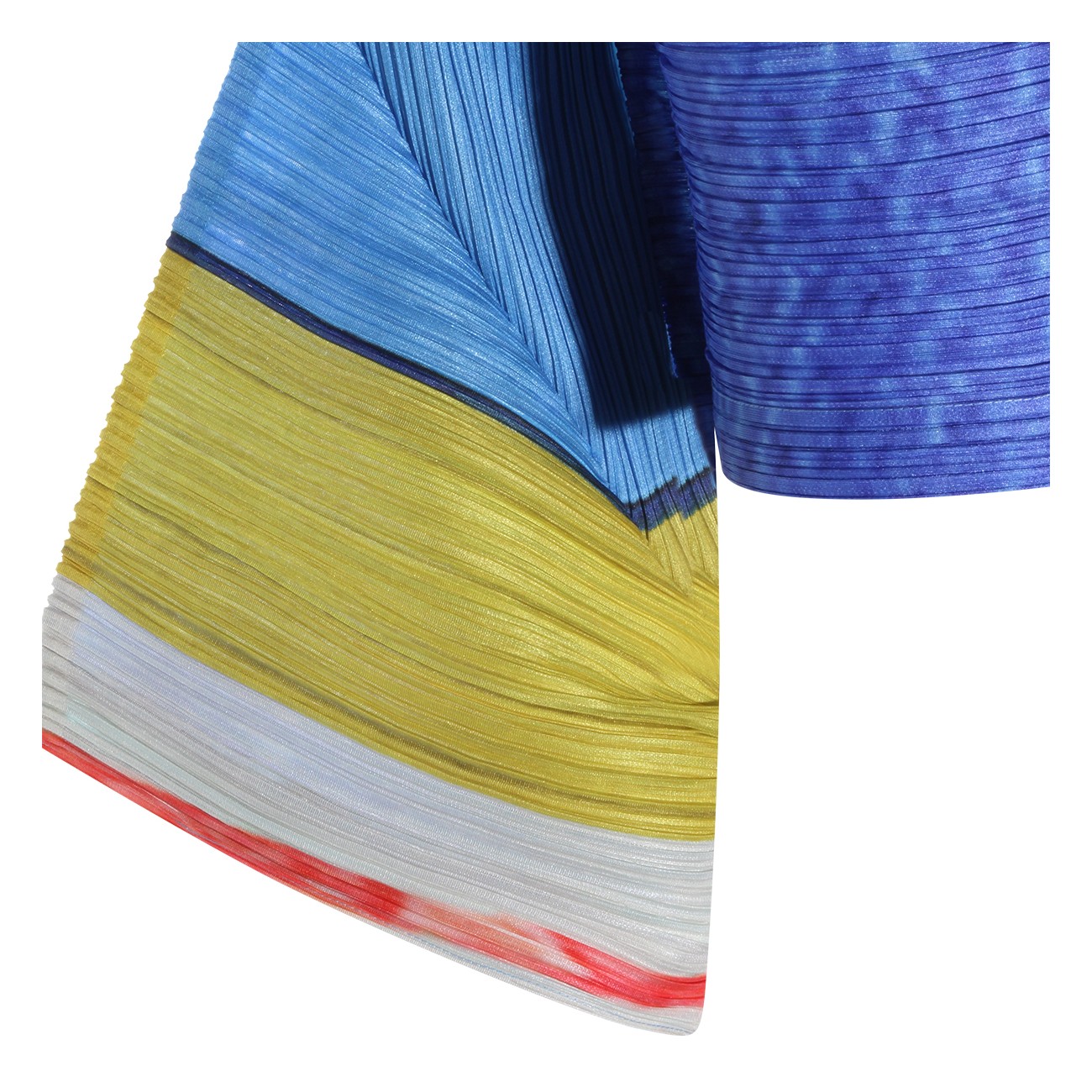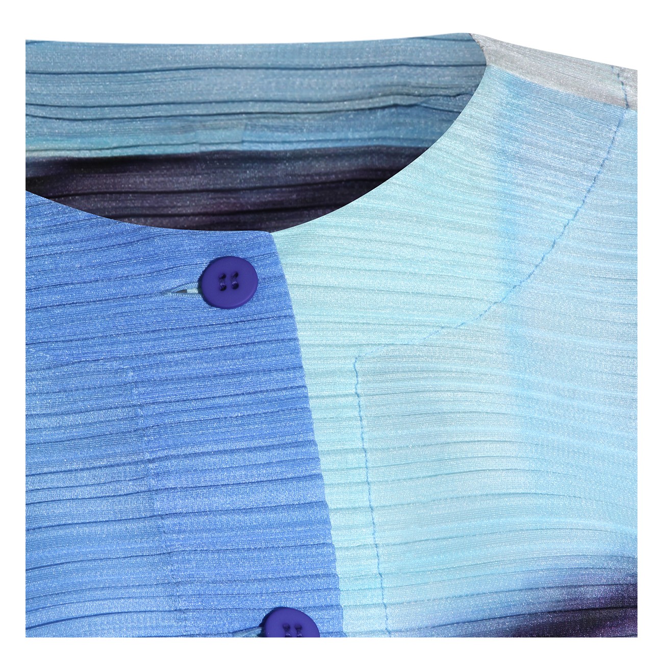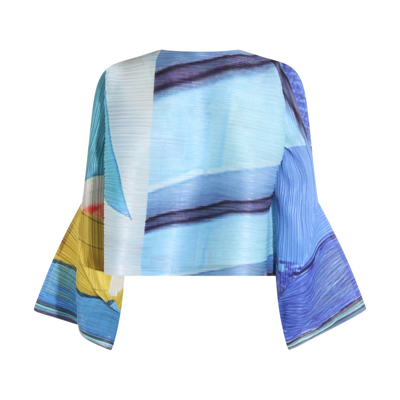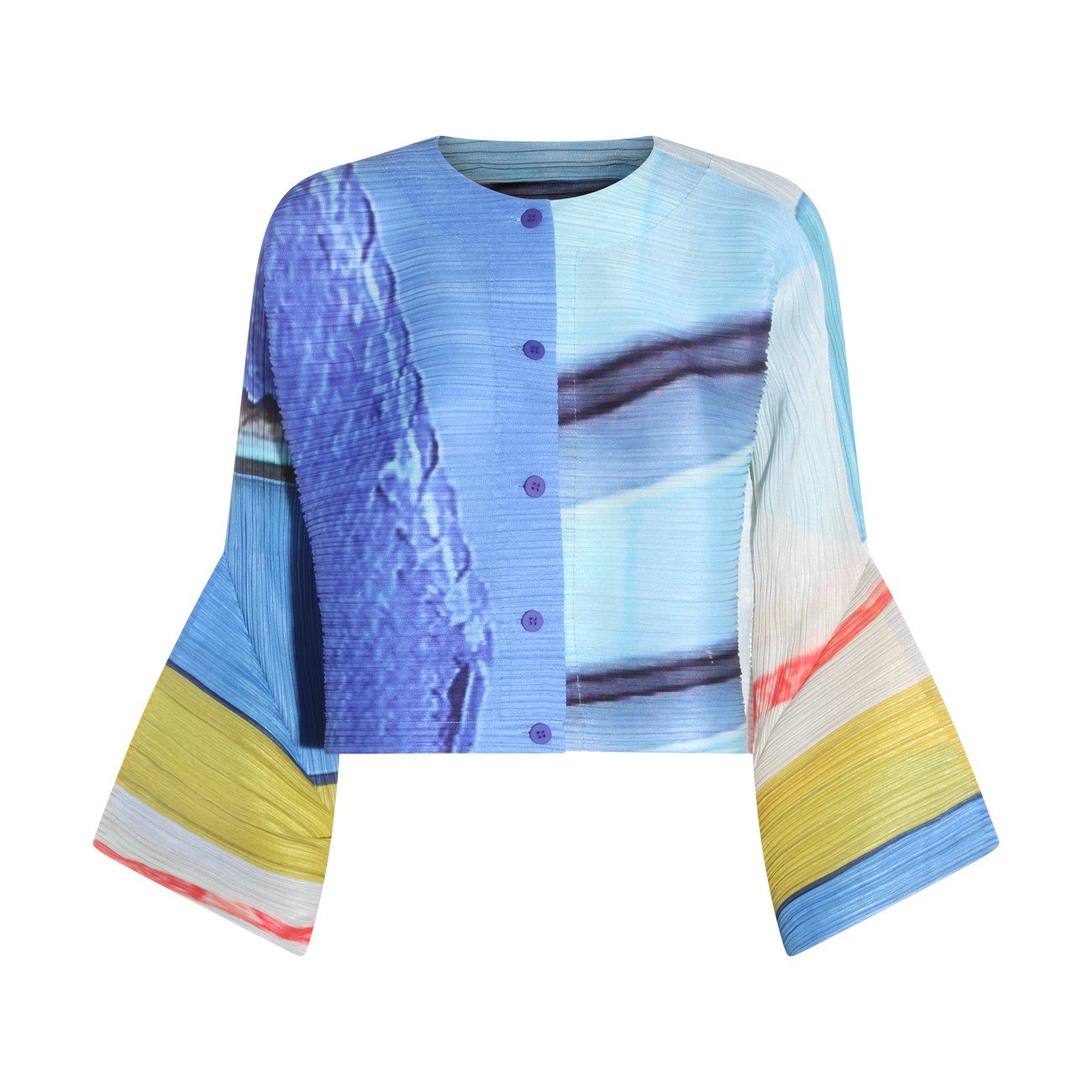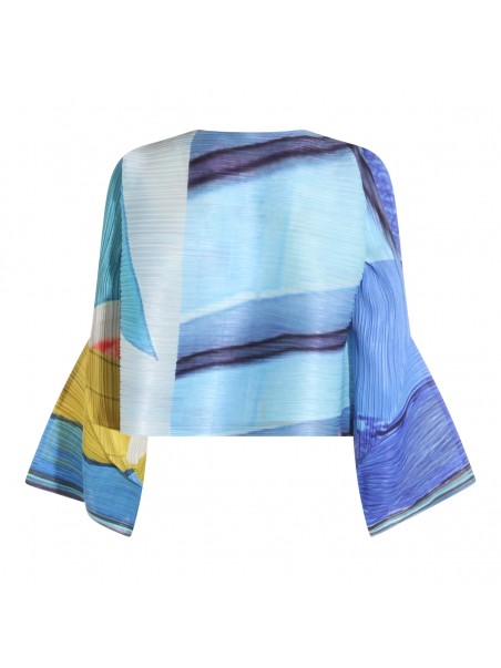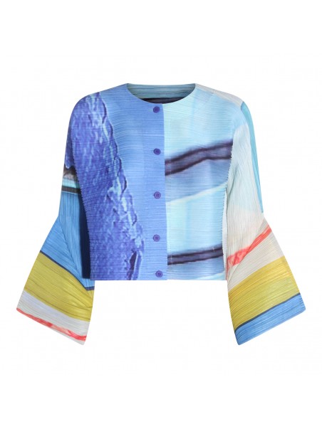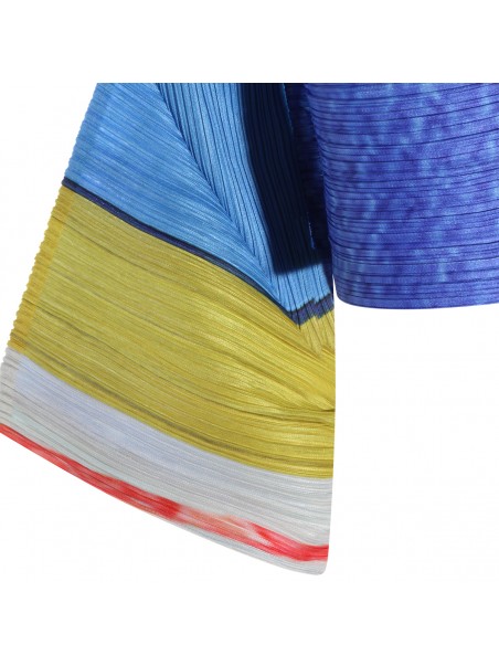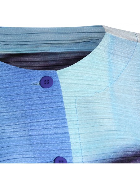 Blue and yellow pleated top from Pleats Please Issey Miyake featuring long sleeves, round collar, buttons fastening and details.