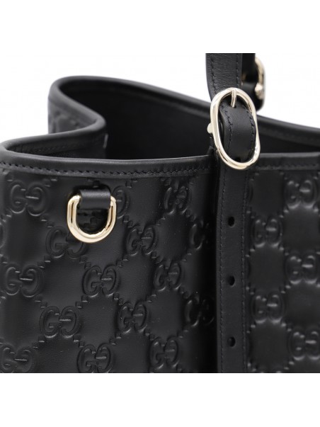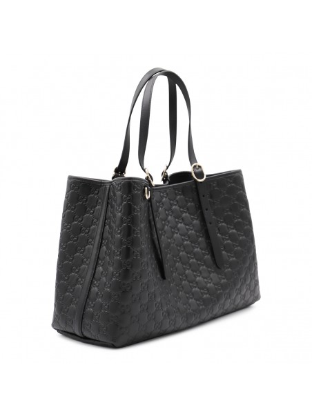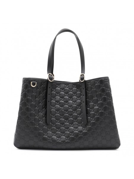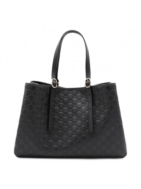 Black leather Emblem big totes from Gucci featuring adjustable top handles, magnetic closure, all-over GG motif, compartments and internal zip pocket.
