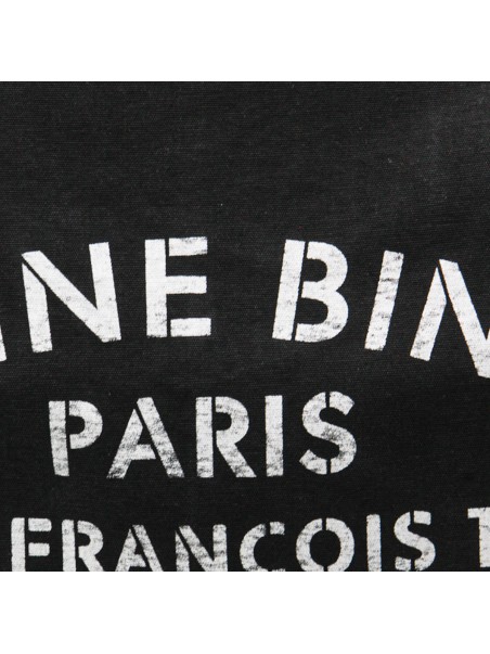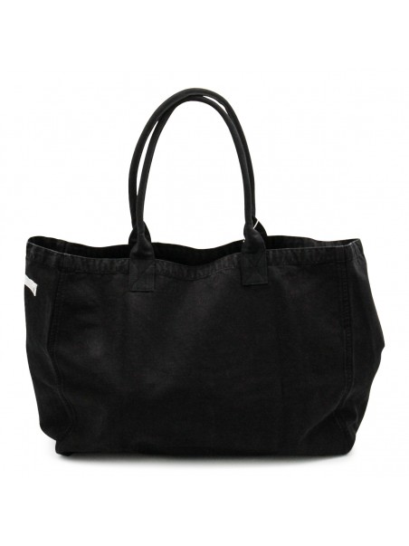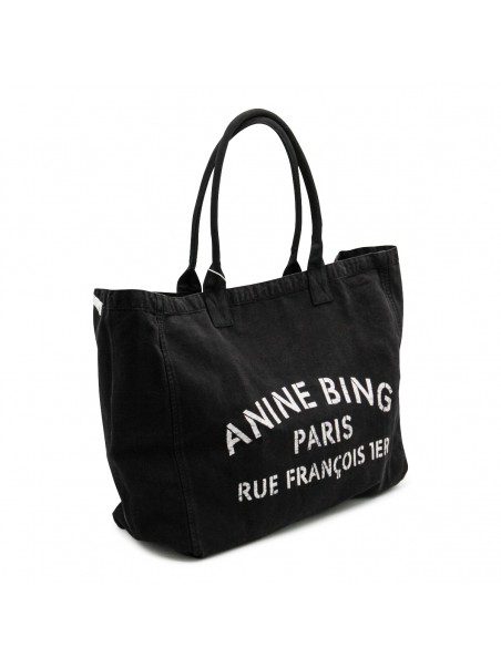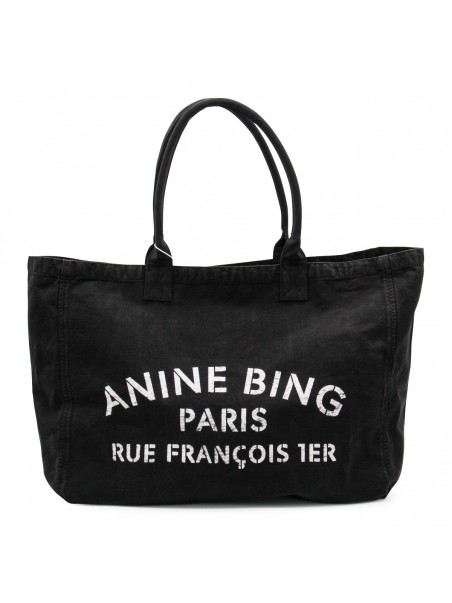 Black cotton totes from Anine Bing featuring top handles, frontal logo and inside pockets.