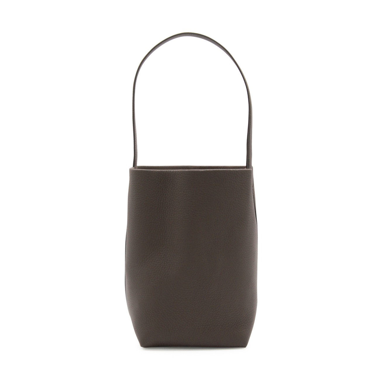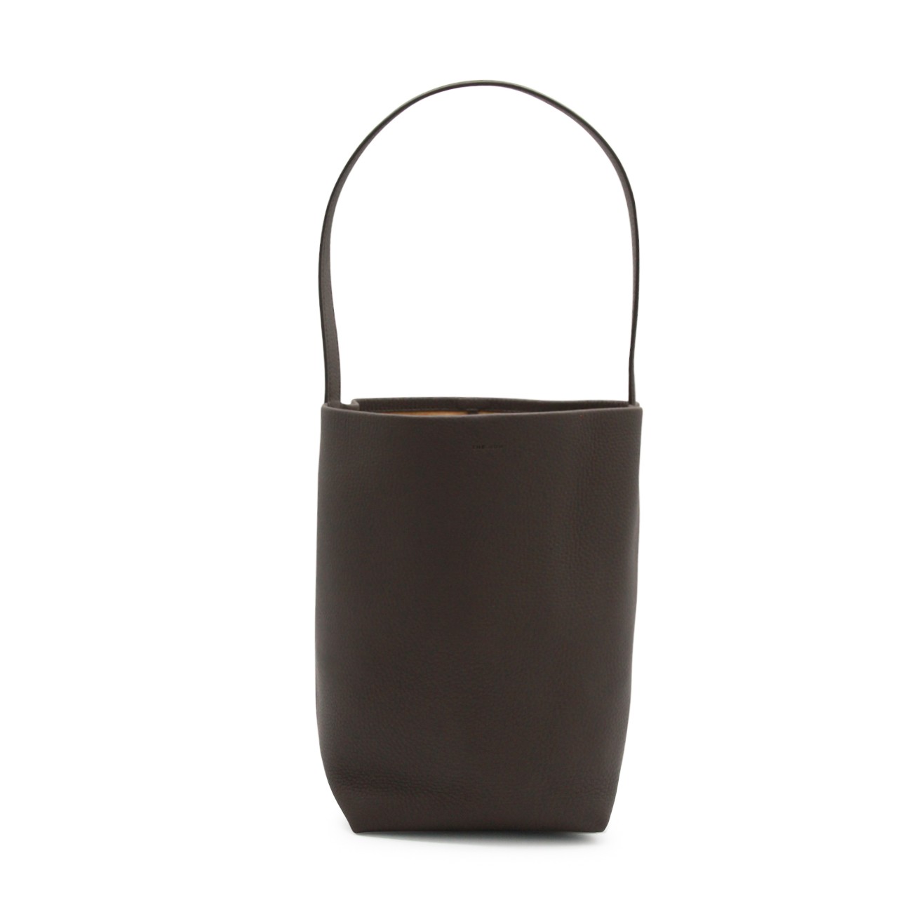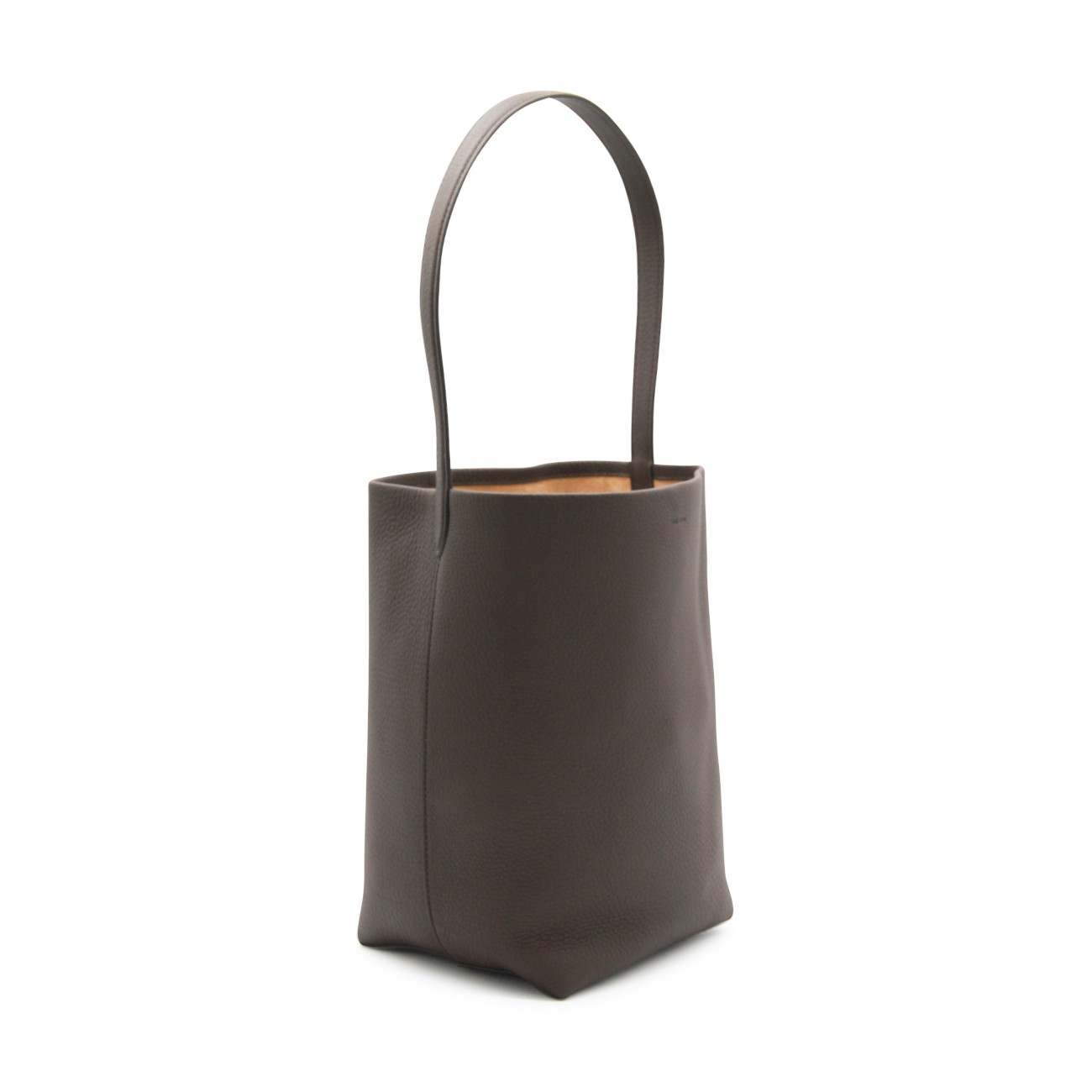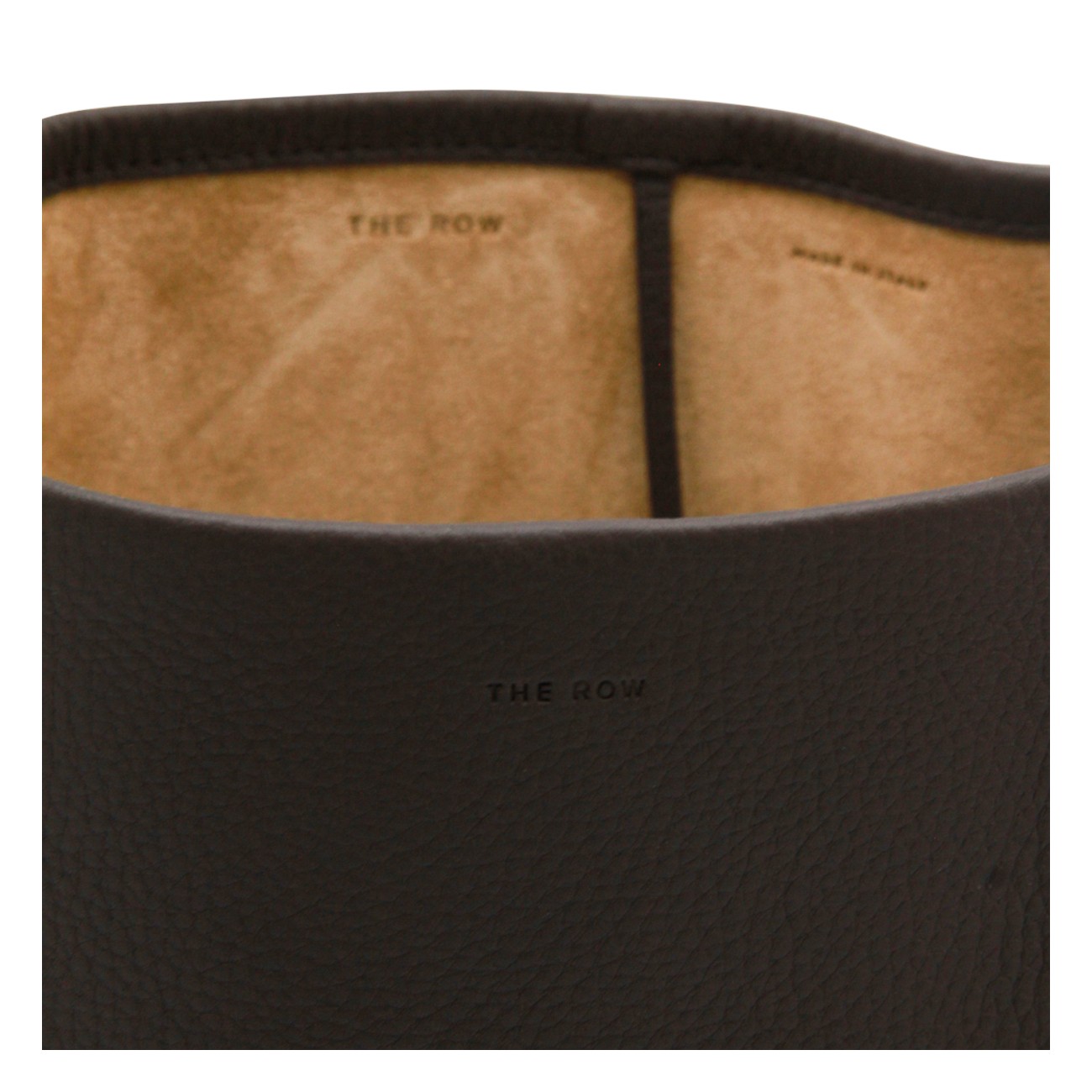 Dark brown leather Medium N/s Park totes from The Row featuring handle, frontal logo, inside pocket and details.