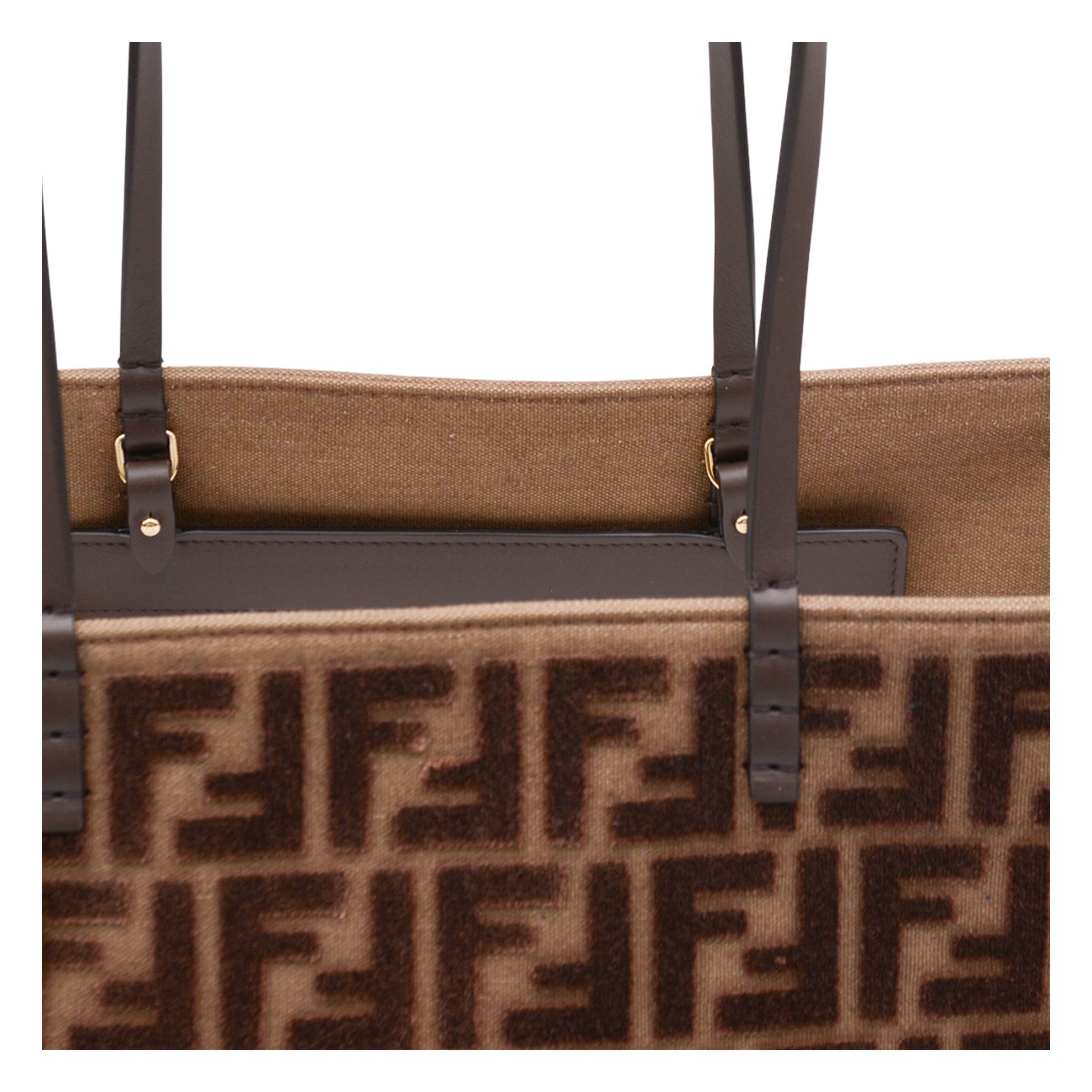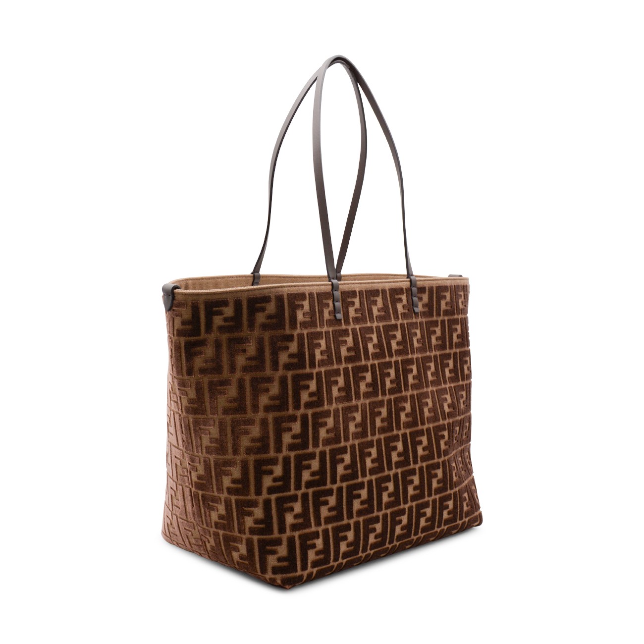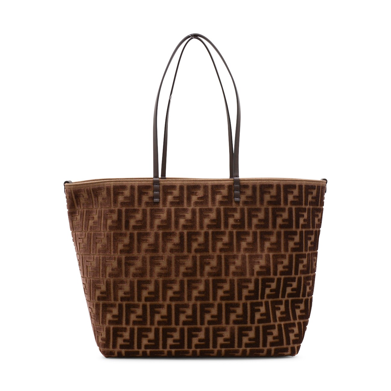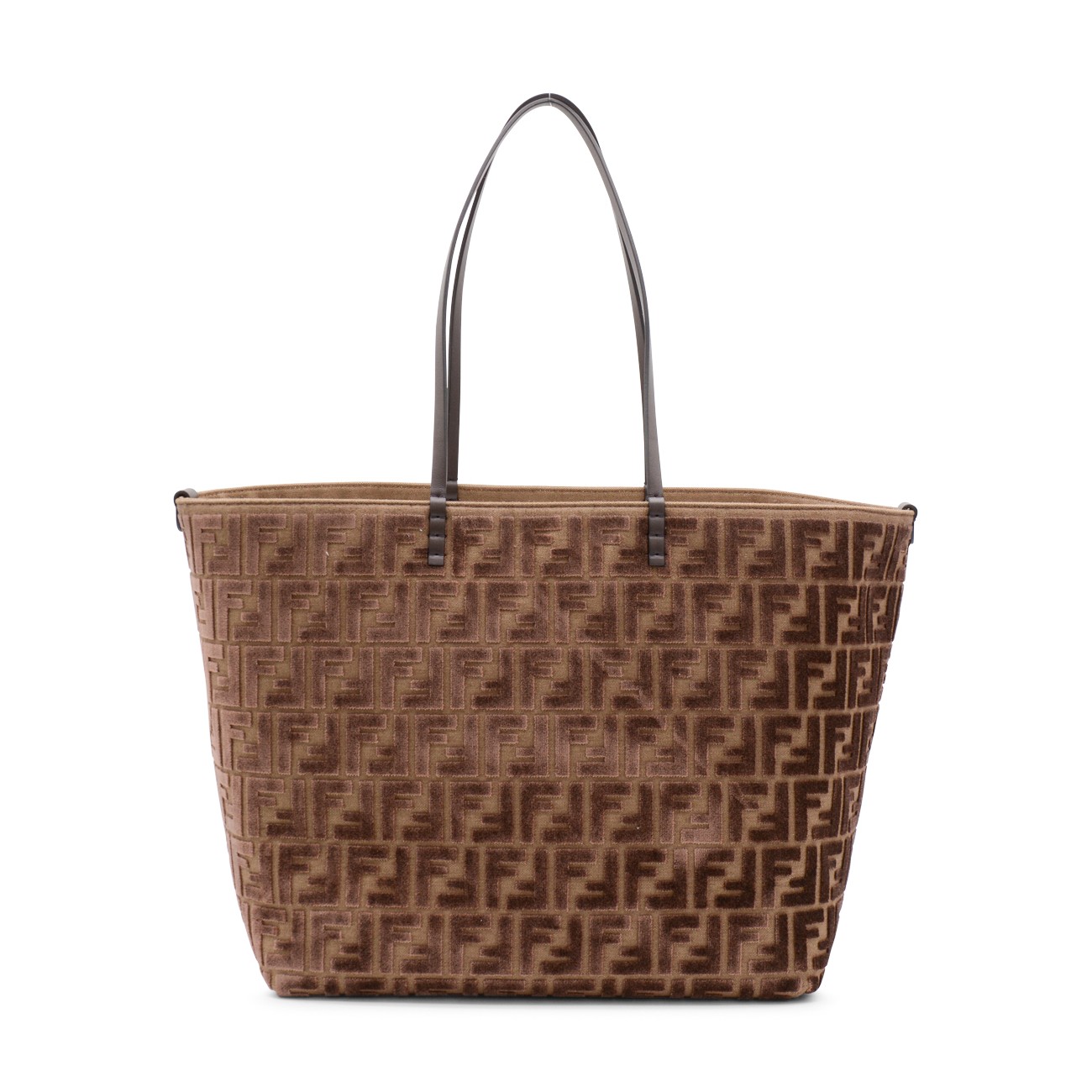 Brown Roll Large Zucca velvet tote from Fendi featuring double handle, all-over FF embossed logo texture, velvet, main compartment and removable internal pocket.