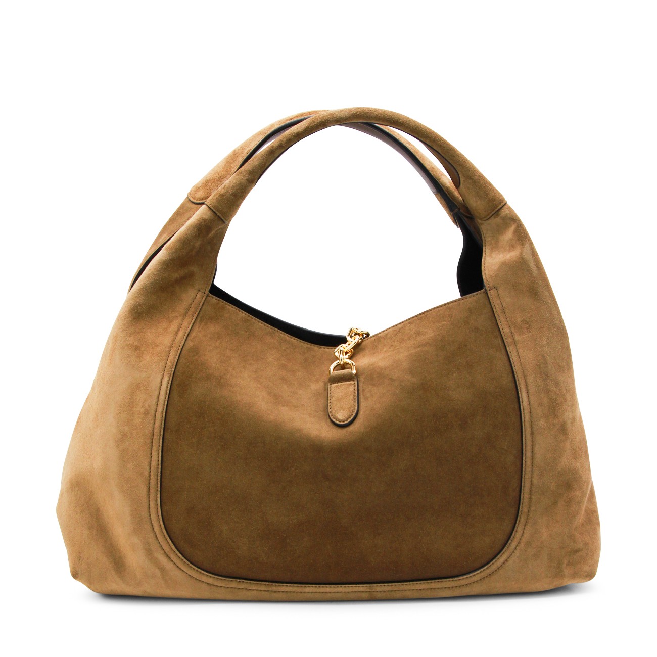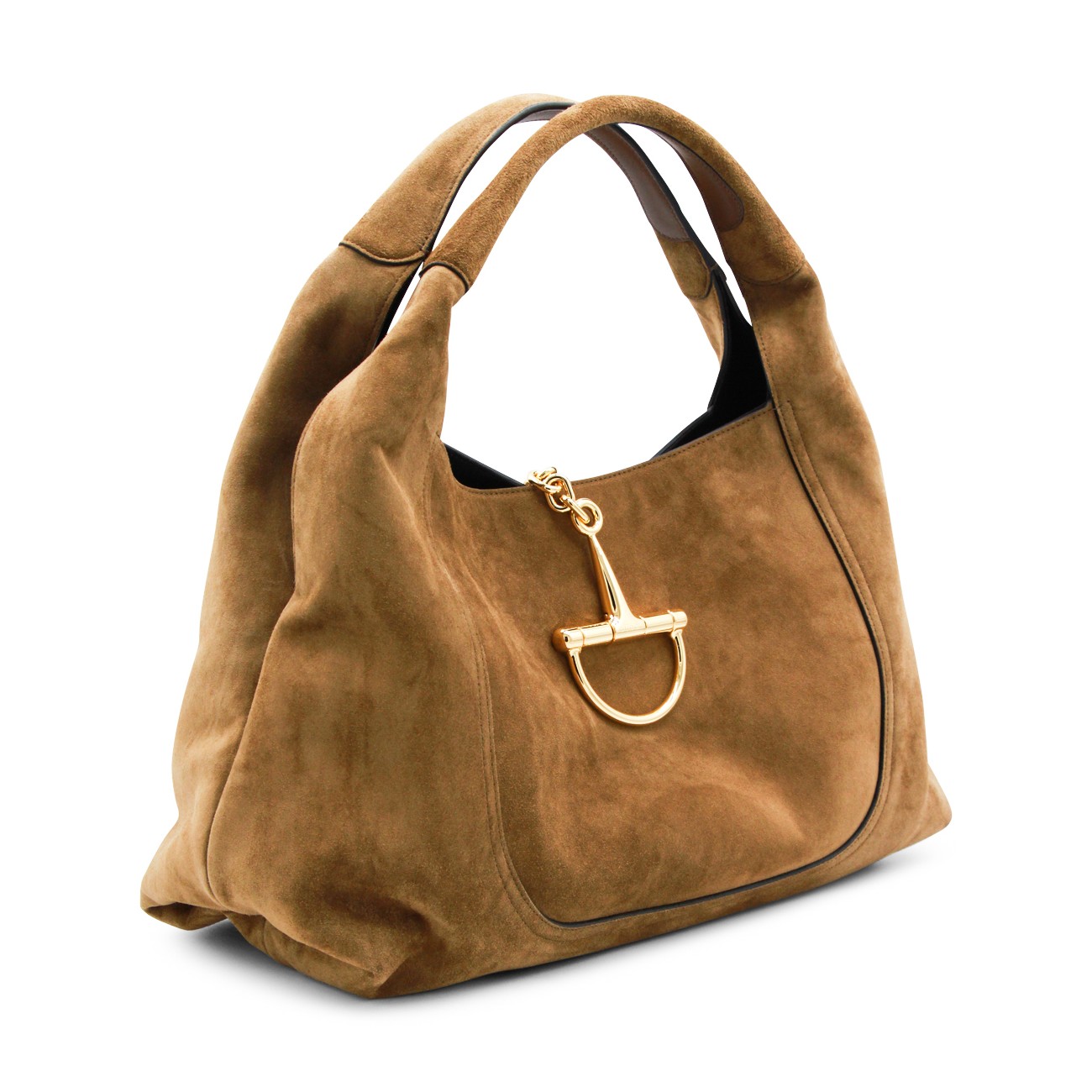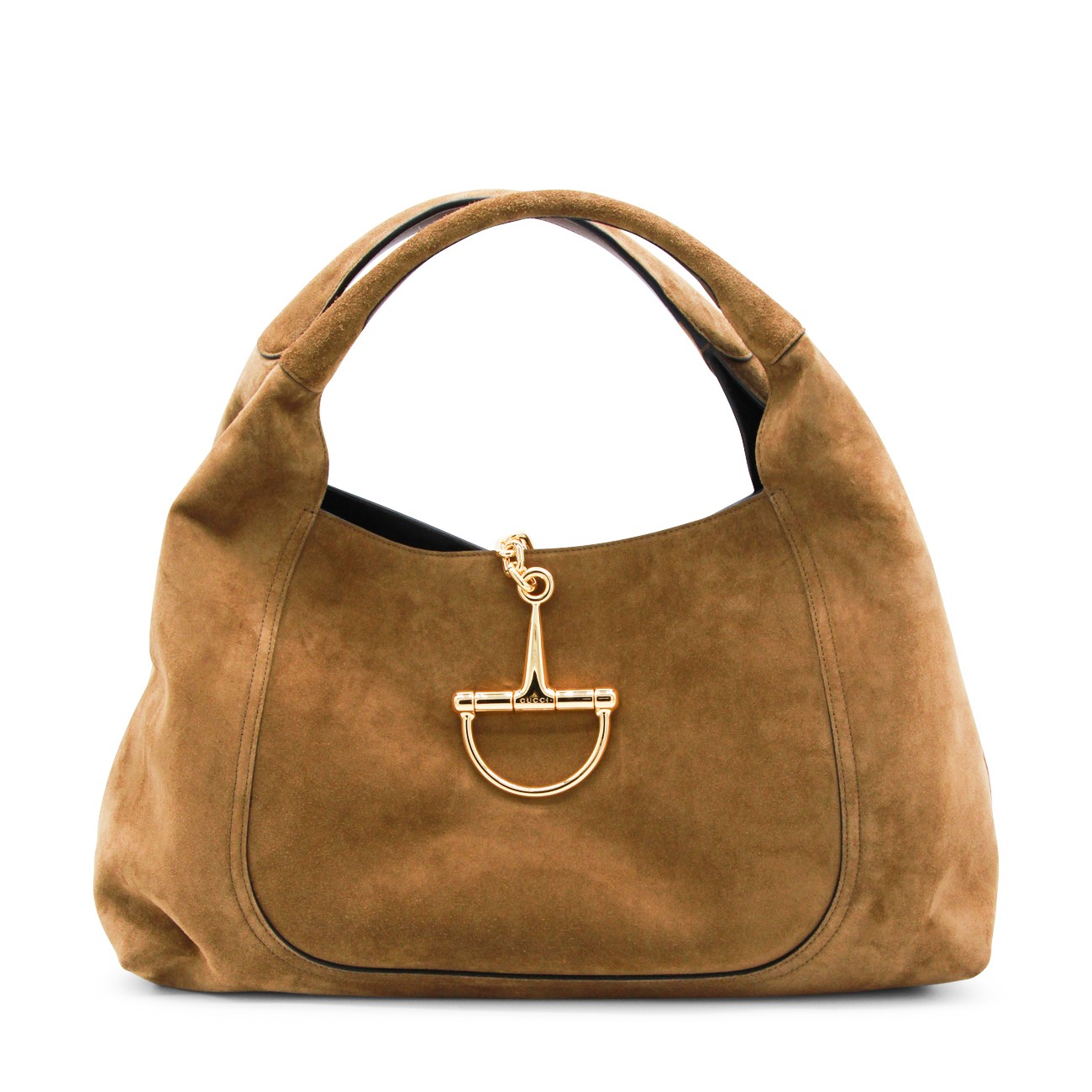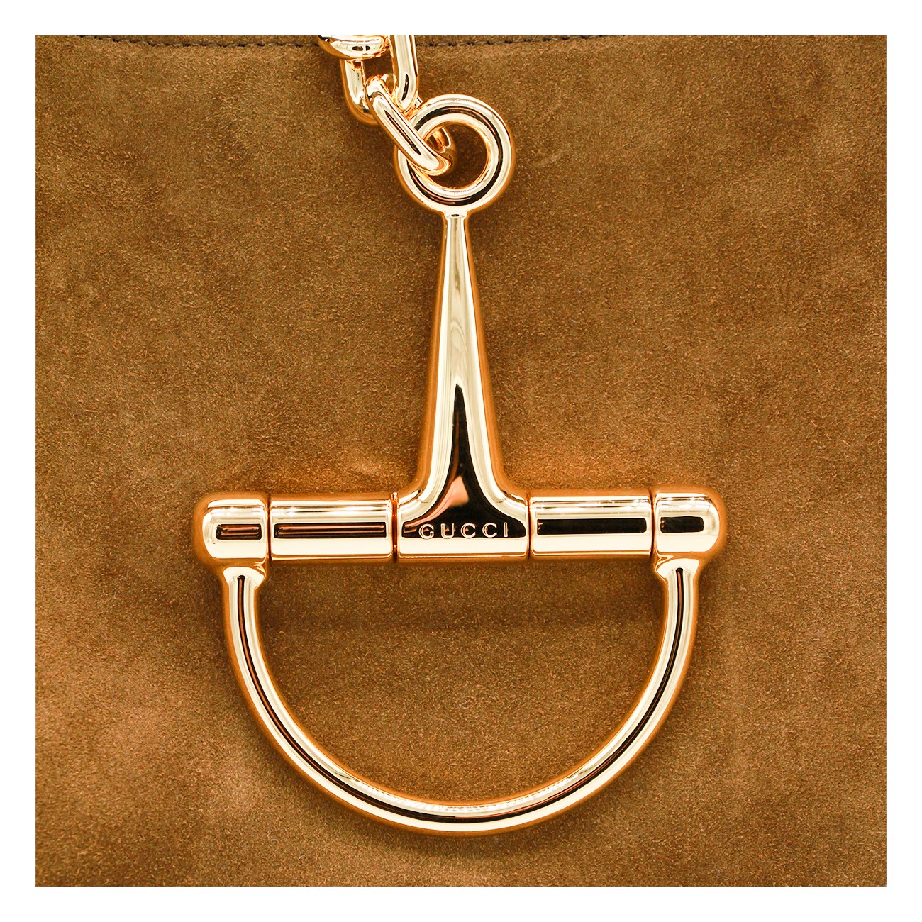 Brown suede Softbit tote from Gucci featuring top handle, gold tone hardware, upper fastening, inside pocker and grainy leather with a rich texture.