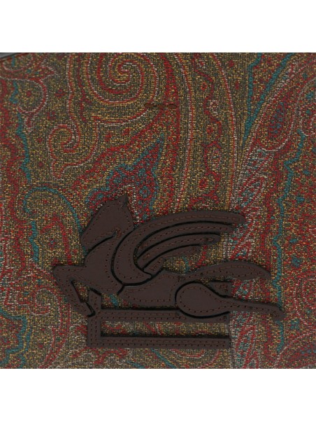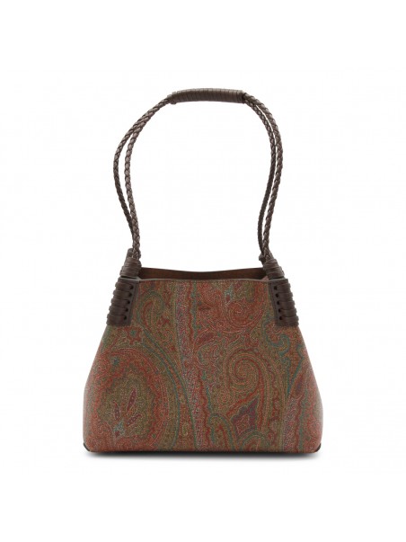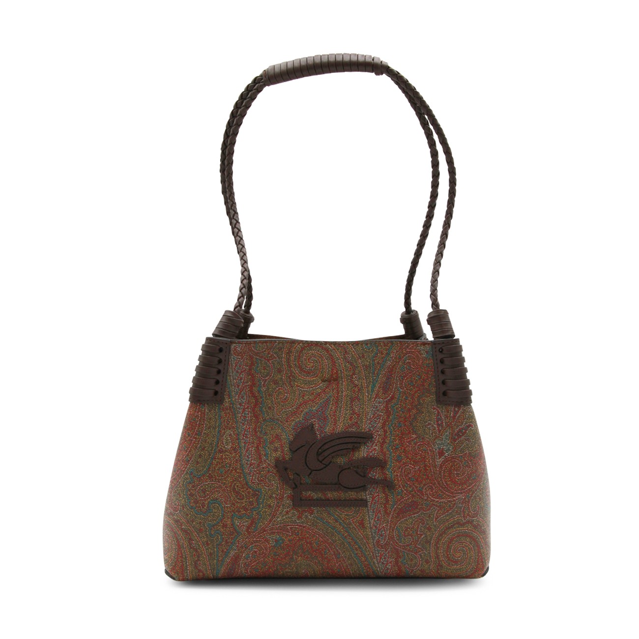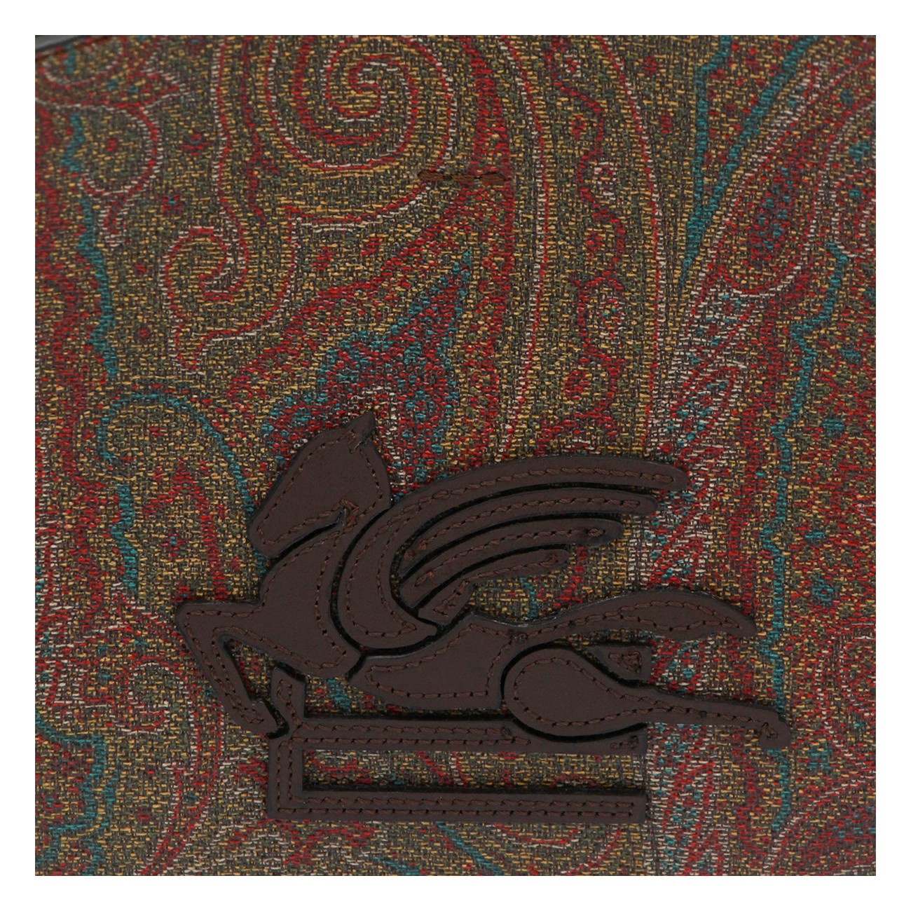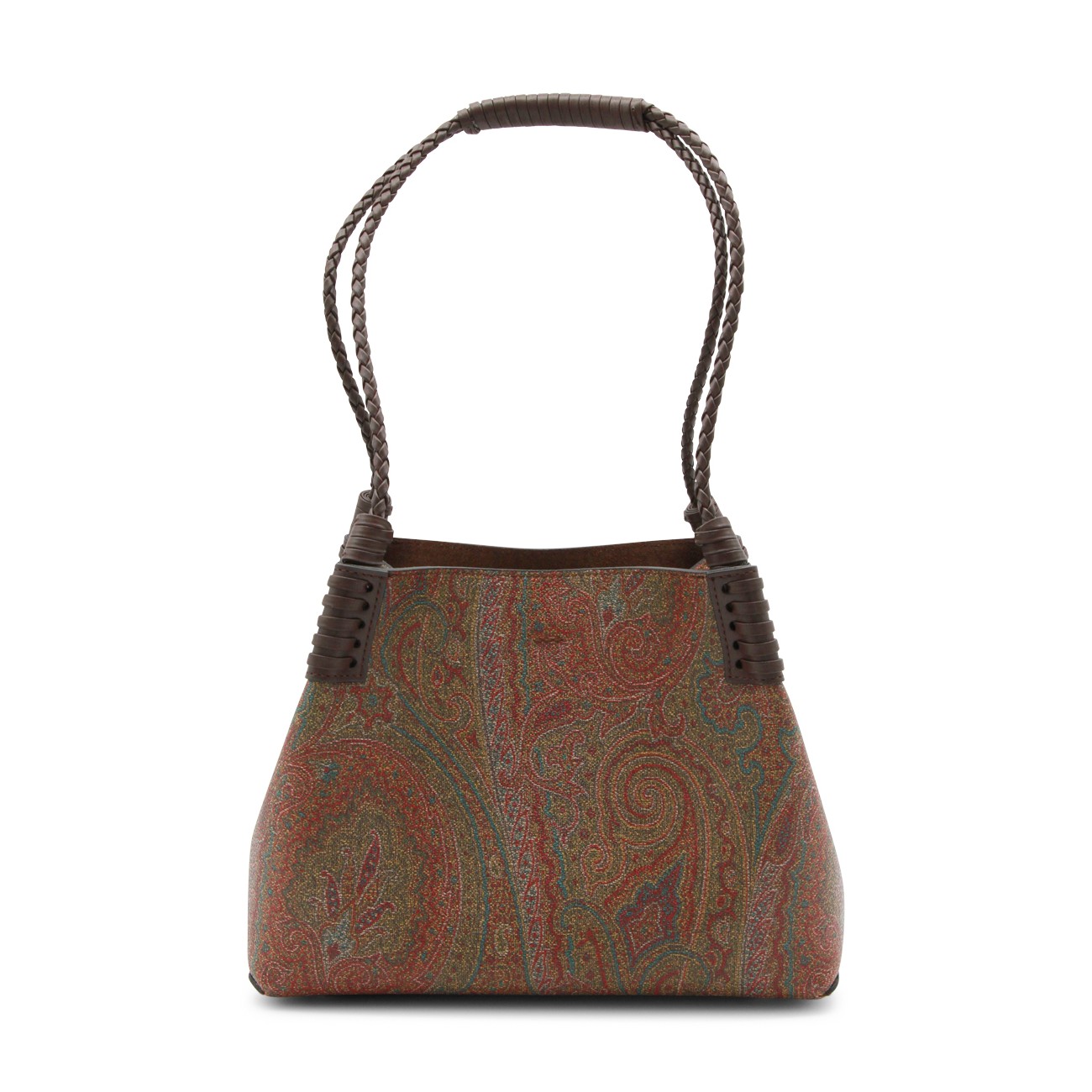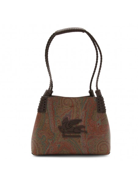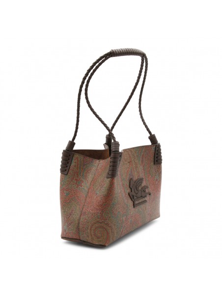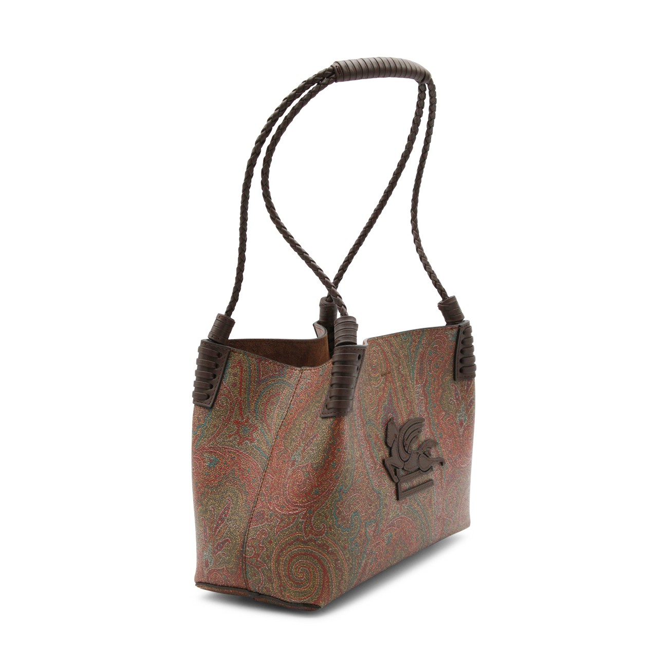 Brown tote from Etro featuring top handles, frontal logo, all over pattern and single compartment.
