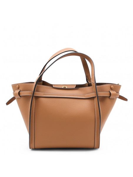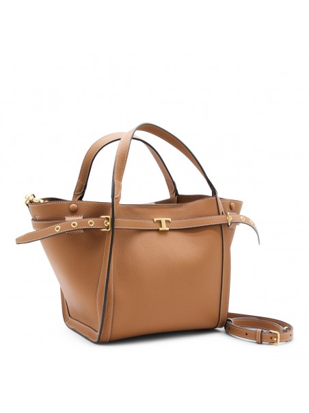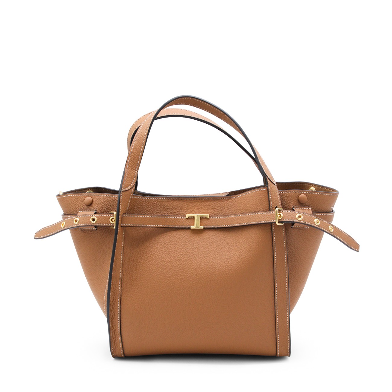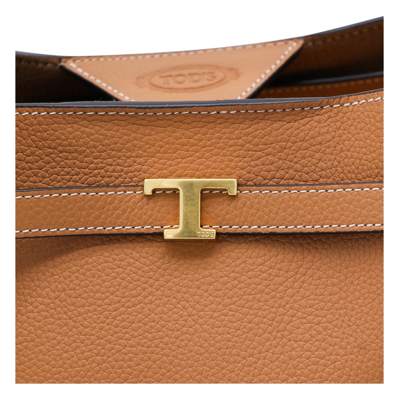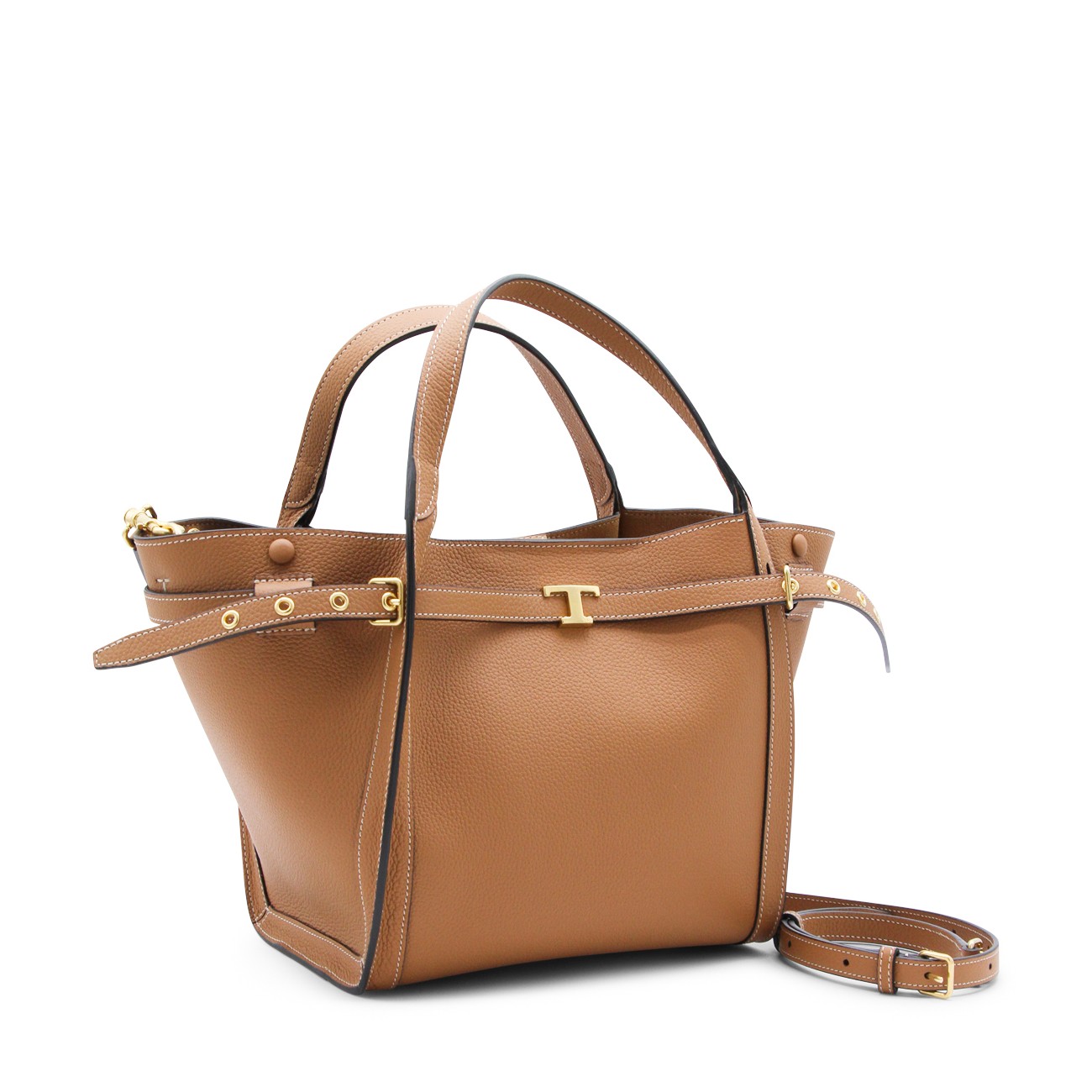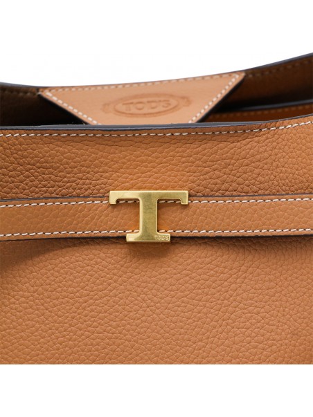 Brown leather tote from Tod's featuring top handles, adjustable and removable shoulder strap, T Timeless accessory strap, snap hook, covered snap closure and internal zipped pocket.