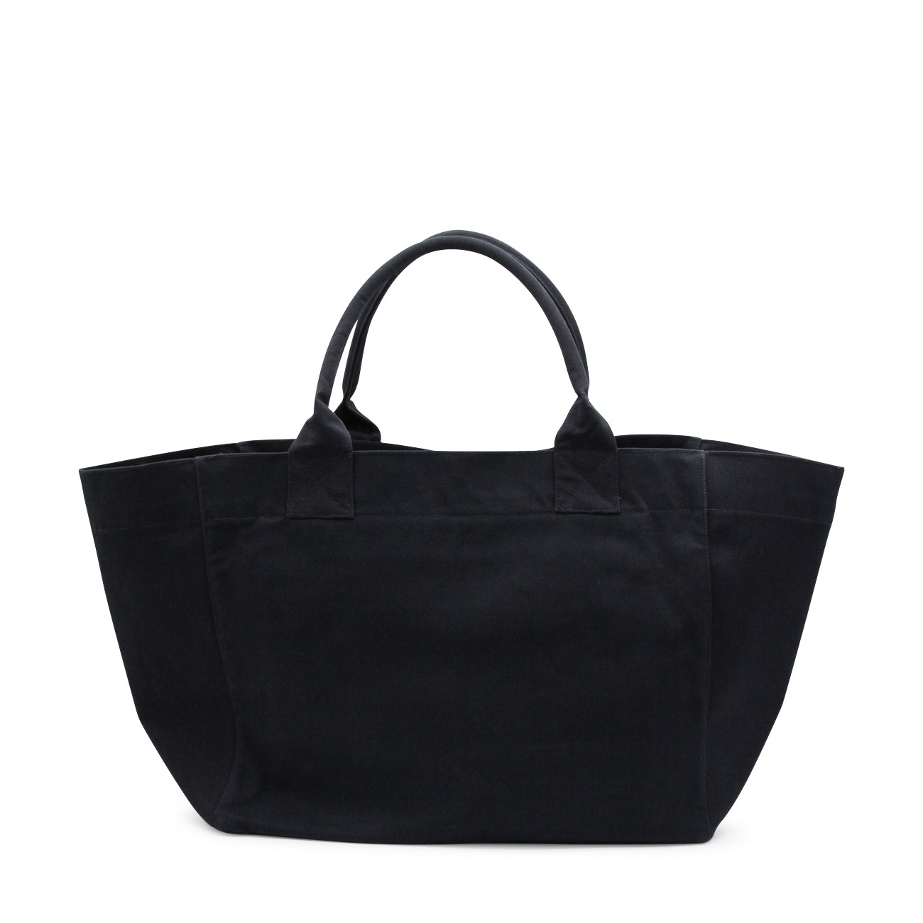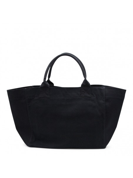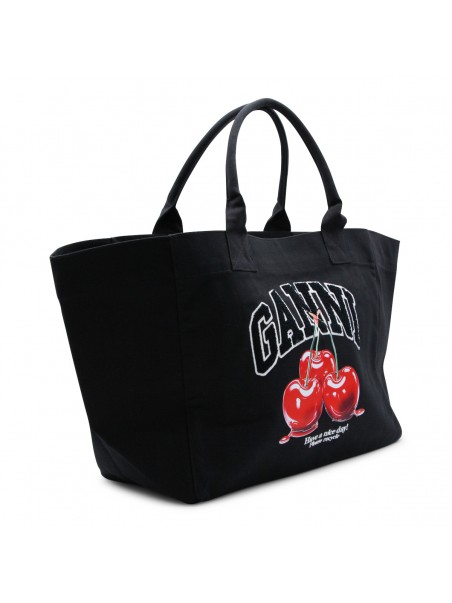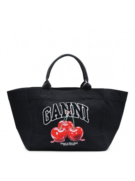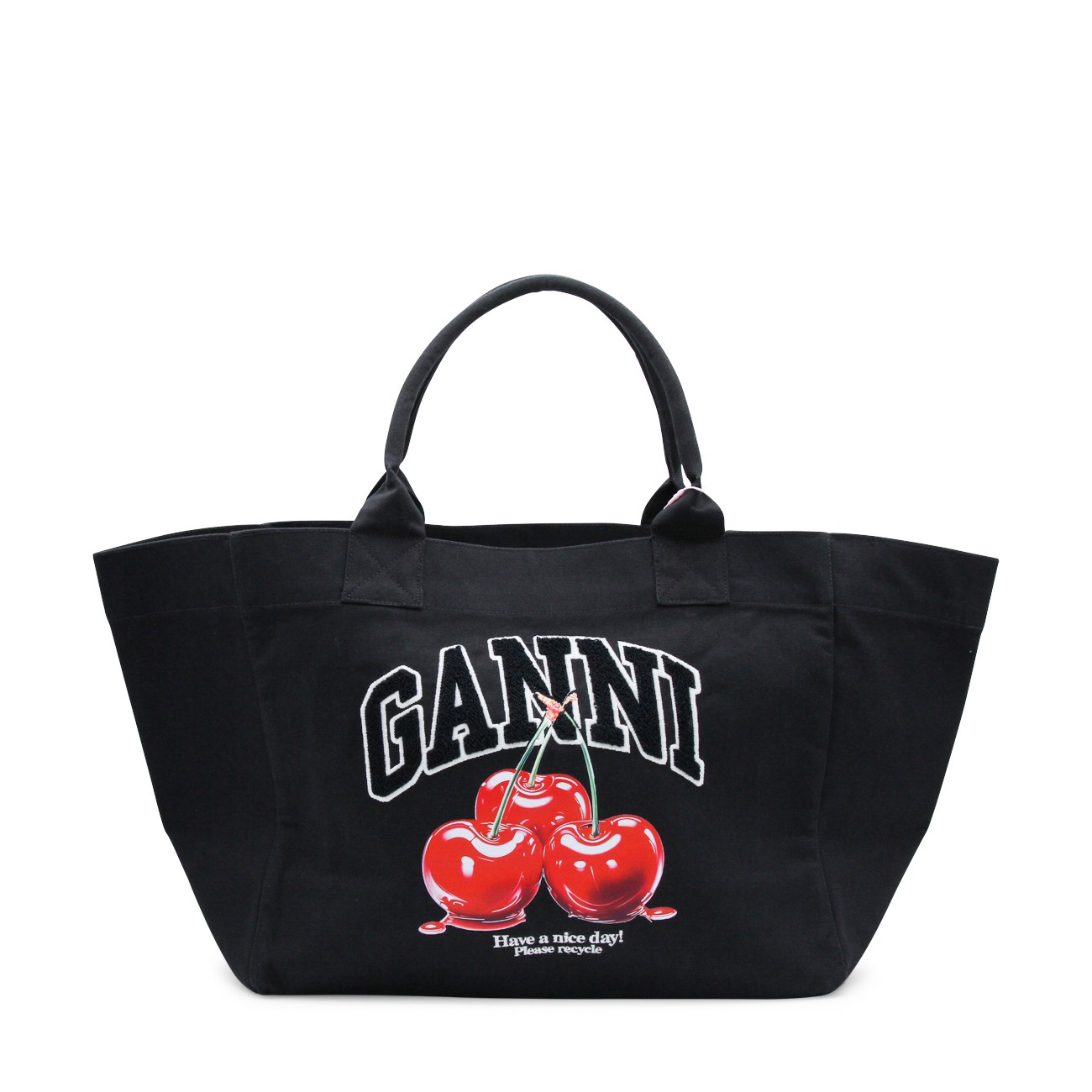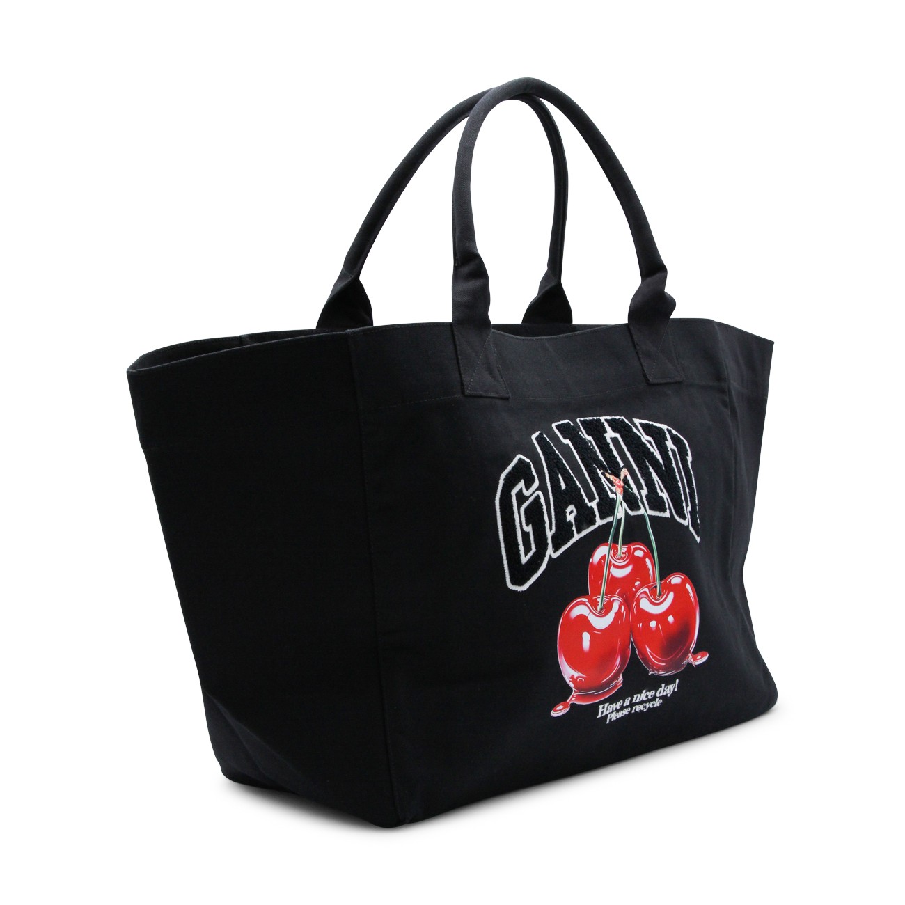 Black cotton tote from Ganni featuring top handles, cherry graphic print, embroidered logo, main compartmetn and inner zipped pocket.