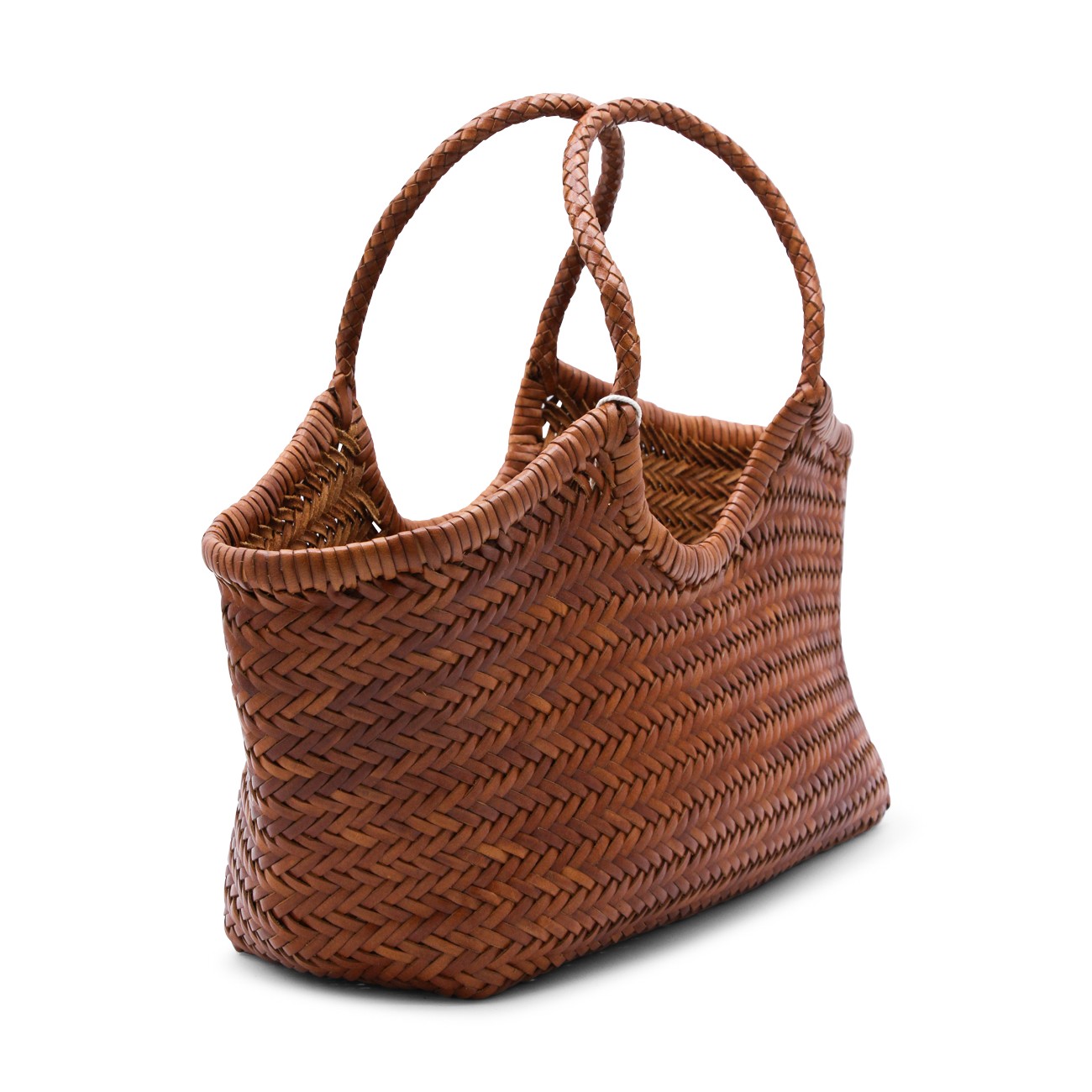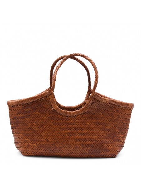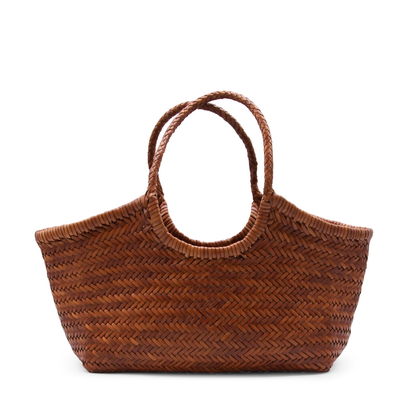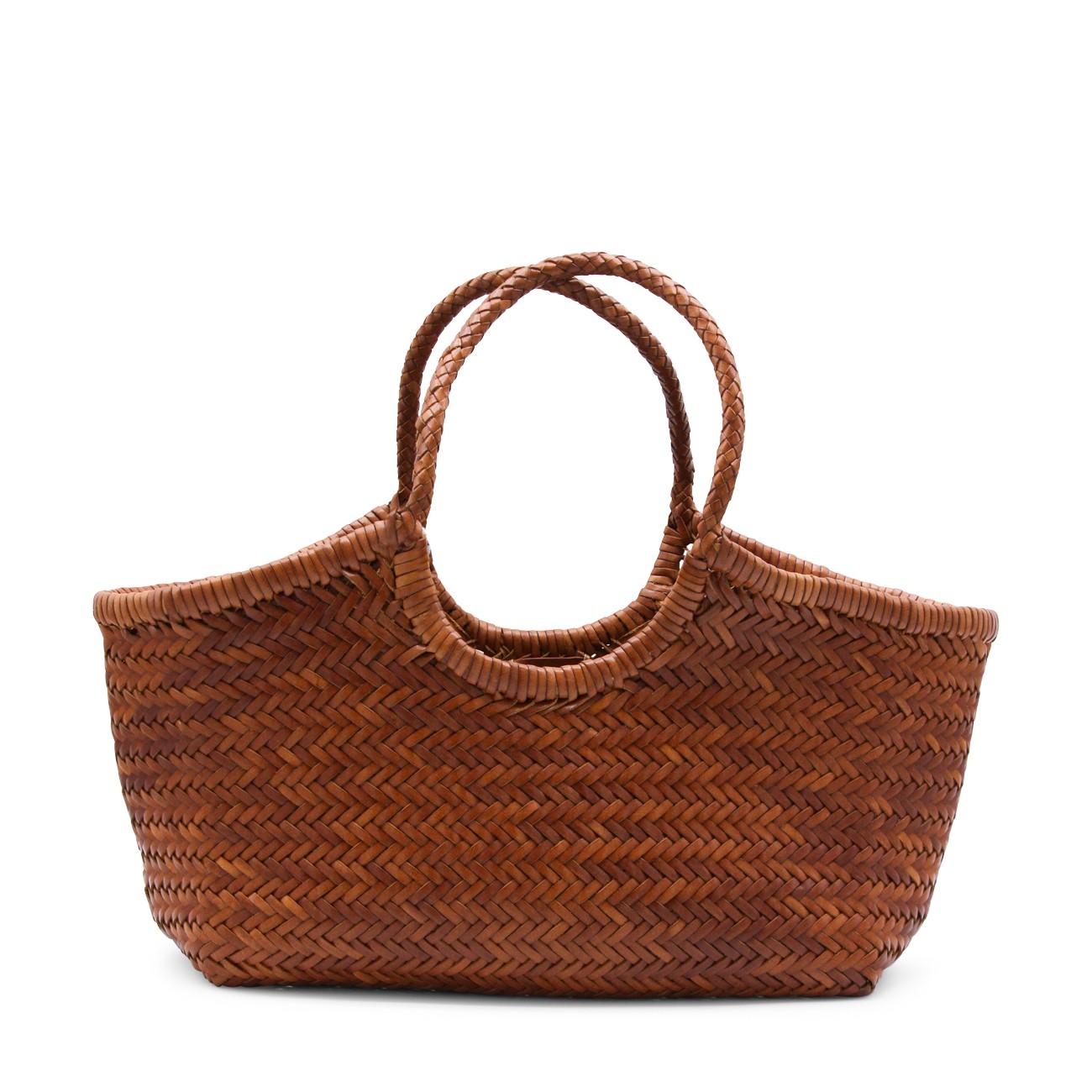 Tan leather nantucket basket big tote from Dragon Diffusion featuring top handles, main compartment and upper fastening