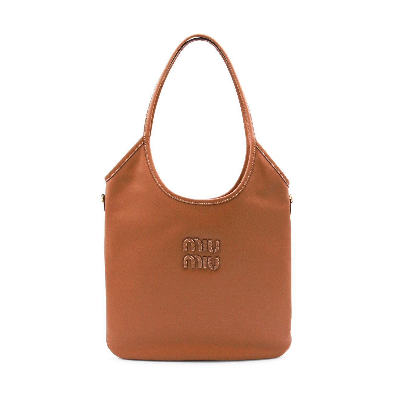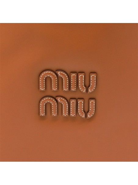 Brown Ivy leather totes from Miu Miu featuring top handles, frontal lettering patch logo, gold tone hardware and inside pocket.