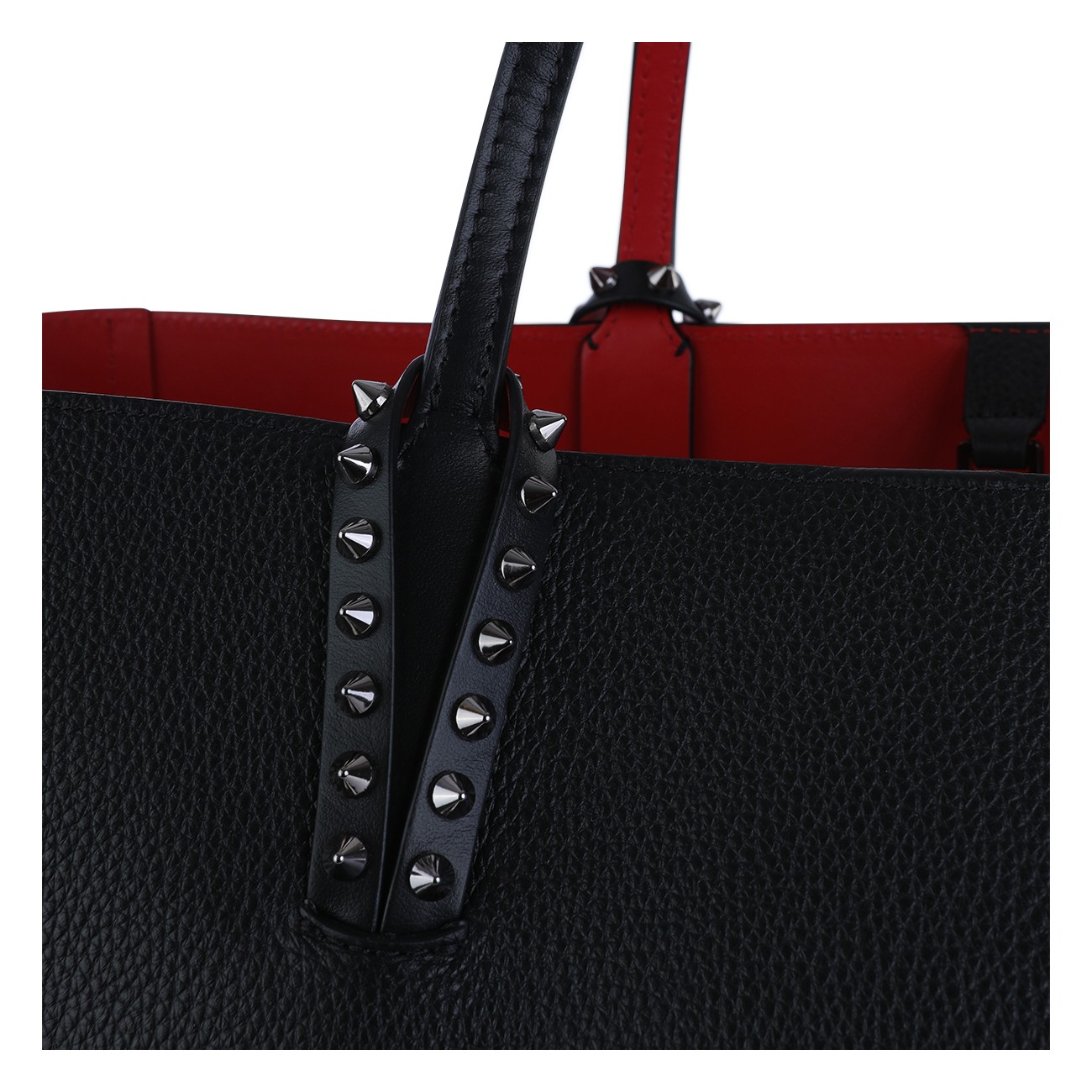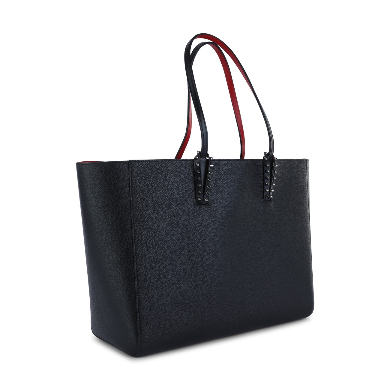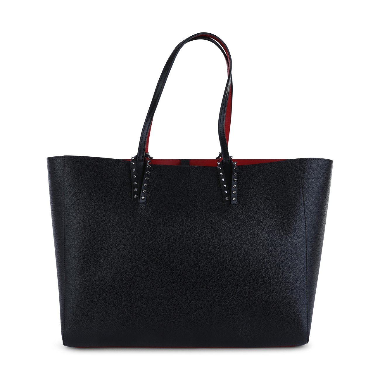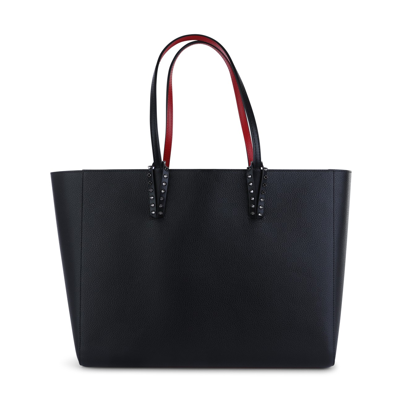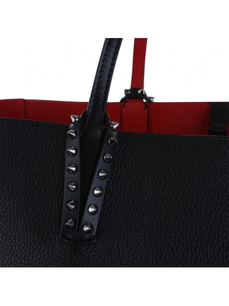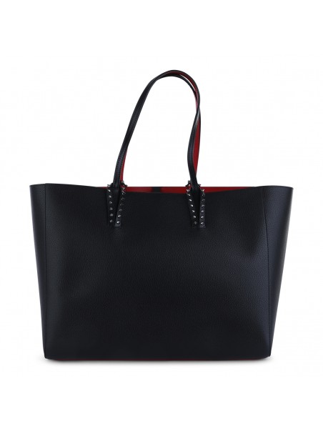 Black calf leather and spikes cabata soft large tote bag from Christian Louboutin featuring flat top handles, main compartment, top zip fastening, removable pouch and spike stud detailing.