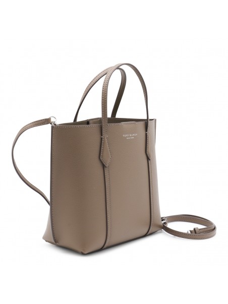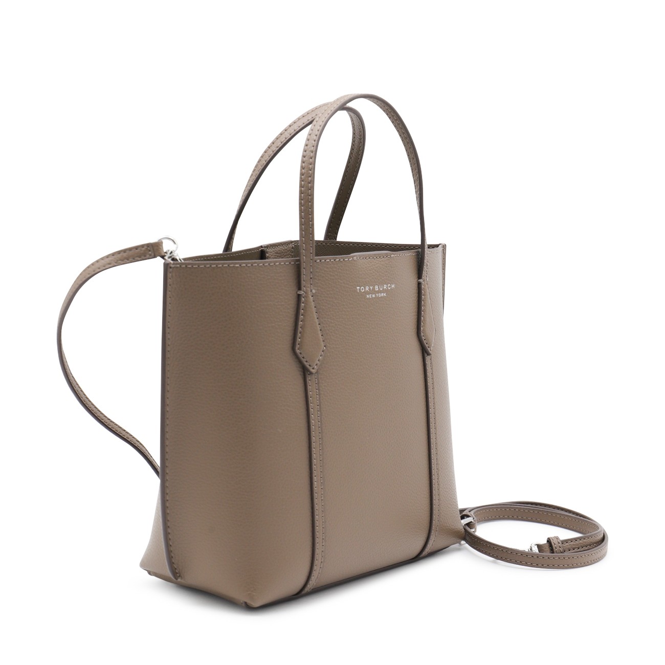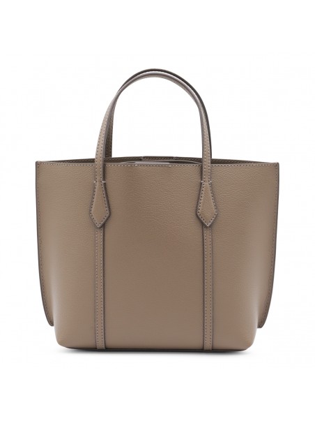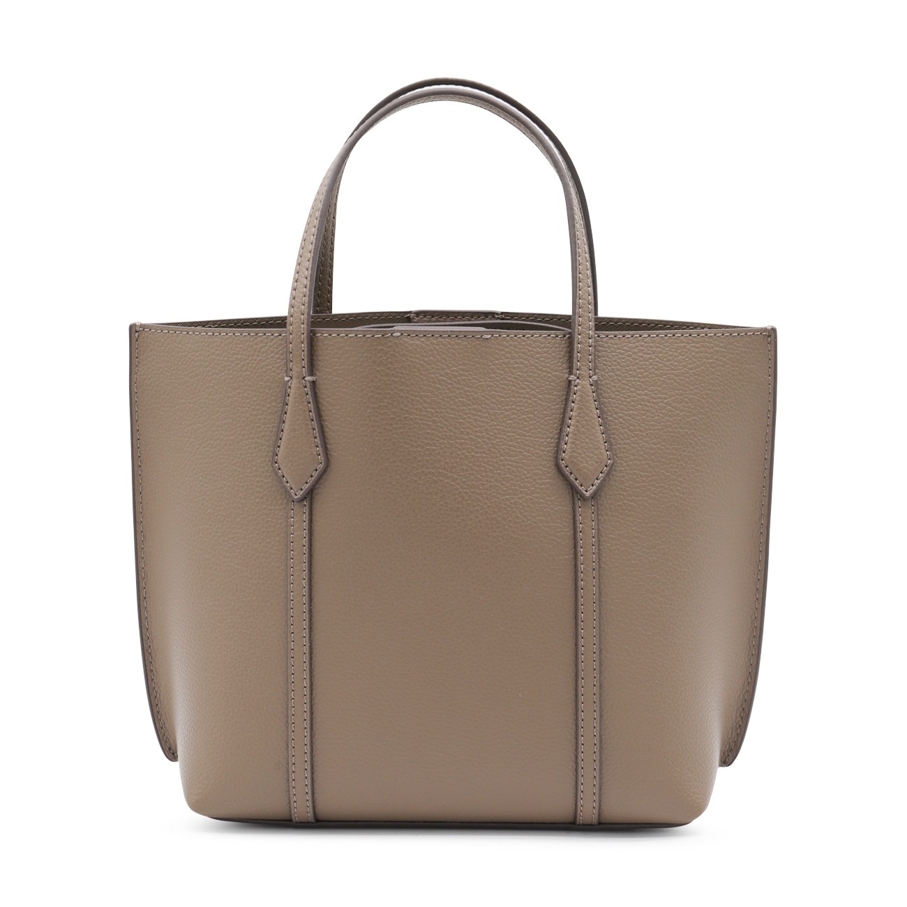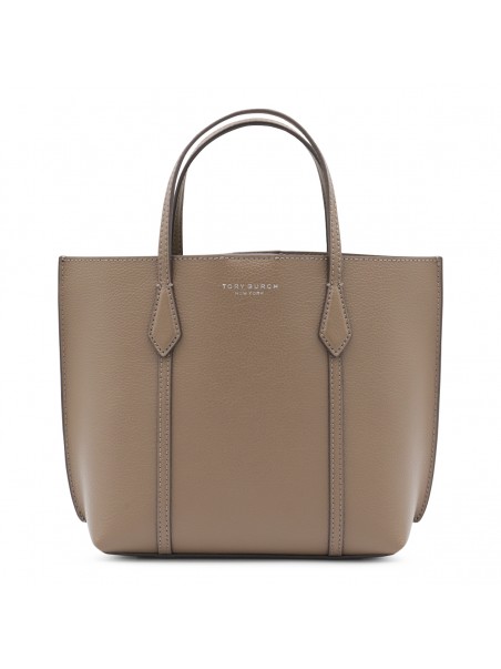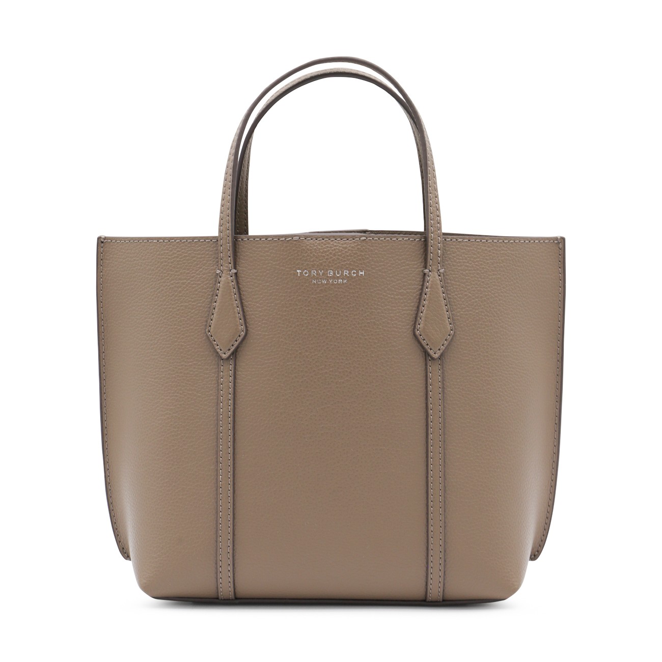 Brown leather Perry tote bag from Tory Burch featuring top handles, printed logo, adjustable and removable shoulder strap and compartments.