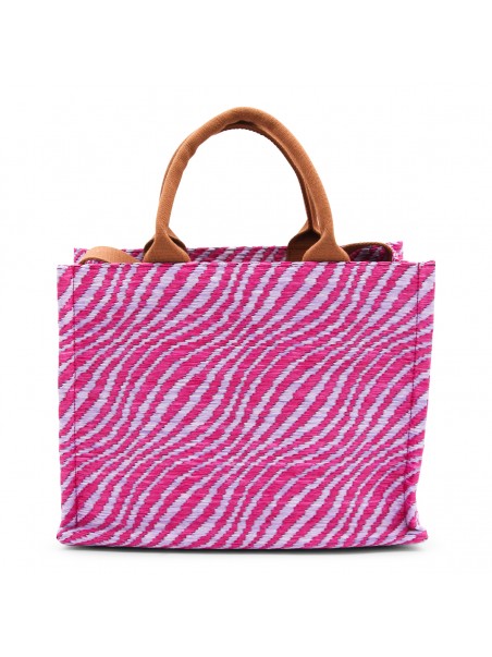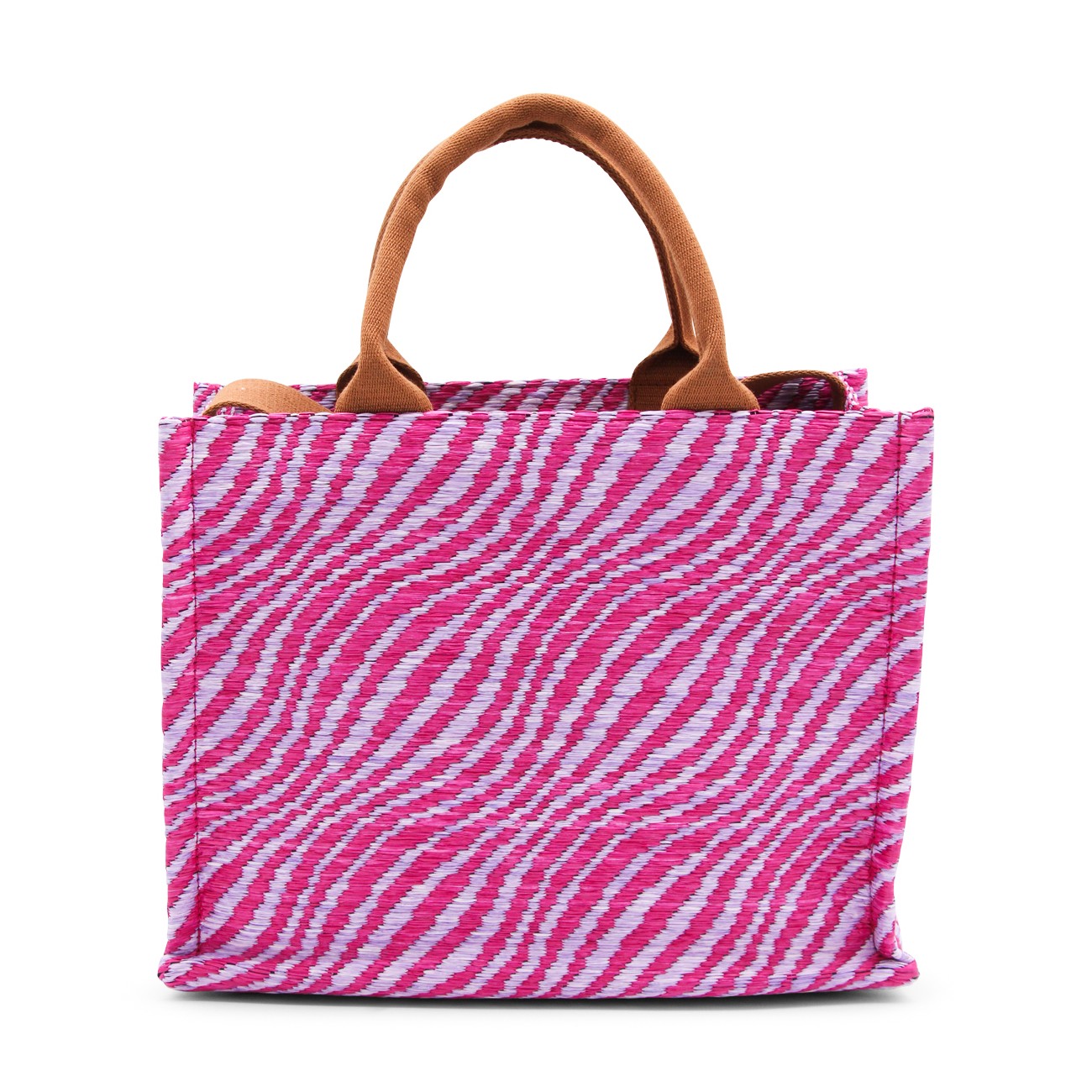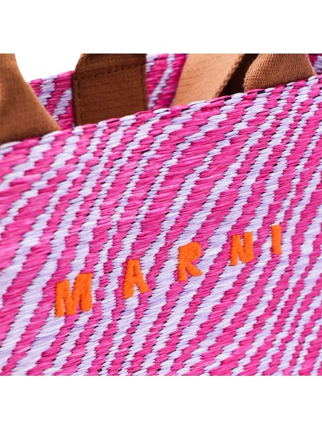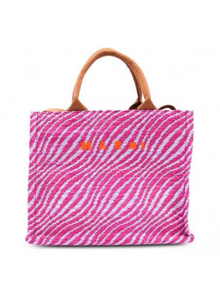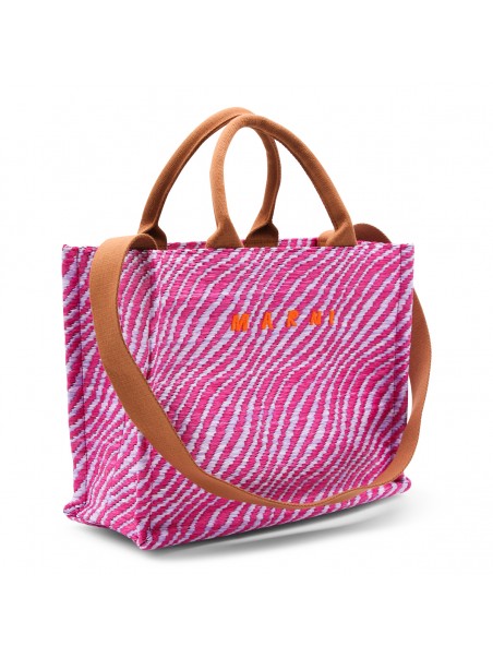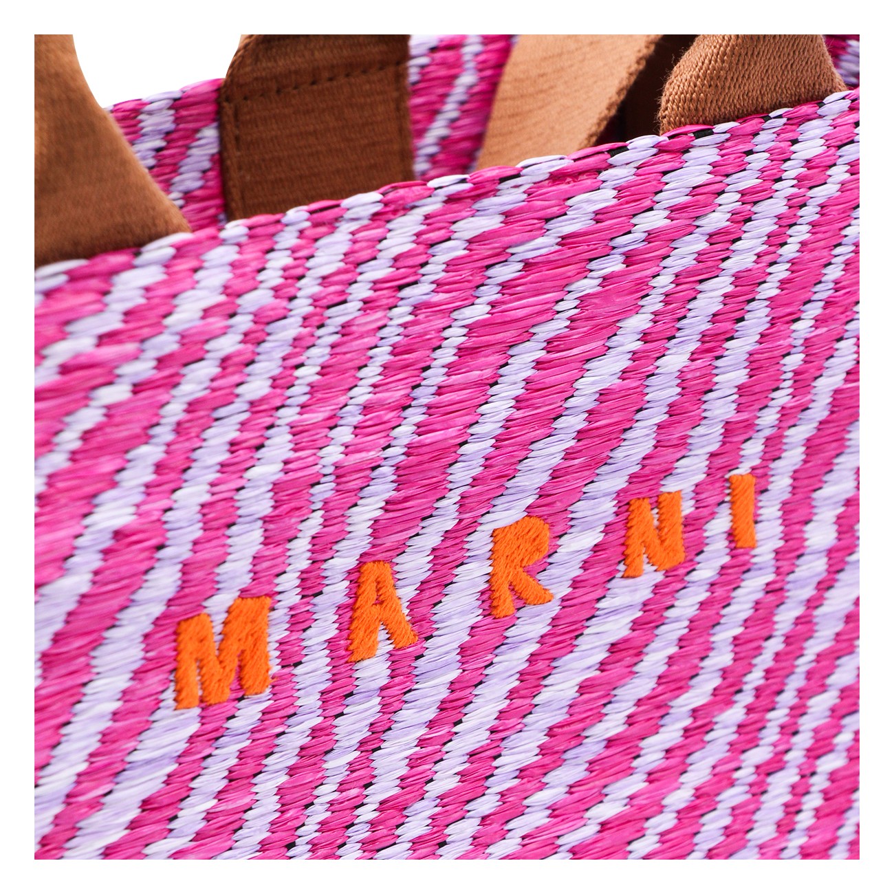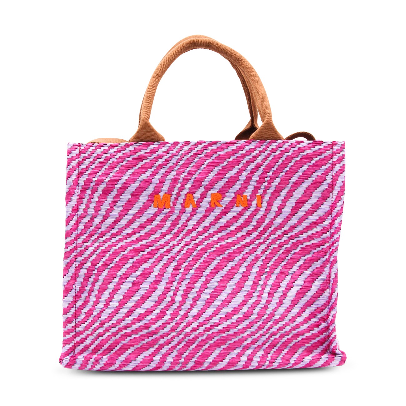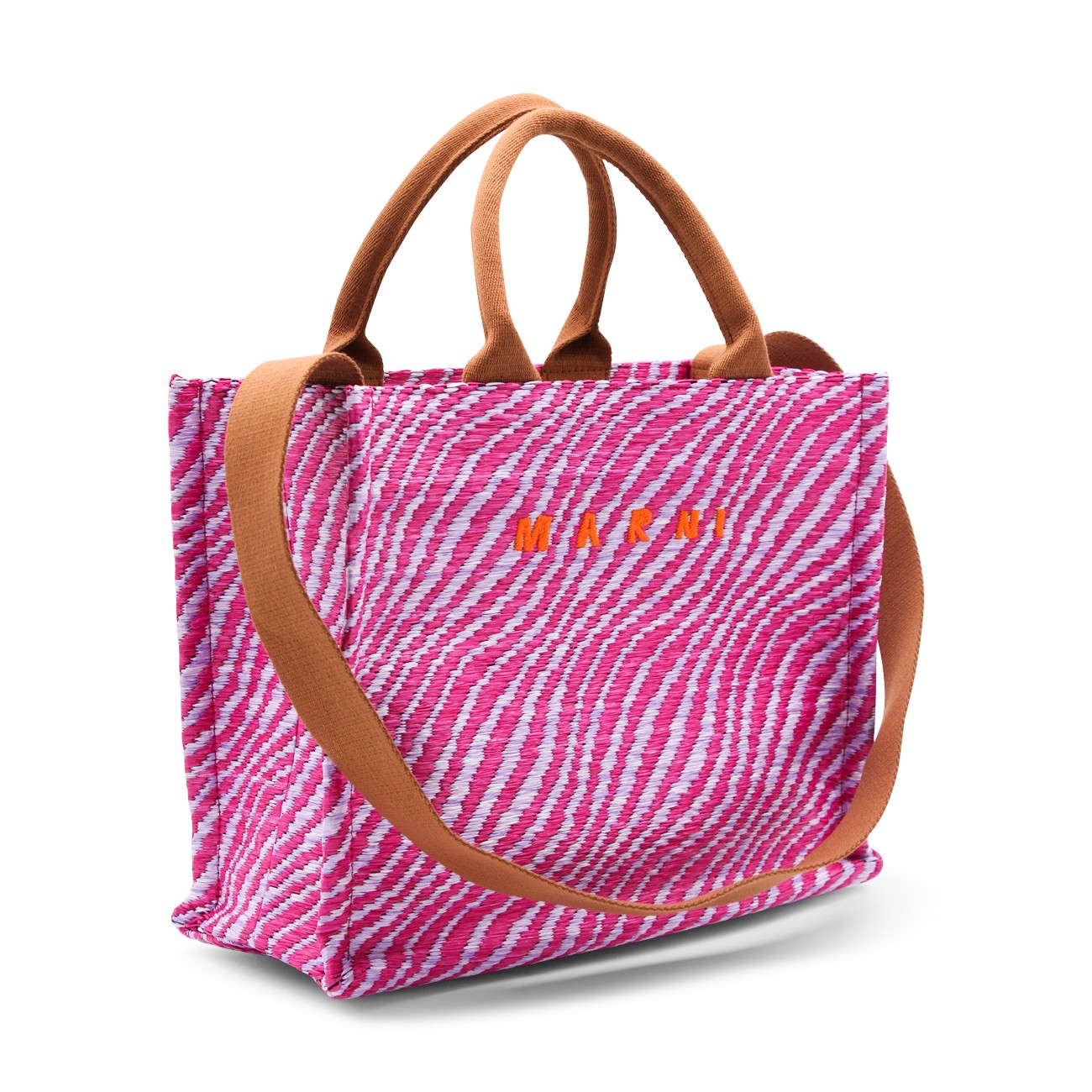 Pink tote from Marni featuring top handles, strap, frontal logo, all over pattern and main compartment.