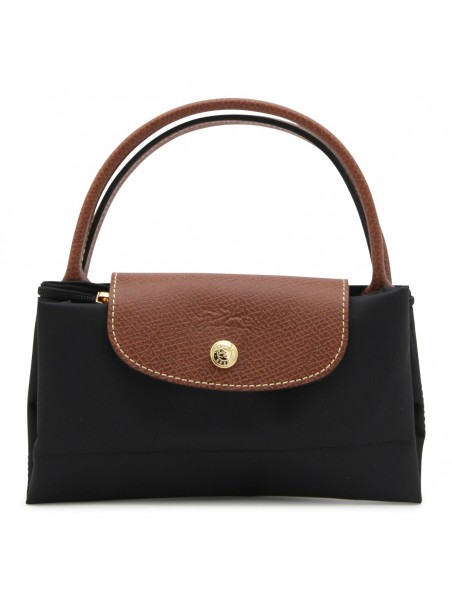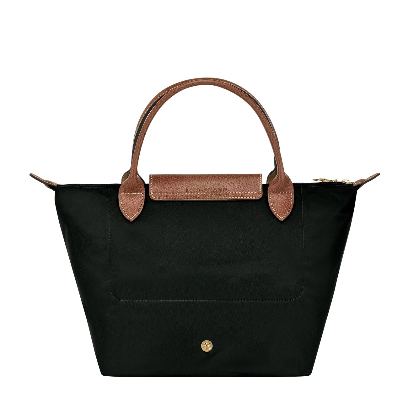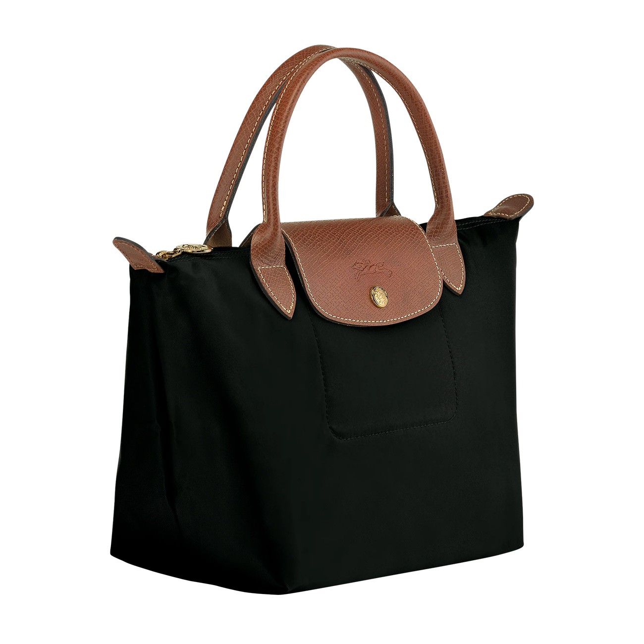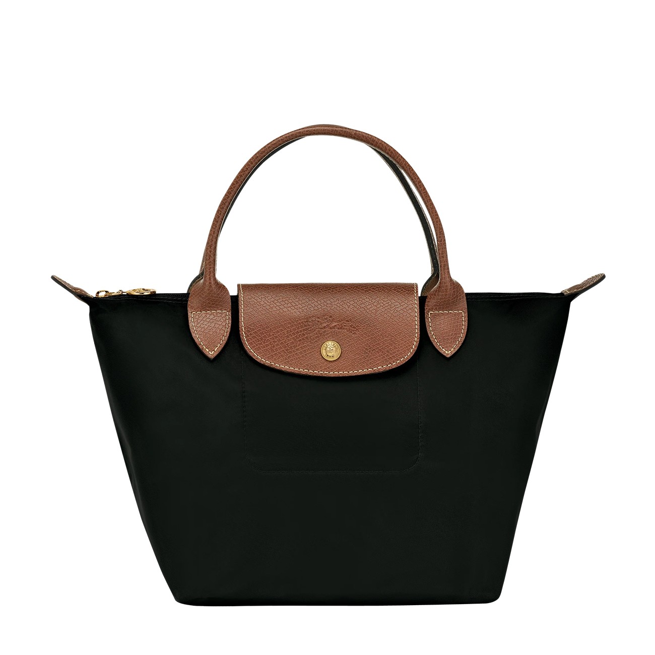 Black canvas Le Pliage tote bag from Longchamp featuring round top handles, a foldover top with snap closure, a top zip fastening and gold-tone hardware.