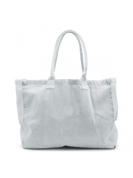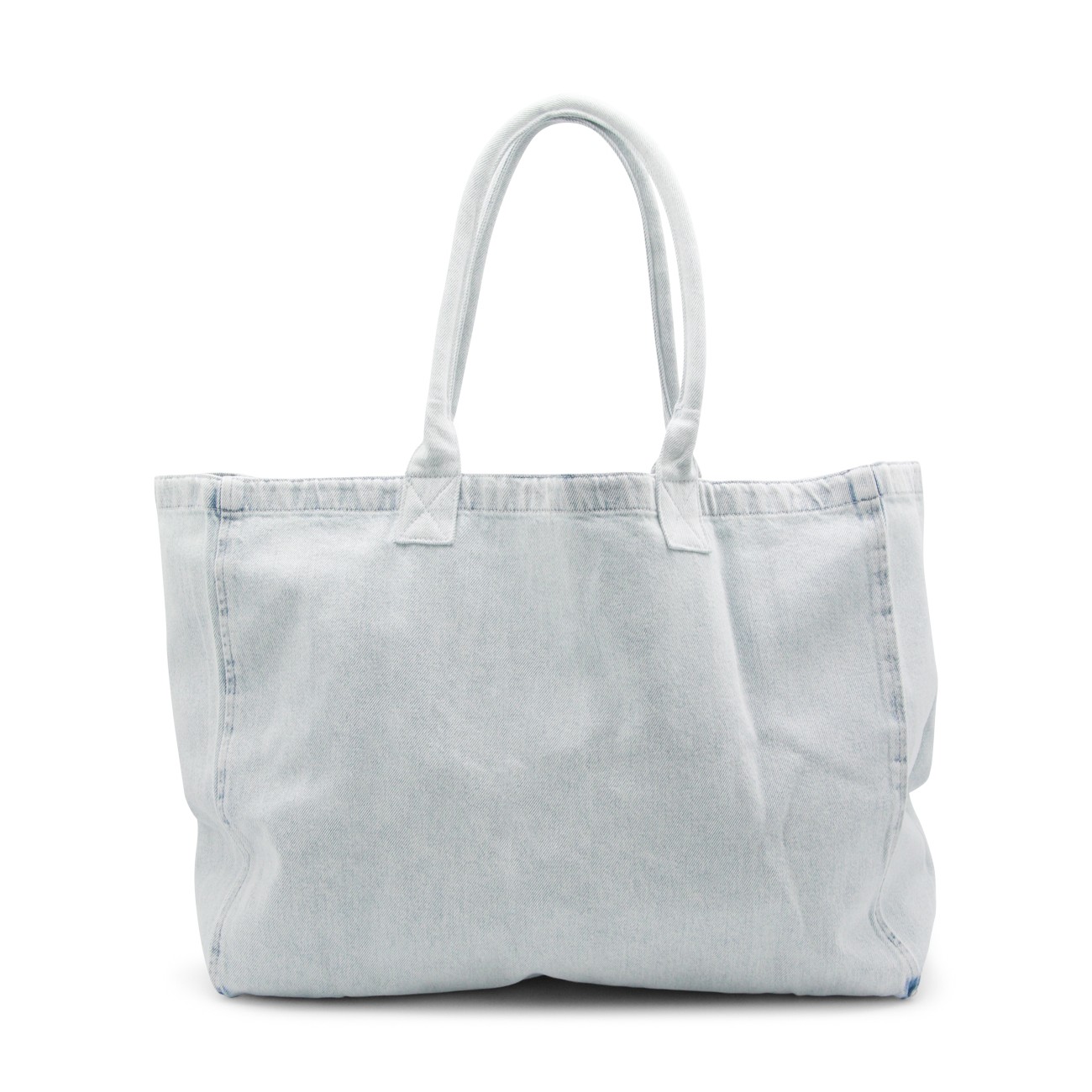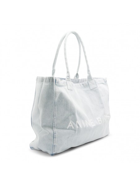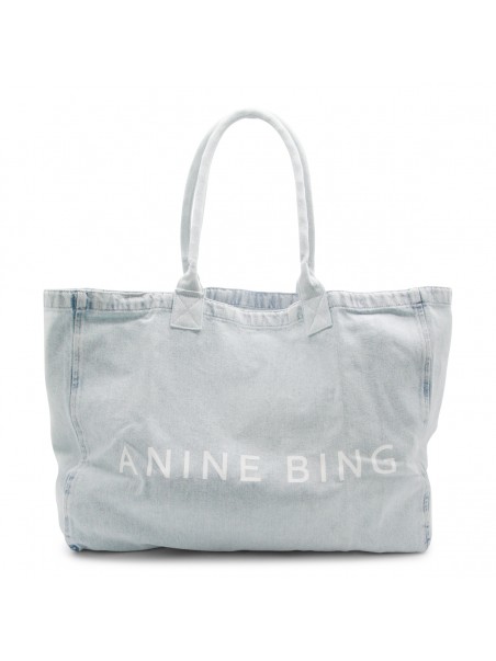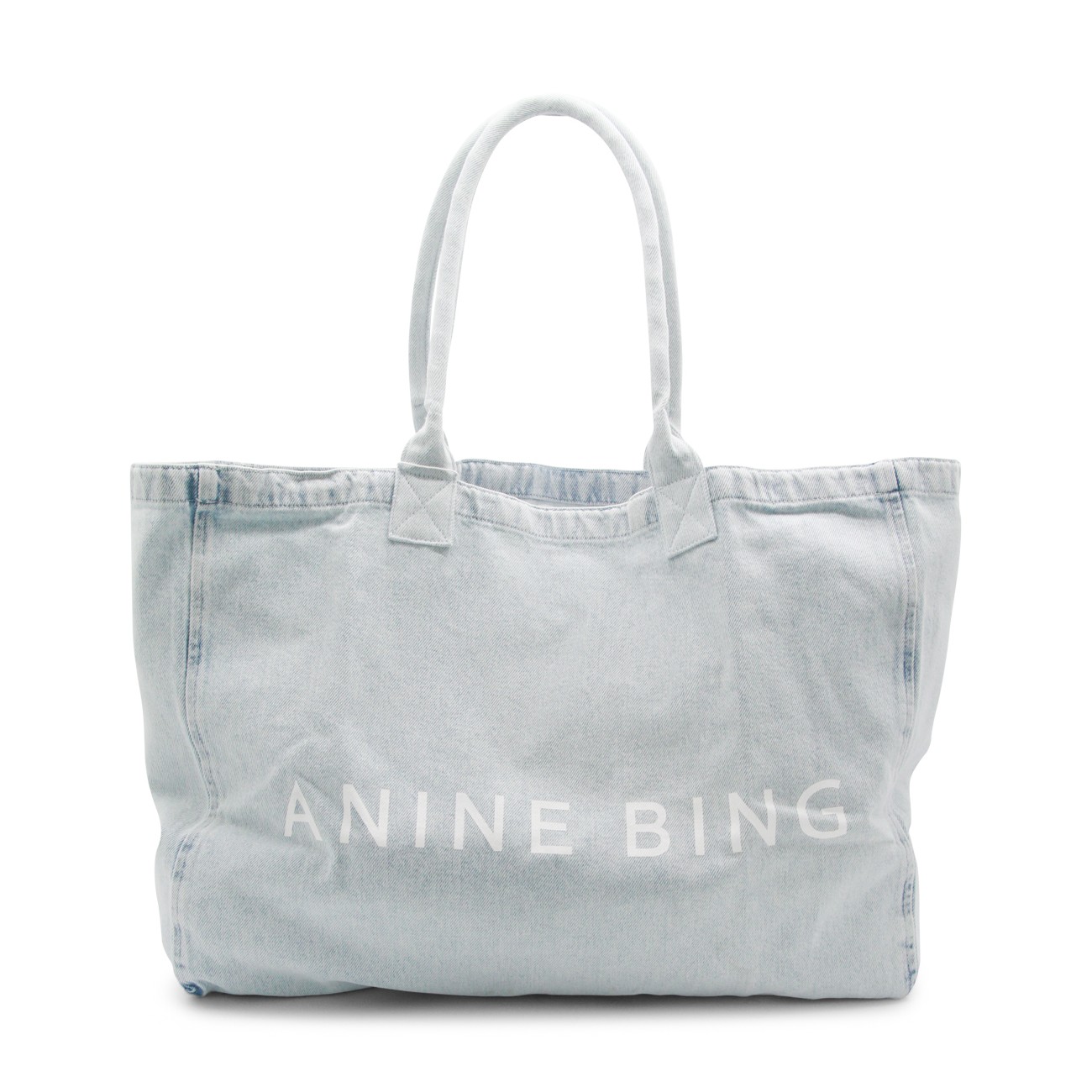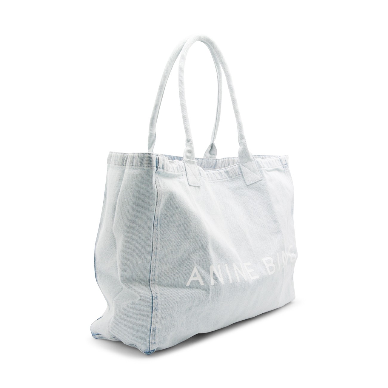 Blue denim Leo tote bag from Anine Bing with double handles, main compartment, logo lettering at front and used effect.