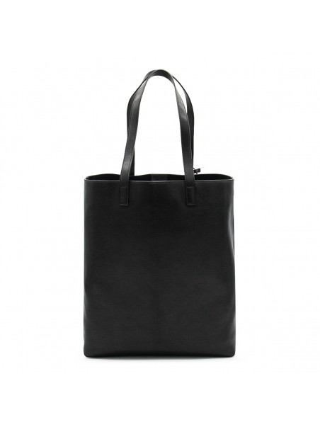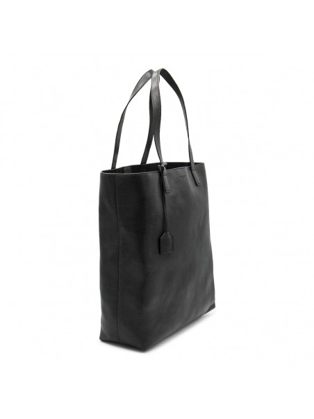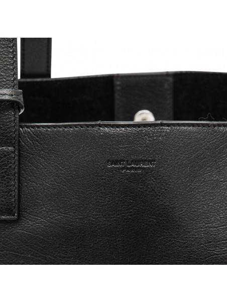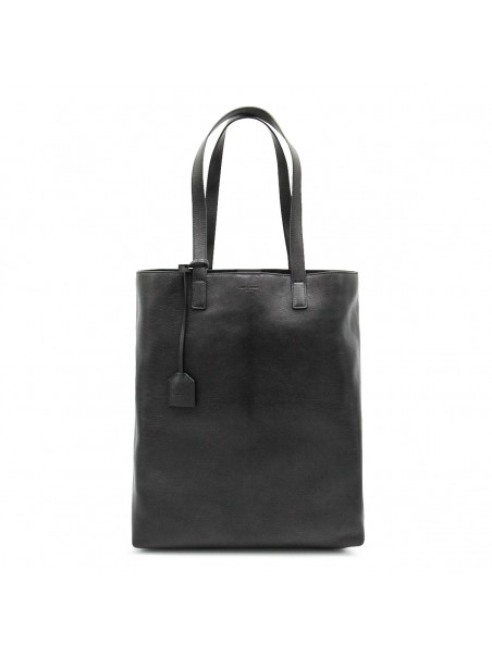 Black leather totes from Saint Laurent featuring top handles, inside pockets and keyring detail.