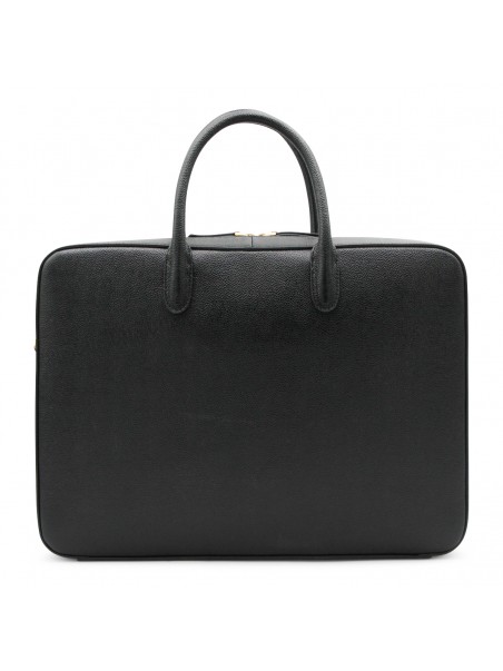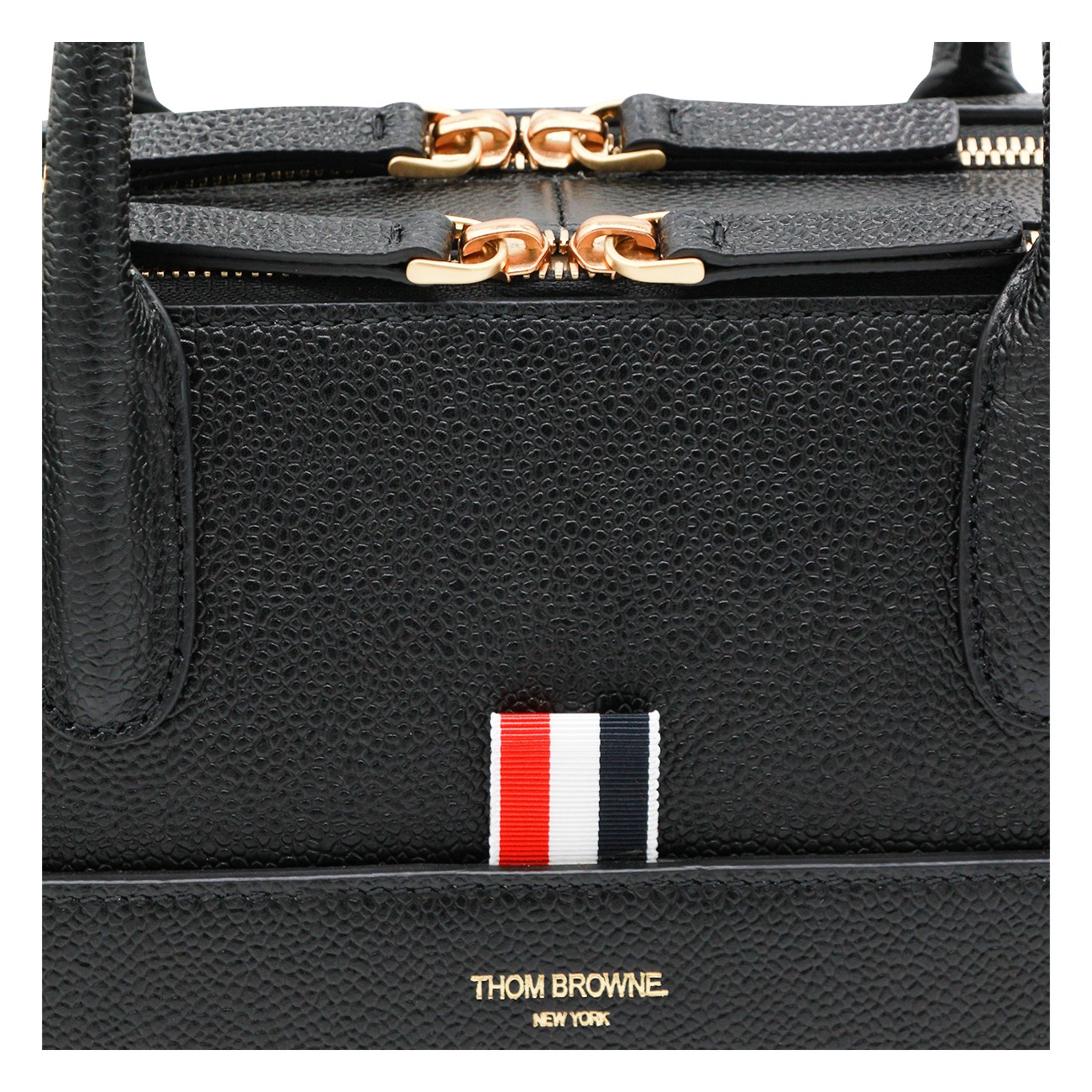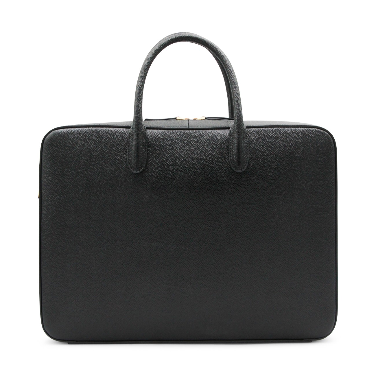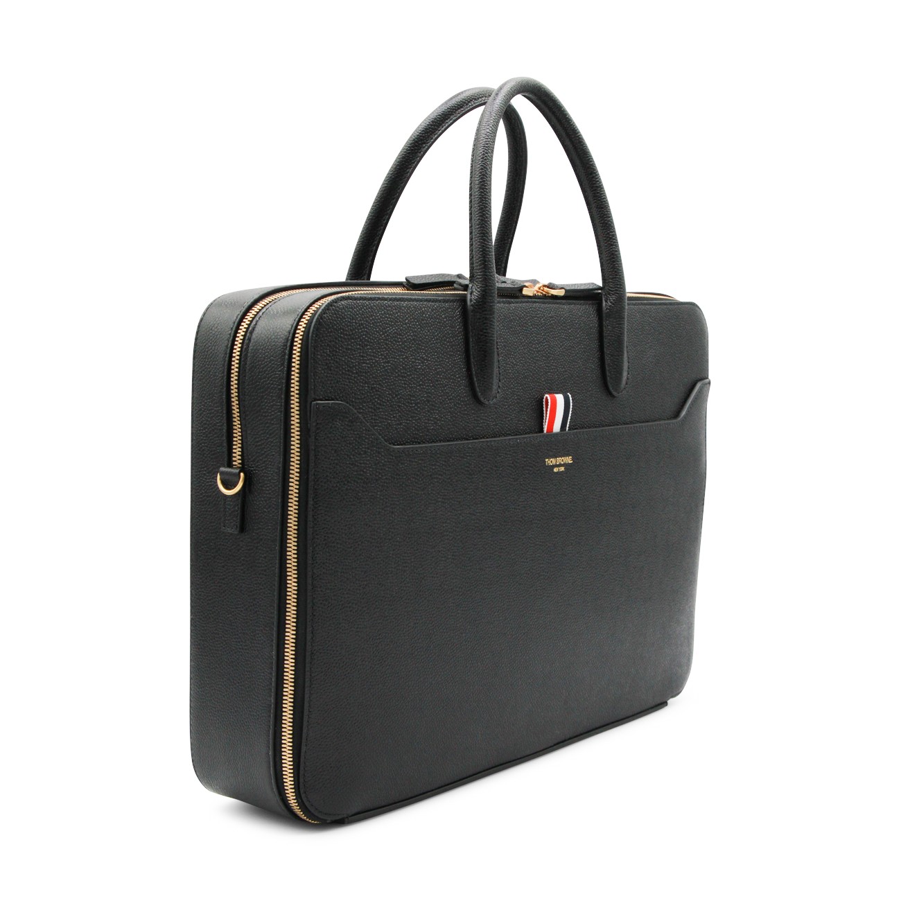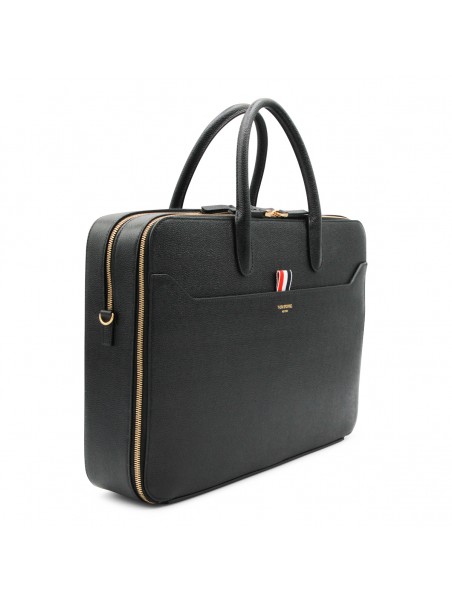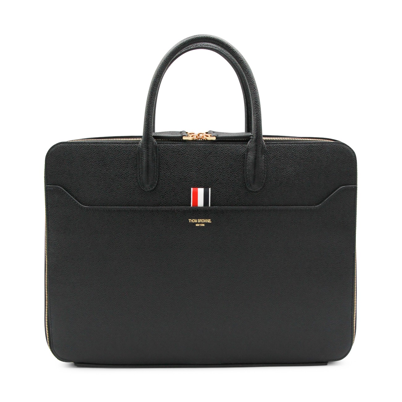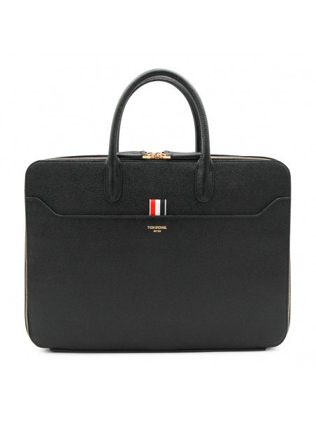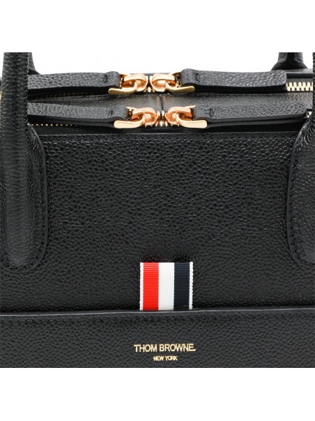 Black tote from Thom Browne featuring top handles, zip fastening, frontal pocket and gold tone hardware.