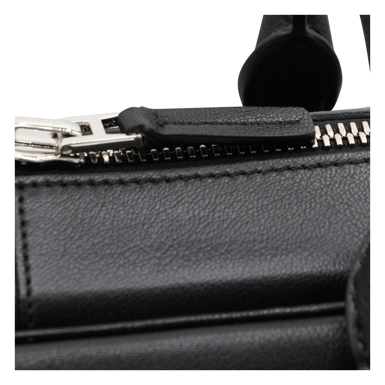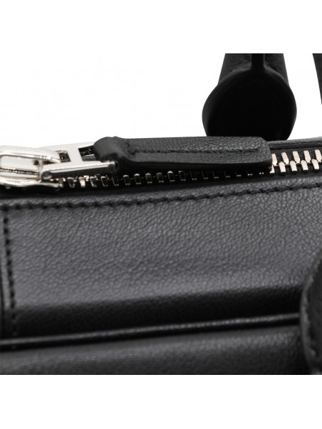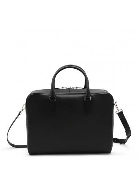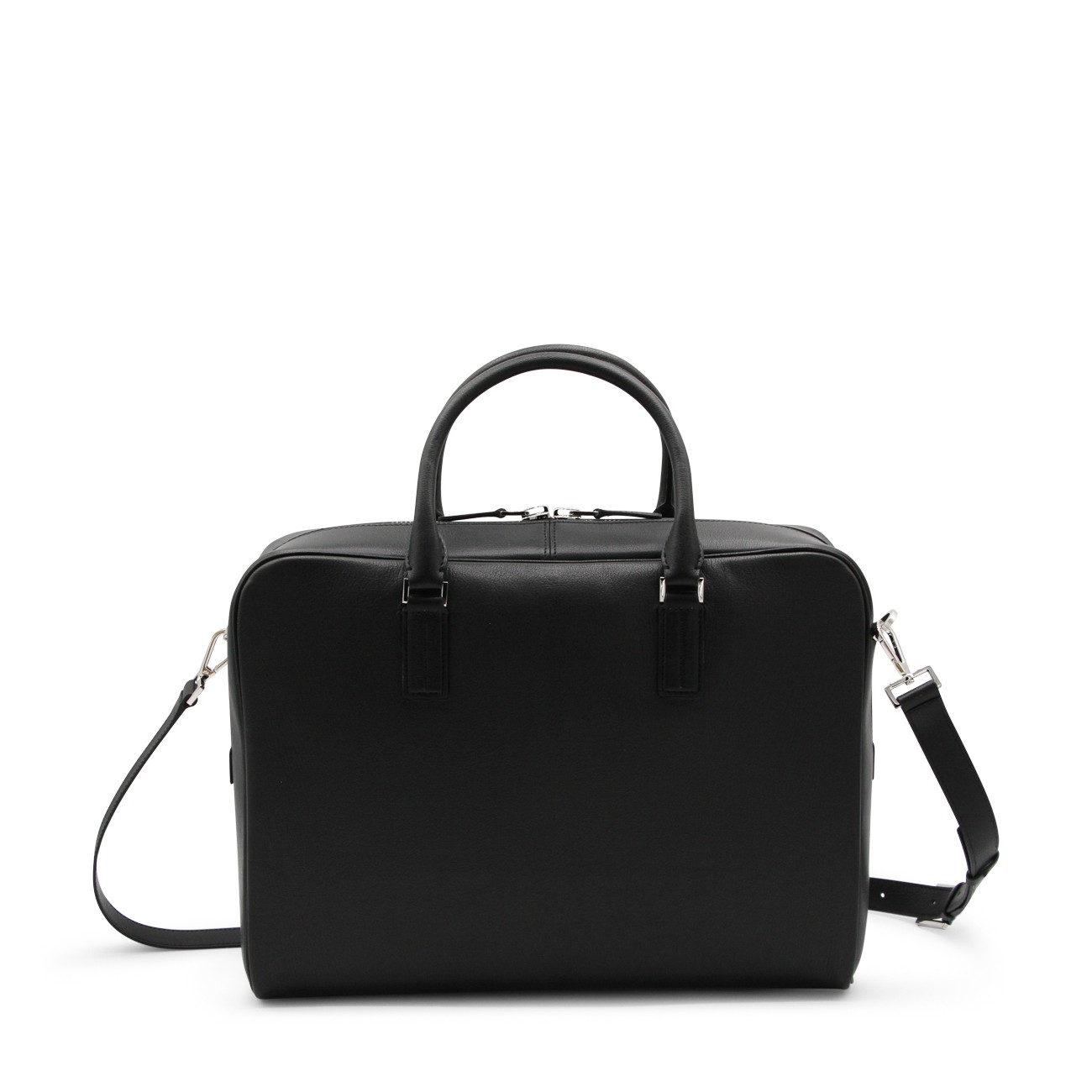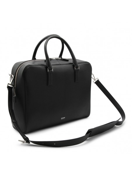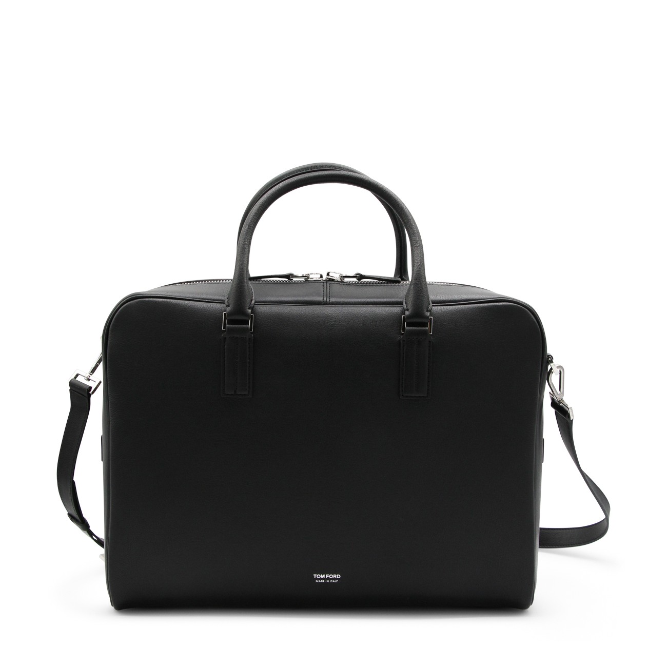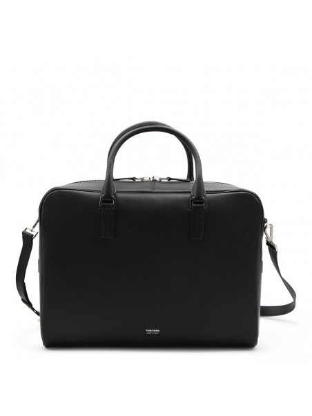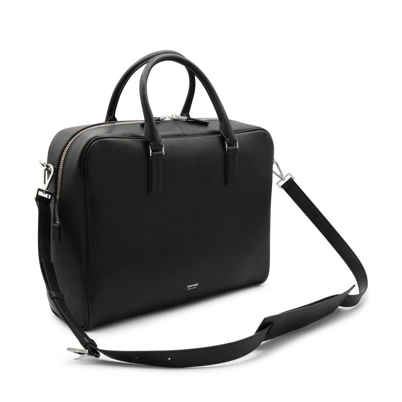 Black leather top handle bag from Tom Ford featuring top handles, removable strap, zip fastening, main compartment and gold tone logo.